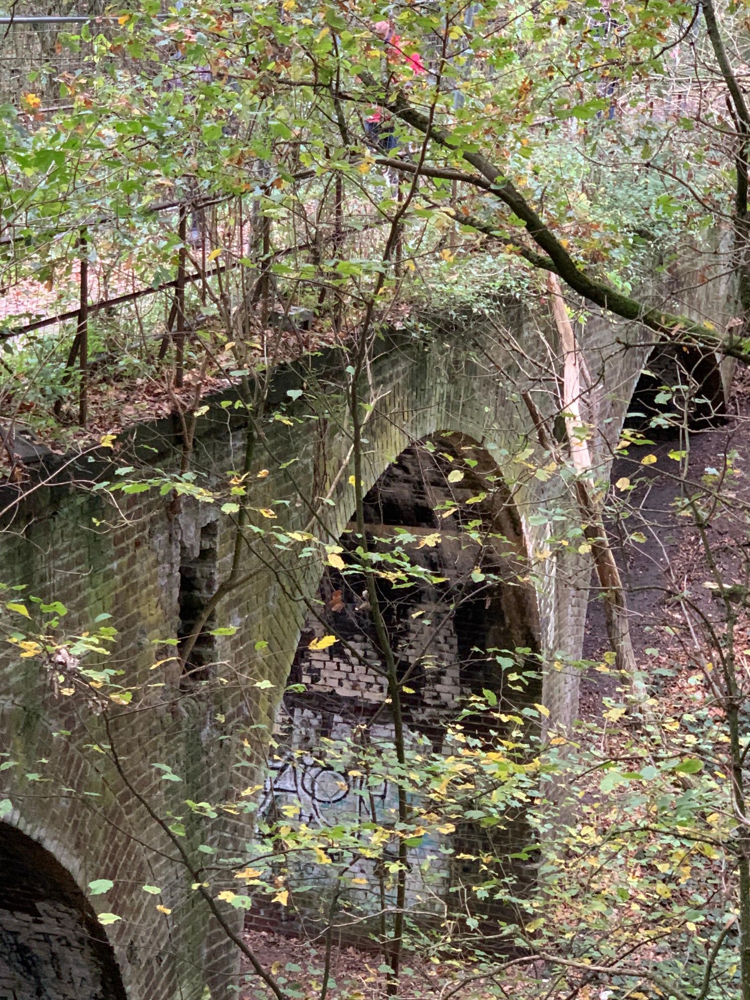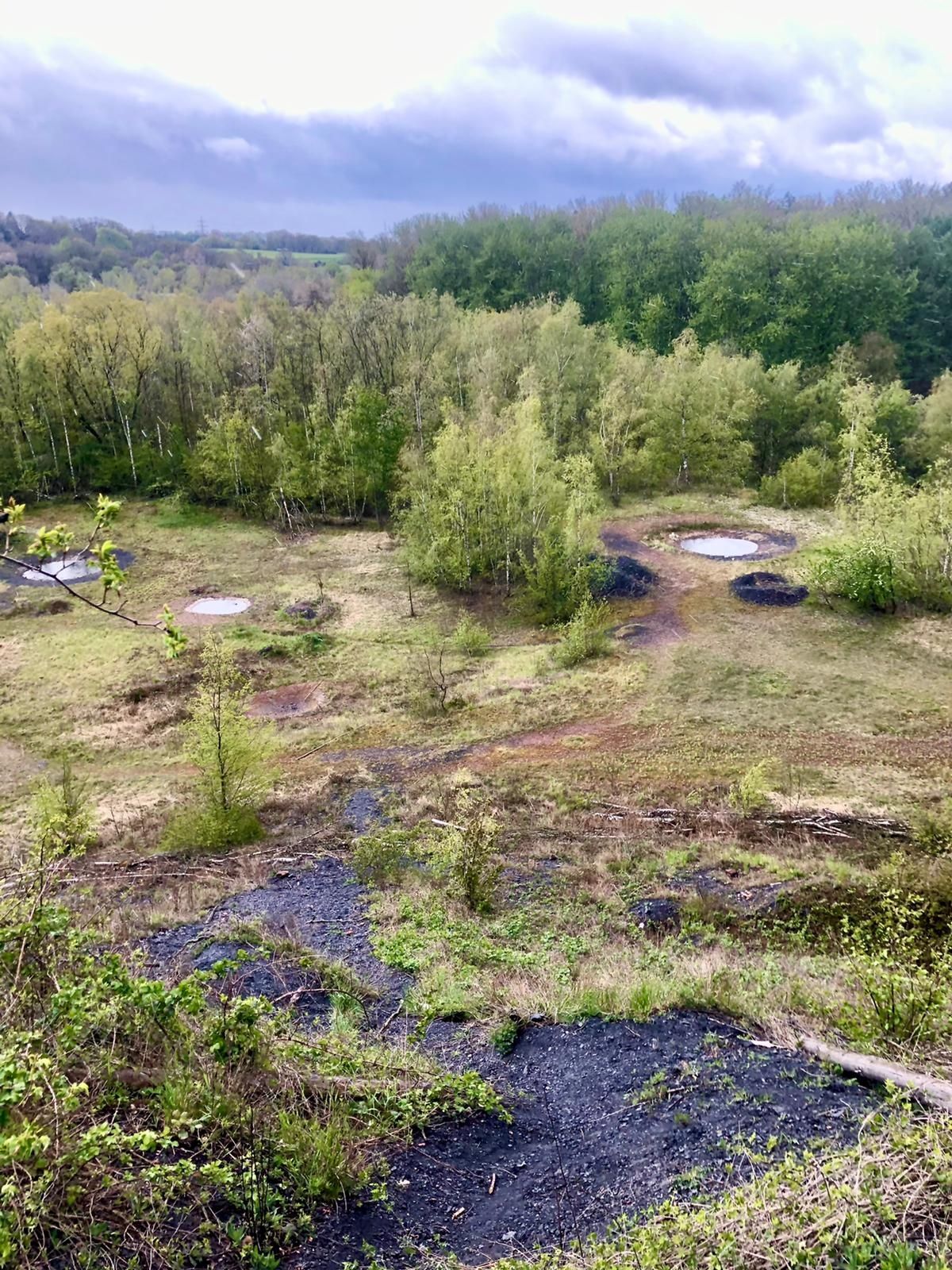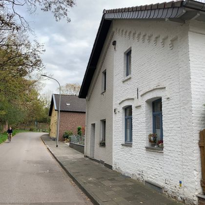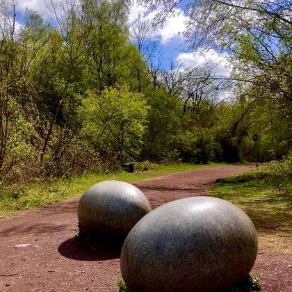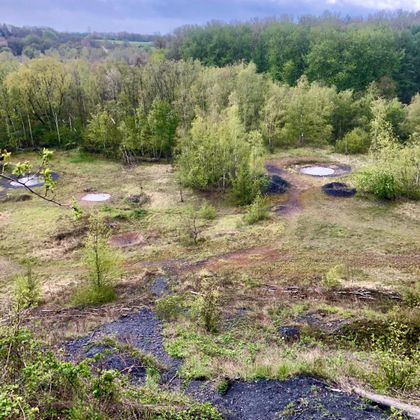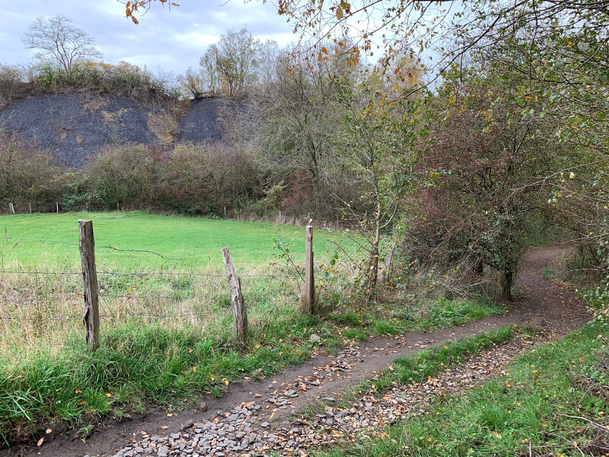 Bei dieser Feierabendrunde wandern wir auf den Spuren der Grube Gouley, von der erstmals 1599 die Rede ist. Bis zu 3.200 Menschen waren hier beschäftigt. 1969 machte die Grube dicht, eine alte Grubenbahn, eine Tafel am einstigen Förderturm, der 1994 gesprengt wurde, erinnern an sie. Unterwegs treffen wir auf Bergarbeitersiedlungen mit ihren charakteristischen Häuserreihen. Im Tal, direkt am Wegesrand, plätschert das Wasser aus dem von-Görschen-Stollen. Er war zunächst zur Förderung vorgesehen, später sorgte er für die Entwässerung der Grube und tut dies bis heute. Für den Kohletransport zur Brikettfabrik nach Kohlscheid gab es eine Bahnlinie. Unser Weg führt ein Stück auf dem Damm entlang, durch das Grün lugen die Überreste einer alten Bahnbrücke. Die Haldeder Grube ist ungewöhnlich, weil sie ins Tal an den Hang angeschüttet ist. Unterwegs und von einer Aussichtsplattform können wir einen Blick auf die schwarzen Abraumreste werfen. Im Gegensatz dazusteht die Landschaftsinstallation mit weißen „Dinosauriereiern“, die an die nahegelegene Kalkhalde einer vergangenen Sodafabrik erinnern.