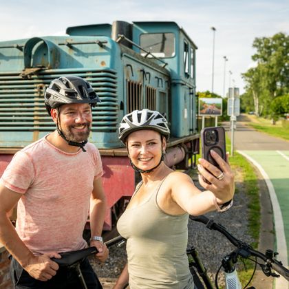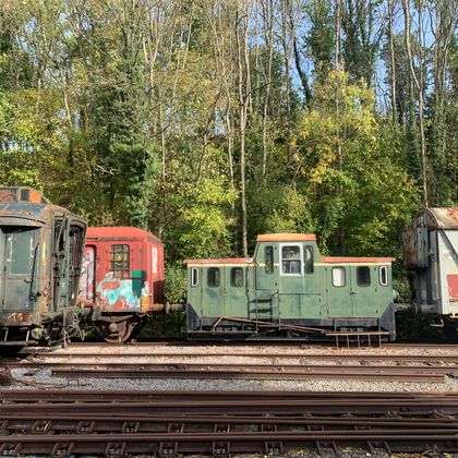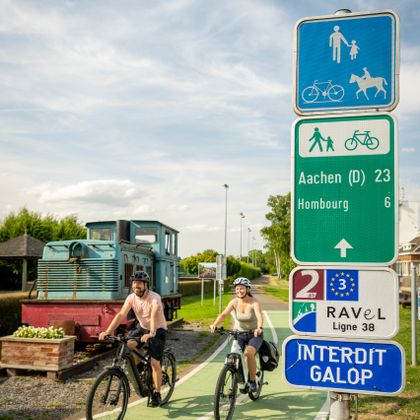 Hat man den Dreiländerpunkt erklommen, steht die Route im Zeichen der vergangenen Bahn. Unterwegs künden Bahnrelikte von den aktiven Zeiten des Personen- und Güterverkehrs, der seit 1986 stillgelegt ist. Am Bahnhof Hombourg erliegen wir dem morbiden Charme alter Waggons und in Aubel grüßt eine ausrangierte Lokomotive. In Herve vereint sich Bahnhofsgeschichte mit dem Schlemmerlandimage der Region. Im alten Bahnhofsgebäude erfährt man etwas über die Kulturlandschaft des Herver Lands mit seinen typischen Weiden, Hecken und Obstwiesen und hat Gelegenheit, die regionalen Produkte zu kosten. An „Genießer-Samstagen“ laden regionale Produzenten in Hombourg, Aubel und Herve zur Besichtigung und Verkostung von Käse, Bier, Sirup und Cidre ein, Sonntags lockt der regionale Wochenmarkt in Aubel.