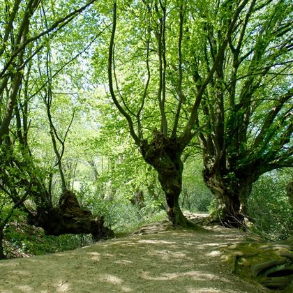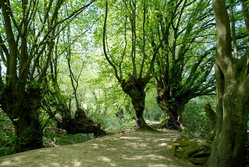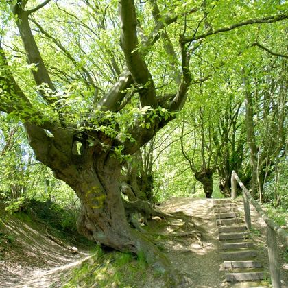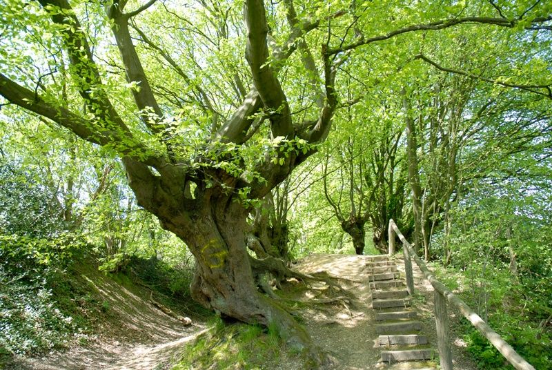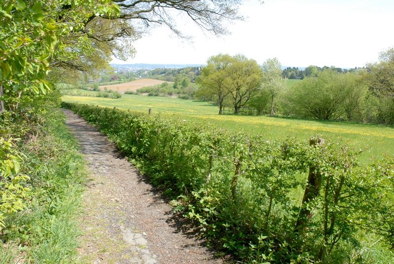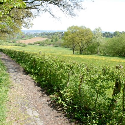 Auf einer Wegekreuzung mitten im Wald treffen historische und aktuelle Linien aufeinander: An den versteckten Grenzsteinen entlang des Weges identifizieren wir die heutige deutsch-belgische Grenze. Beim näheren Hinschauen kommt mit dem Landgraben eine noch viel ältere Grenzlinie hinzu. Mit einem Erdwall und einer dichten Buchenhecke sicherten die Aachener ab dem 14. Jh. die ländlichen Gebiete und den Wald außerhalb der Stadtmauern. Als die Stadt rundum mit der 70 Kilometer langen grünen Grenze befestigt war, markierte man sie ab 1611 mit Grenzsteinen mit eingemeißeltem Adler, dem Aachener Stadtwappen. Relikte vom Erdrücken, knorrige mächtige Buchen der einstigen Heckenlinie, die uns hier und später in einer idyllischen Hangpassage begegnen, ein Adlerstein und auch ein vormaliger Wachturm am Türmchen Beeck finden sich bis heute als Zeugen alter Grenzgeschichte auf unserer Wanderung.
