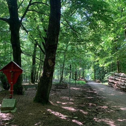 Der alte Bittweg von Aachen nach Moresnet-Chapelle, Teil des Jakobswegs, führt uns zum Königswald. Nachdem sich Aachen, Kelmis, Montzen und Moresnet hier ständig wegen gemeinschaftlicher Nutzungsrechte ins Gehege gekommen waren, unterstellte man das Gebiet 1615 als „Königswald“ der zuständigen Obrigkeit, den Herzögen von Burgund. Spezielle Grenzsteine tragen das Goldene Vlies oder das Andreaskreuz, Signets der damaligen Habsburger Herrscher.