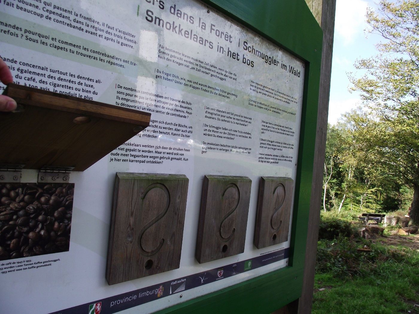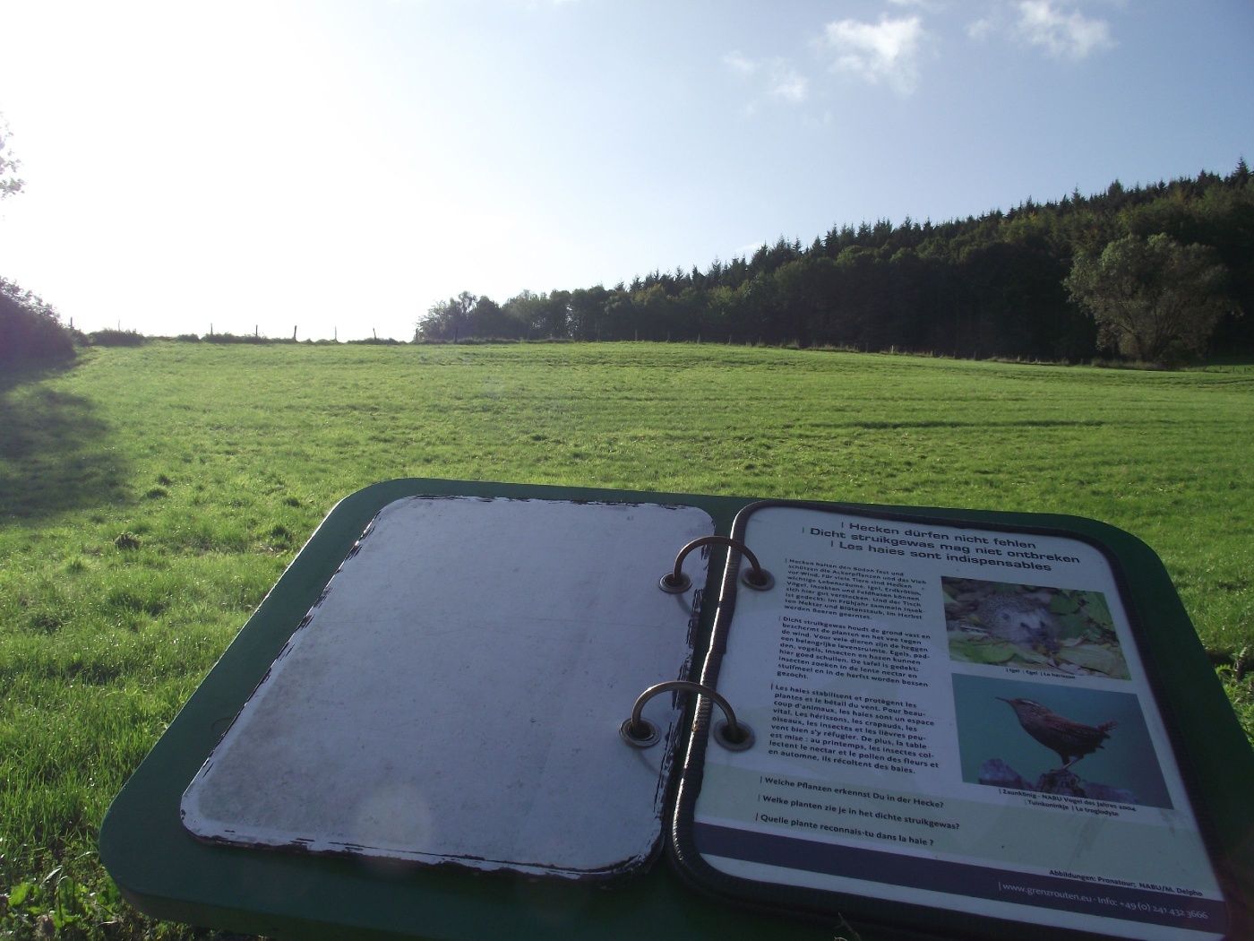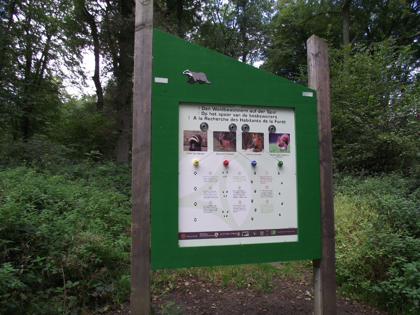 Wer dem Dachs-Symbol folgt, kann Spannendes und Wissenswertes rund um die Natur und Landschaft des Dreiländerecks erleben, genießen und erfahren. Die 4,4 Kilometern lange blaue Runde bietet Unterhaltung für Groß und Klein. Zwölf Entdecker-Stationen laden unterwegs zum Mitmachen und zum Naturerleben mit allen Sinnen ein: Auf dem Barfußpfad spürt man Natur hautnah, hat am Landschaftsfenster schnell den kompletten Durchblick und kann an der Grenzstation auf Holzstelzen durch zwei Länder gleichzeitig balancieren.