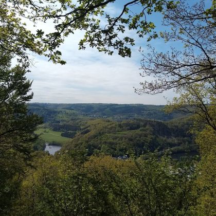 Die kurzweilige, aber anstiegsreiche Wanderung führt vom Heilsteinhaus auf die Anhöhe mit einer schönen Sicht über den Rursee weiter in die Hänge über Einruhr zum Aussichtspunkt "Jiescheckerdeeischelche". Der Panaoramablick belohnt den anstrengenden Anstieg.
