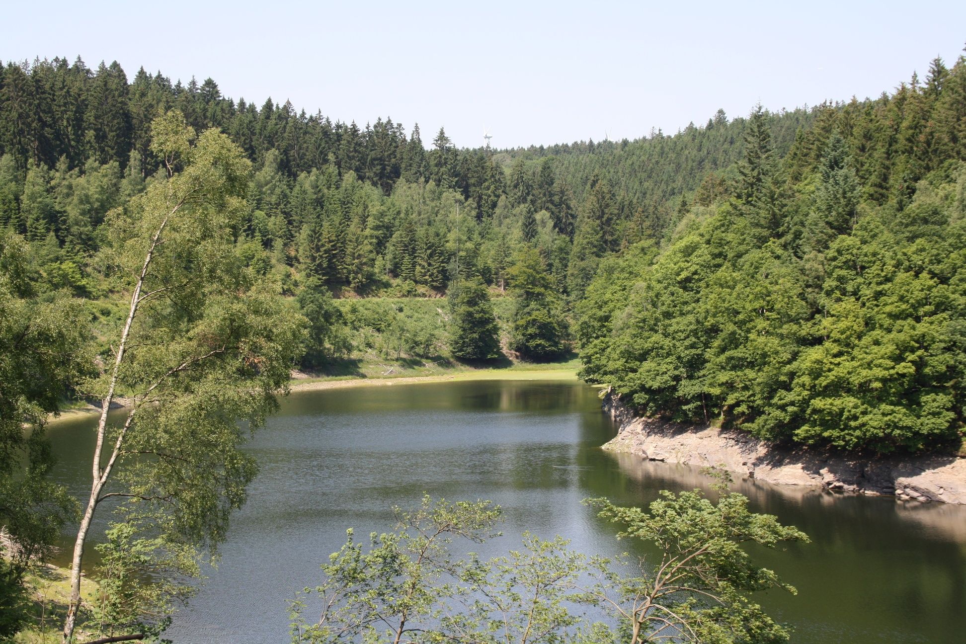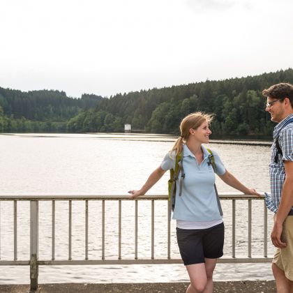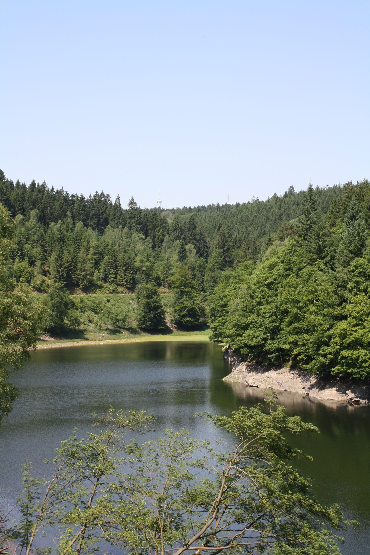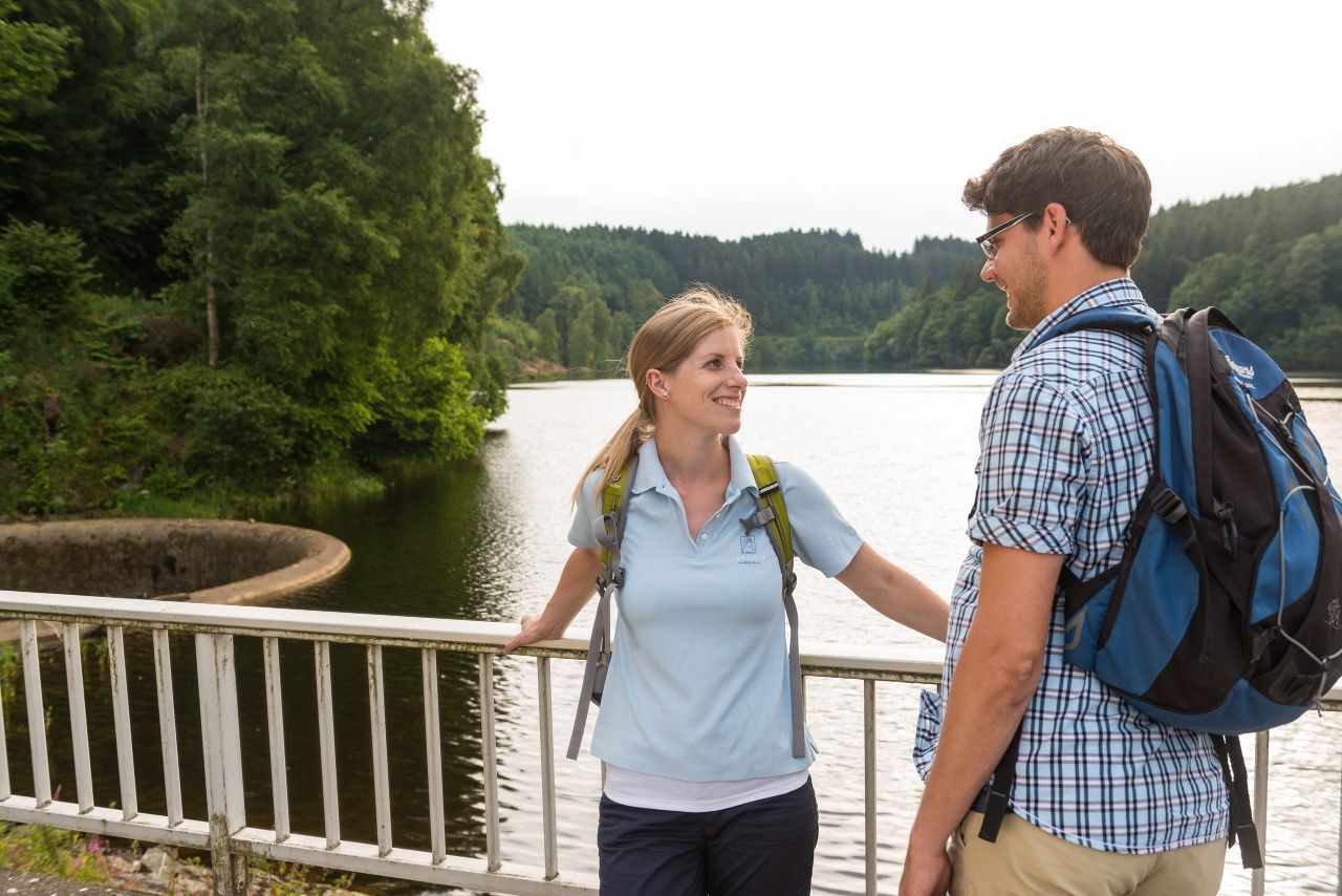 Der Weg taucht ein in den Simmerather Wald und schlängelt sich Richtung Kalltalsperre. Dabei treffen wir mit Kelzerbach und Saarcher Bach auf zwei für die Eifellandschaft typische quirlige Bäche. Nach wenigen Kilometern kommt dann die Kalltalsperre in Sicht und der Weg führt uns am Südufer der Talsperre entlang.