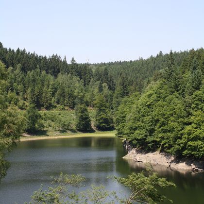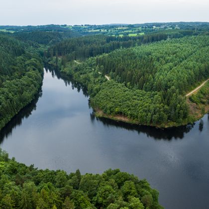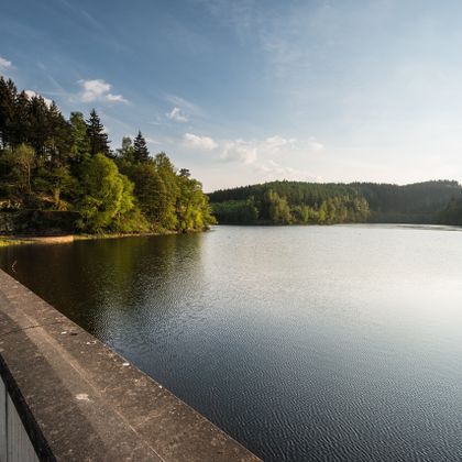 Die Strecke knickt nach Süden ab und wir verlassen die Waldgebiete rund um die Talsperre, um in die Feld- und Wiesenlandschaft östlich von Lammersdorf einzutauchen. Über einen weiten Bogen führt die Strecke schließlich zurück zum Ausgangspunkt nach Lammersdorf.