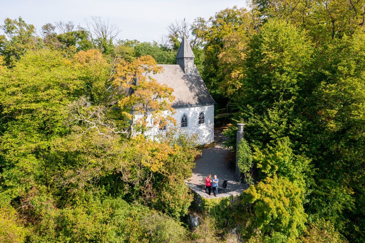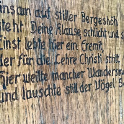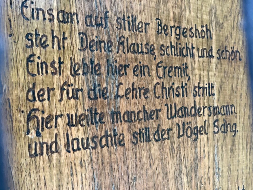 Ist die Klause erreicht, genießen wir den Blick ins Tal, sonntags gibt’s hier Kaffee und Marmorkuchen. Im Anbau neben der Kapelle Maria im Schnee befand sich bis 1904 die Eremiten-Wohnung. Der Name des vermutlich Ersten unter ihnen, Frère Toma Larondel, prangt über der Kapellentür, er zog 1658 hier ein.