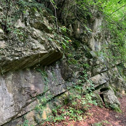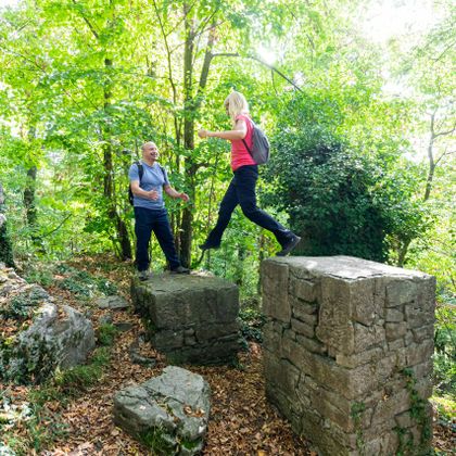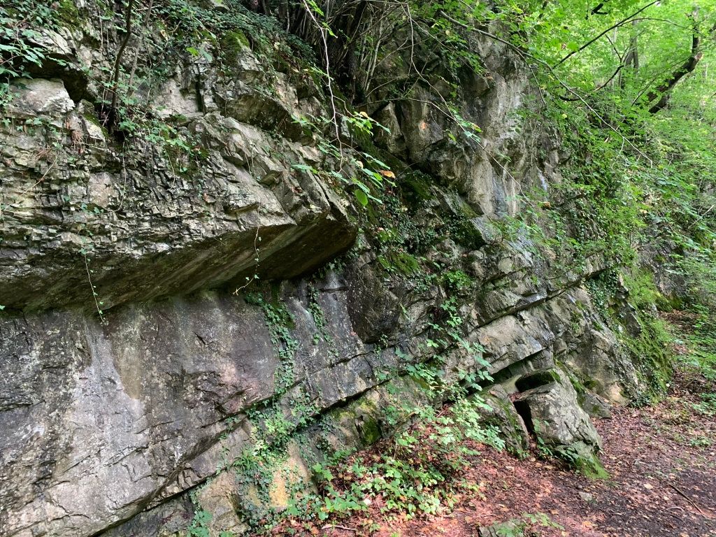 Der Rückzug will erklommen werden. Unser Ziel, die Klause, liegt auf einem Felssporn aus Kalkgestein durch das sich die Inde in Jahrmillionen gegraben hat. Im Tal am Indedurchbruch treten die imposant gefalteten Kalkschichten zutage. Den Kalk der Region hatten sich schon Kelten und Römer zunutze gemacht. Zum größeren Abbau kam es im Zuge der Industrialisierung im 19. Jh., er fand im Bau zur Zementherstellung, in der Stahlproduktion oder auch als Düngemittel Verwendung. Der Kalkofen Bilstermühle auf unserem Weg war von 1870 bis ins 20. Jh. in Betrieb.