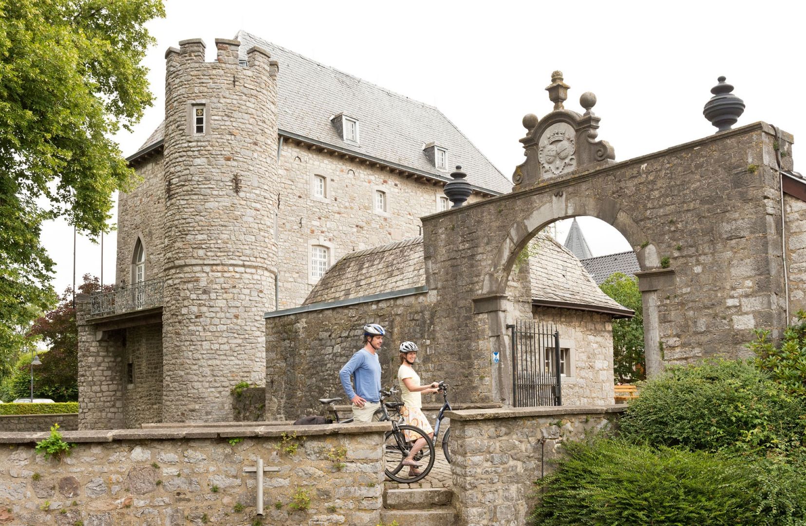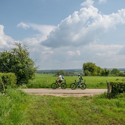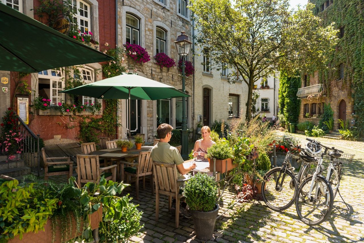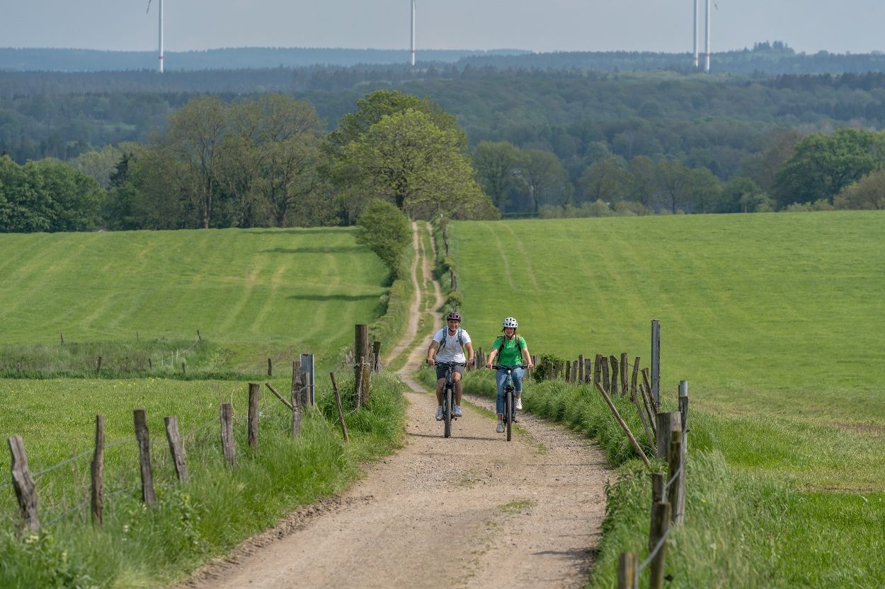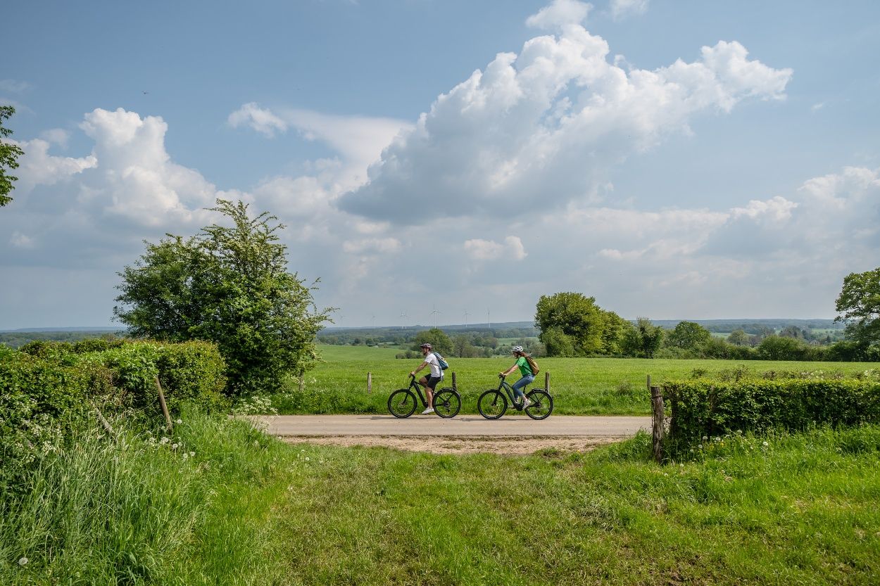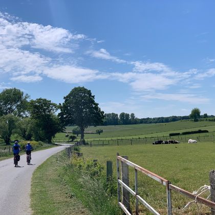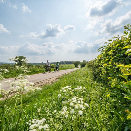 Von Ländergrenzen unbeirrt breitet sich eine sanft ansteigende Bilderbuchlandschaft mit weitem Weiden- und Heckenland vor uns aus. Unterwegs treffen wir auf idyllische Dörfer, Kleinstsiedlungen, Einzelhöfe und kleine Burganlagen aus Bruchstein und Blaustein, dem man in den hiesigen Steinbrüchen ebenso grenzüberschreitend begegnet. Beim Radeln folgen wir der Kinkebahn, einem alten Handelsweg zwischen Eupen, Walhorn und Kornelimünster, den wahrscheinlich schon die Kelten nutzten und den die Römer, die in Kornelimünster eine Kultstätte namens Varnenum betrieben, weiter ausbauten. Der großflächige Laubwald, der einst die Region bedeckte, war spätestens bis zum Ende des Mittelalters, für Ackerbau und Holzwirtschaft gerodet. Für die Urbachmachung des Landes waren die Herzöge von Limburg im Eupener Land, die Abtei Kornelimünster im Münsterländchen die treibenden Kräfte. Zu den großen Holzabnehmern zählten das Eisenhütten- und Töpfereigewerbe, wie in Raeren, wo überregional bedeutsames Steinzeug gefertigt wurde. In der ehemaligen Burg ist heute ein renommiertes Töpfereimuseum beheimatet. Zum Butterländchen und Lieferanten für Milch und Fleisch wurde die Region Mitte des 19. Jhs., als die Nachfrage aus den anwachsenden Städten stieg und sich die Landschaft allmählich zur charakteristischen Weidelandschaft mit ihren alten Heckenparzellen wandelte. Auf unserer Route können wir bei diversen Höfen Milch tanken und passieren die Molkerei in Walhorn.