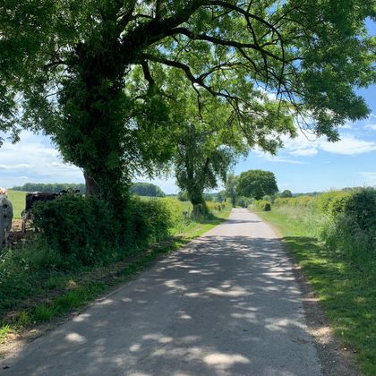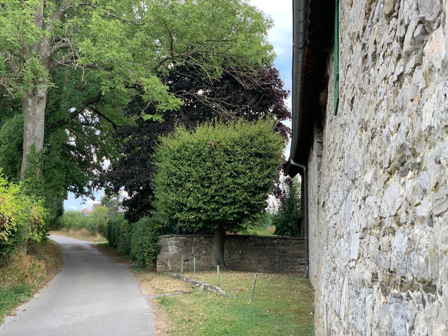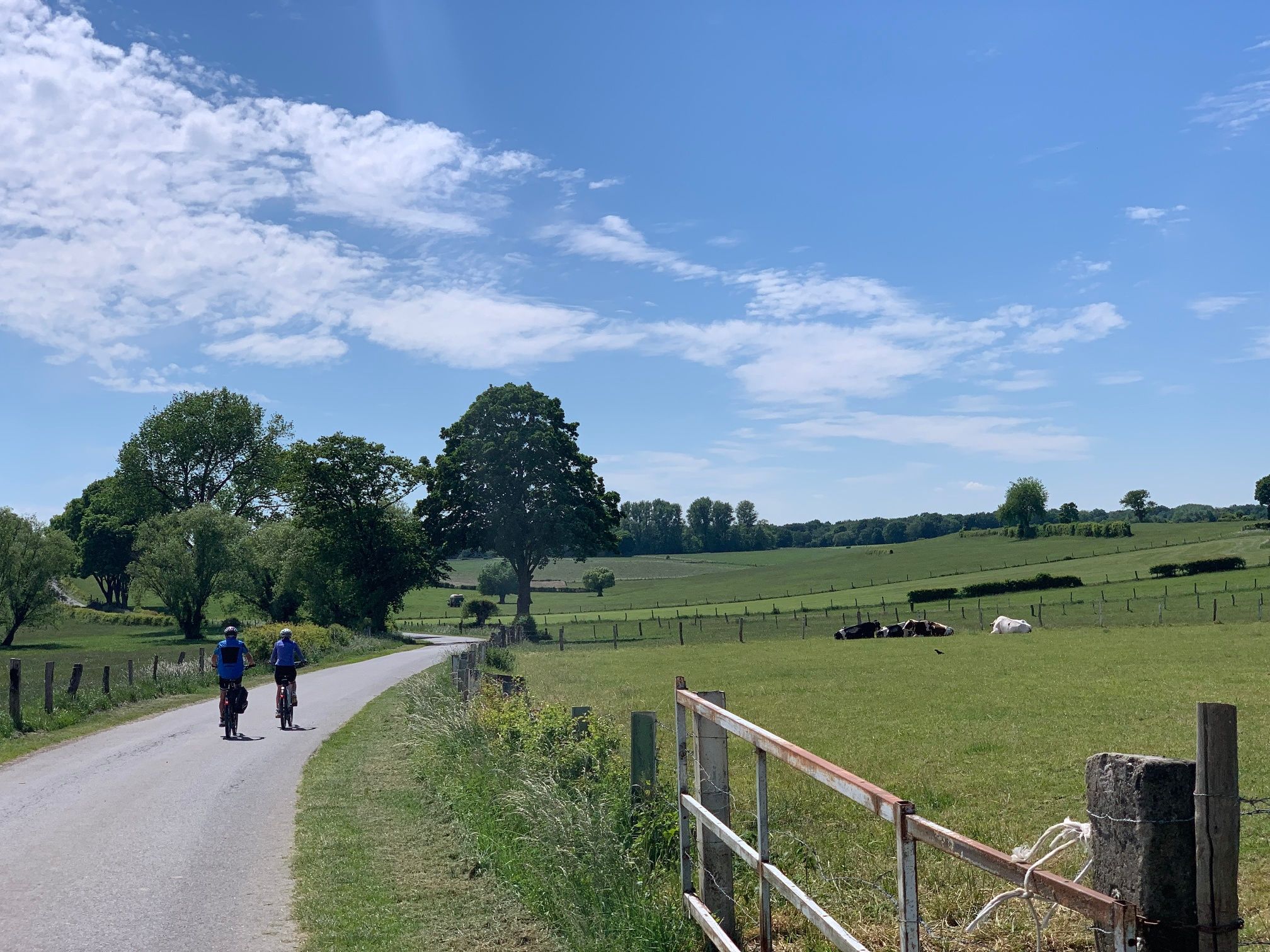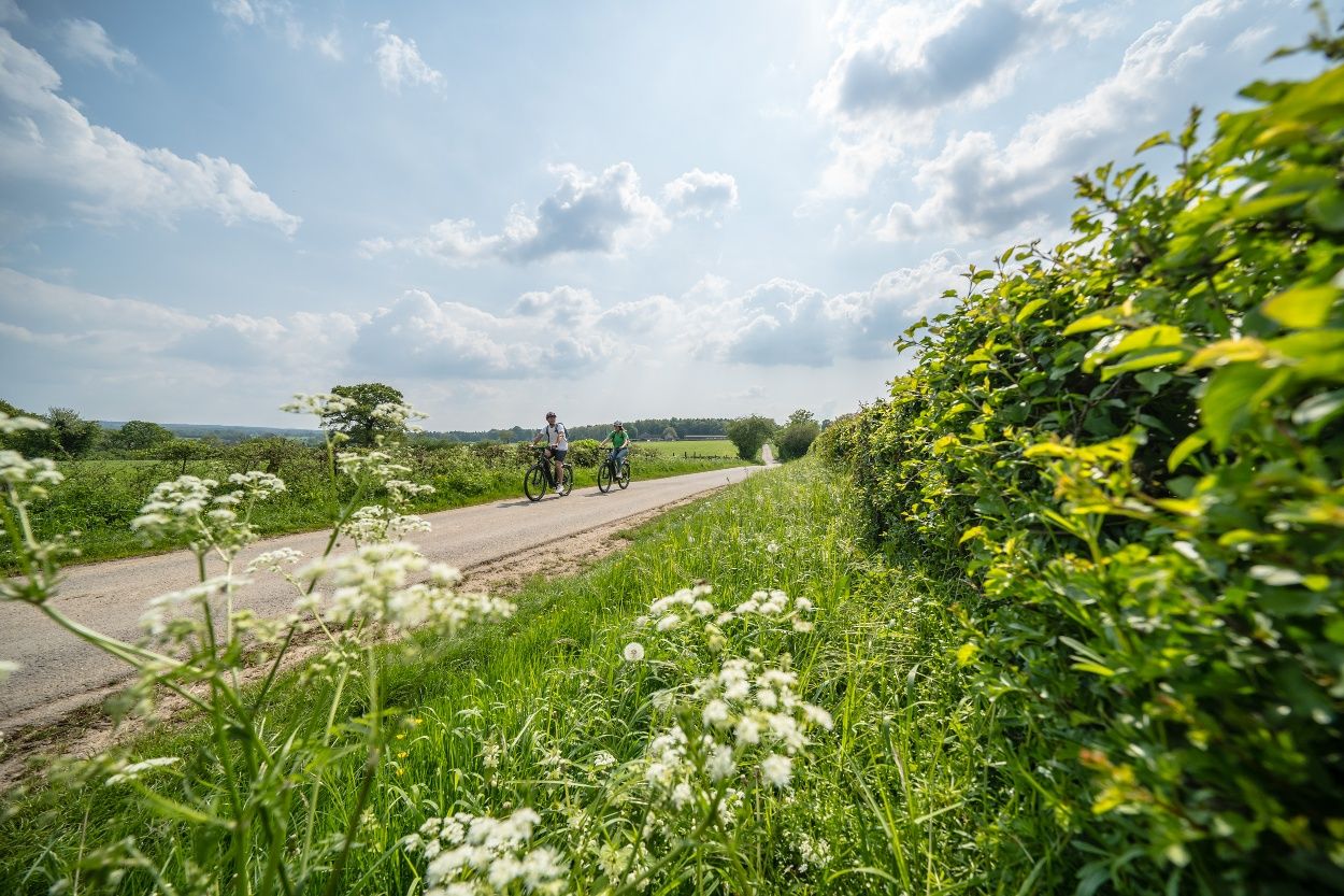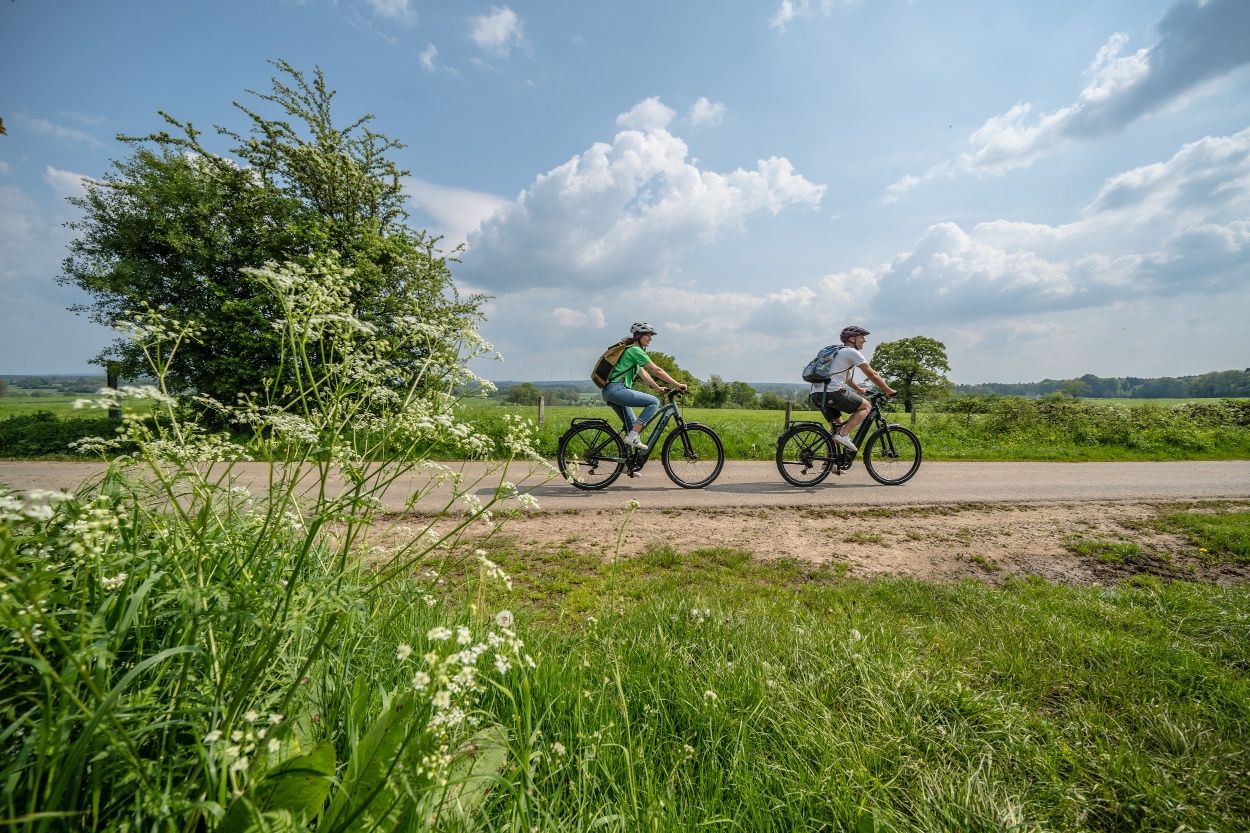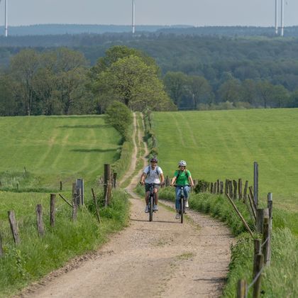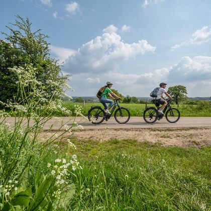 Von Ländergrenzen unbeirrt breitet sich eine sanft ansteigende Bilderbuchlandschaft mit weitem Weiden- und Heckenland vor uns aus. Unterwegs treffen wir auf idyllische Dörfer, Kleinstsiedlungen, Einzelhöfe und kleine Burganlagen aus Bruchstein und Blaustein, dem man in den hiesigen Steinbrüchen ebenso grenzüberschreitend begegnet. Beim Radeln folgen wir der Kinkebahn, einem alten Handelsweg zwischen Eupen, Walhorn und Kornelimünster, den wahrscheinlich schon die Kelten nutzten und den die Römer, die in Kornelimünster eine Kultstätte namens Varnenum betrieben, weiter ausbauten. Der großflächige Laubwald, der einst die Region bedeckte, war spätestens bis zum Ende des Mittelalters, für Ackerbau und Holzwirtschaft gerodet. Für die Urbachmachung des Landes waren die Herzöge von Limburg im Eupener Land, die Abtei Kornelimünster im Münsterländchen die treibenden Kräfte. Zu den großen Holzabnehmern zählten das Eisenhütten- und Töpfereigewerbe, wie in Raeren, wo überregional bedeutsames Steinzeug gefertigt wurde. In der ehemaligen Burg ist heute ein renommiertes Töpfereimuseum beheimatet. Zum Butterländchen und Lieferanten für Milch und Fleisch wurde die Region Mitte des 19. Jhs., als die Nachfrage aus den anwachsenden Städten stieg und sich die Landschaft allmählich zur charakteristischen Weidelandschaft mit ihren alten Heckenparzellen wandelte. Auf unserer Route können wir bei diversen Höfen Milch tanken und passieren die Molkerei in Walhorn.