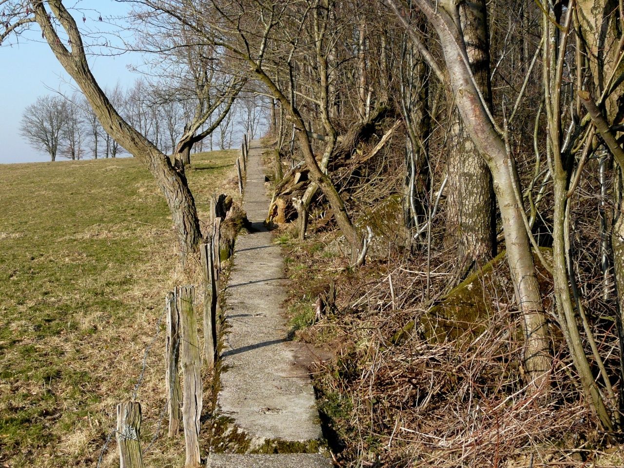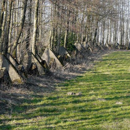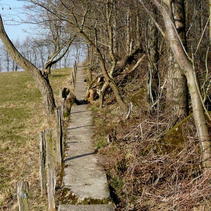 Kurz darauf treffen Sie auf die 1938 als Panzersperre errichtete Höckerlinie des insgesamt 630 Kilometer langen „Westwalles“, zu dem auch der Bunker gehörte. Der Wanderweg führt ca. 500 Meter über den Rand des Fundaments. Im Lauf der Zeit sind innerhalb der betonumfassten Flächen kleine Biotope entstanden. Es gibt nur wenige Stellen in der Umgebung Imgenbroichs, die einen so großartigen Blick gen Westen bieten. Fast den gesamten Vennrand des Monschauer Landes gibt es zu bestaunen, vom Pannensterzkopf (660 m) bei Kalterherberg zur Linken über den Steling (659 m) oberhalb von Mützenich bis zu den westlichen Ausläufern des Hoscheit (599 m) bei Lammersdorf.