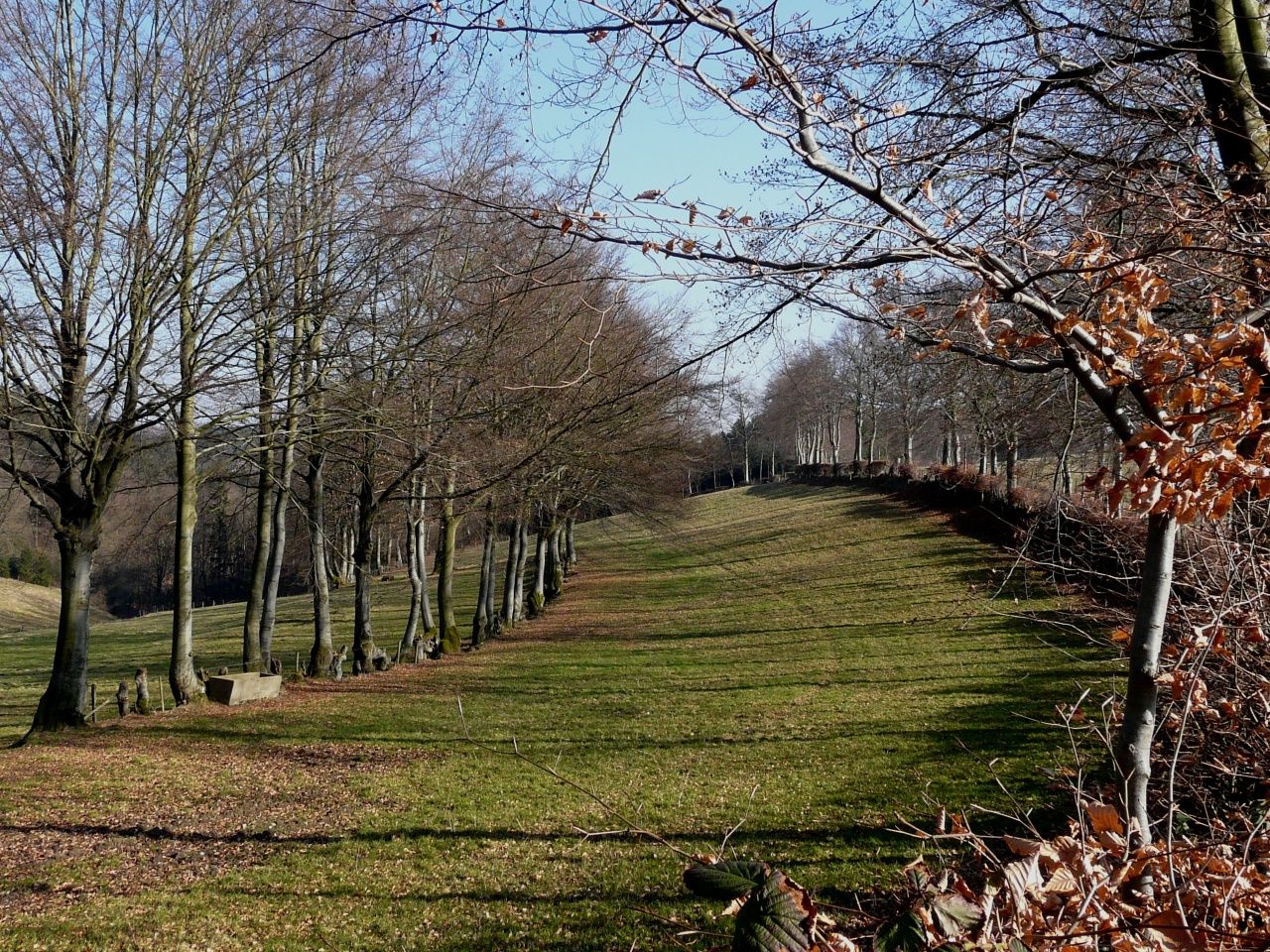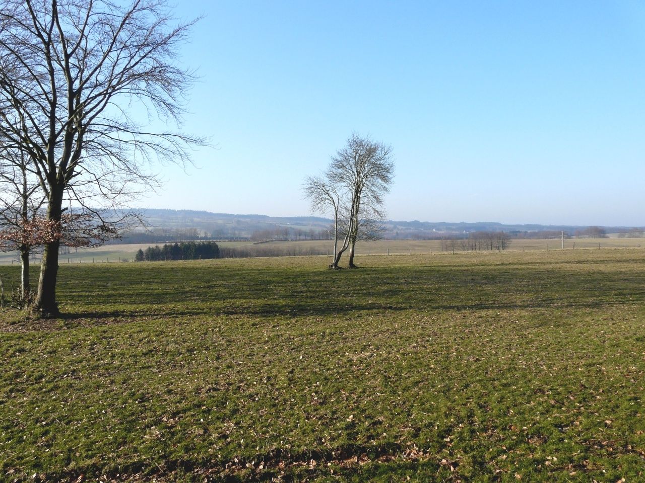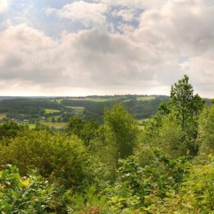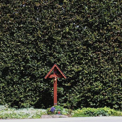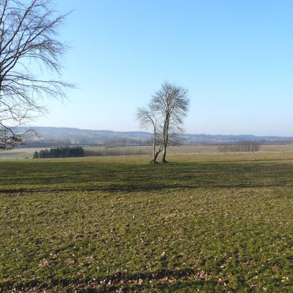 Nachdem Sie das Quellgebiet eines Baches durchquert haben, biegt der Wanderweg links in einen romantischen Pfad ein. Von Hecken begrenzte Hangweiden, ein rasch an Tiefe gewinnendes Tal, lauschige Waldränder und abwechslungsreiche Waldpassagen prägen seinen Charakter. Am östlichsten Punkt unserer Wanderung lohnt es sich, eine kurze Rast einzulegen. Vom dortigen „Eifel-Blick“ gleich neben der Schutzhütte aus bietet sich eine herrliche Sicht auf das Rurtal, die Orte Widdau und Rohren sowie auf das ausgedehnte Waldgebiet des Nationalparks Eifel am Horizont. Über einen mittelschweren Anstieg gelangen Sie erneut zum Waldrand. Unterhalb der Kreisstraße 21 steht zwischen zwei mächtigen Laubbäumen ein Wegekreuz. Es erinnert an drei Frauen und einen Mann, die während der heftigen Kämpfe des 2. Weltkrieges hier durch explodierende Granaten getötet wurde.