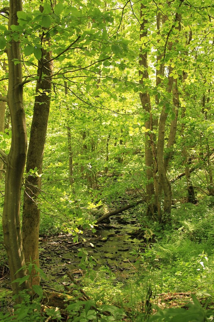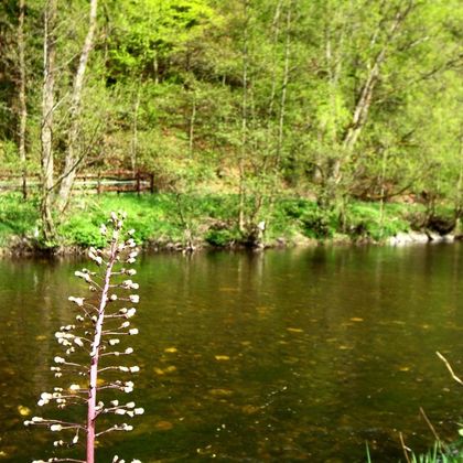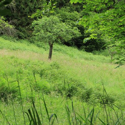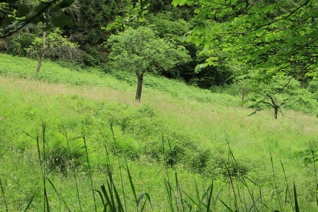 Der verschlungene Pfad durch das Riffelsbachtal führt an einer ehemaligen Streuobstwiese vorbei. Auch wenn das Grundstück längst verwildert und von der Natur zurückerobert ist, kann man noch gut erkennen, dass hier früher – wie im ganzen Rurtal verbreitet – leckeres Obst geerntet wurde. Die kleinen Fischteiche, die sich dort noch vor einiger Zeit befunden haben, sind dagegen gänzlich verschwunden.