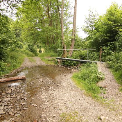 Kurz vor dem Ende der Rundtour ist eine Furt und ein Hohlweg zu erkennen. Was wir heute als urigen Wanderweg erleben, war früher eine wichtige Transportroute. Durch die jahrhundertelange Nutzung mit Fuhrwerken und Vieh hat sich der Weg tief ins Erdreich geschnitten. Dort, wo früher schwere Karren an der Furt durch das Bachbett gezogen werden mussten, erleichtert heute eine kleine Brücke dem Wanderer die Querung bevor wir kurz darauf wieder an unseren Ausgangspunkt, dem Campingplatz Hammer, zurückkehren.
