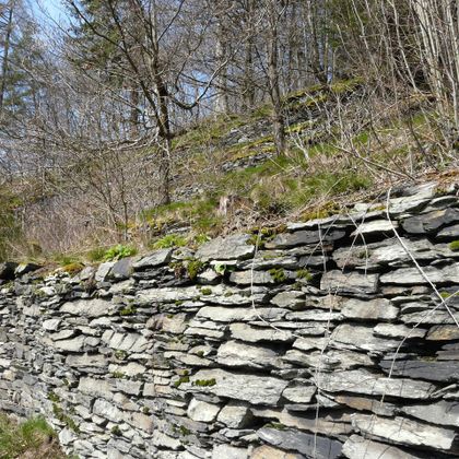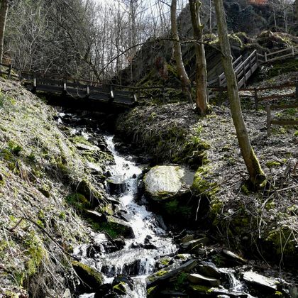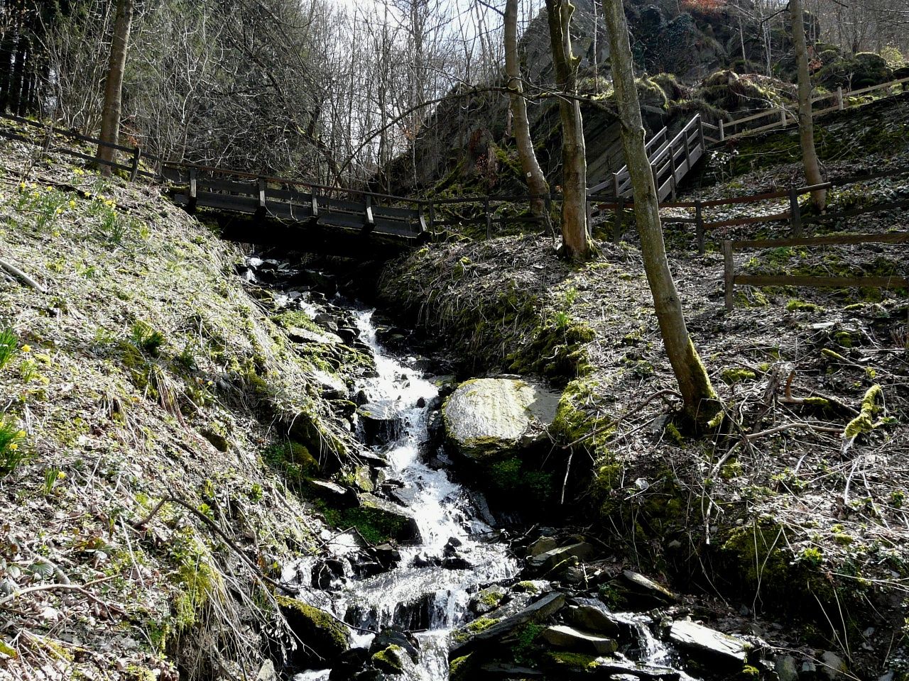 Gleich hinter der Schlosskapelle beginnt der Abstieg. Das „Haus im Turm“ am Ende der Stadtstraße hat als einziges Gebäude die Zerstörung der Stadt im Jahr 1543 unbeschadet überstanden. Nach der Überquerung der Rur gelangt man in den Stadtpark mit der Antoniuskapelle. Von dort führt ein steiler Pfad durch eine beeindruckende Naturszenerie mit einem wilden Gebirgsbach und mächtigen Felsen.