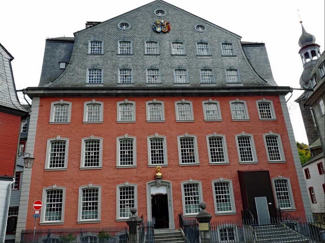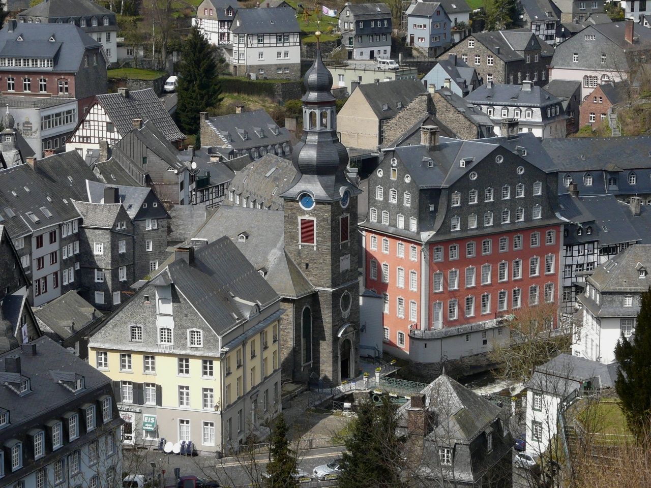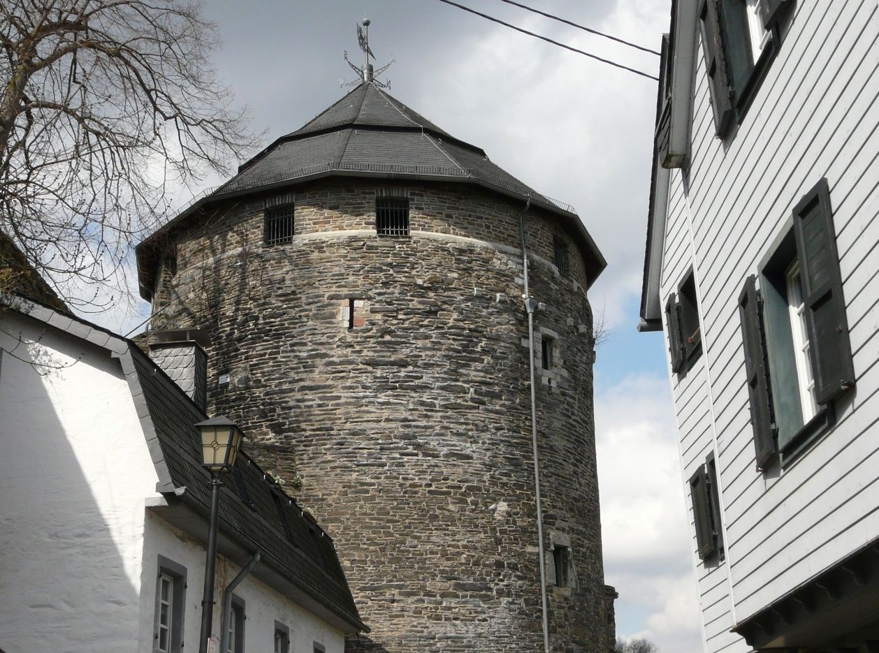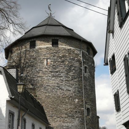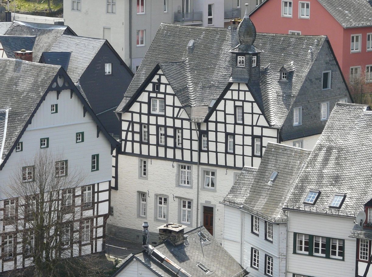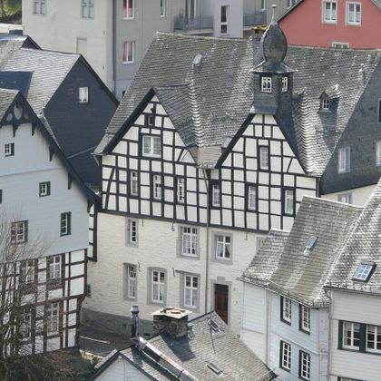 Vom Wanderparkplatz aus führt der Weg zunächst zur Rur hinab. Nach der Überquerung des Flusses geht es hinauf zum Rahmenberg und schließlich durch Stehlings und Kirchstraße mit ihren historischen Gebäuden. Das Rote Haus sowie das alte Rathaus mit dem Zwiebeltürmchen, das bereits vom Haller aus zu sehen war, sind nicht zu verfehlen.