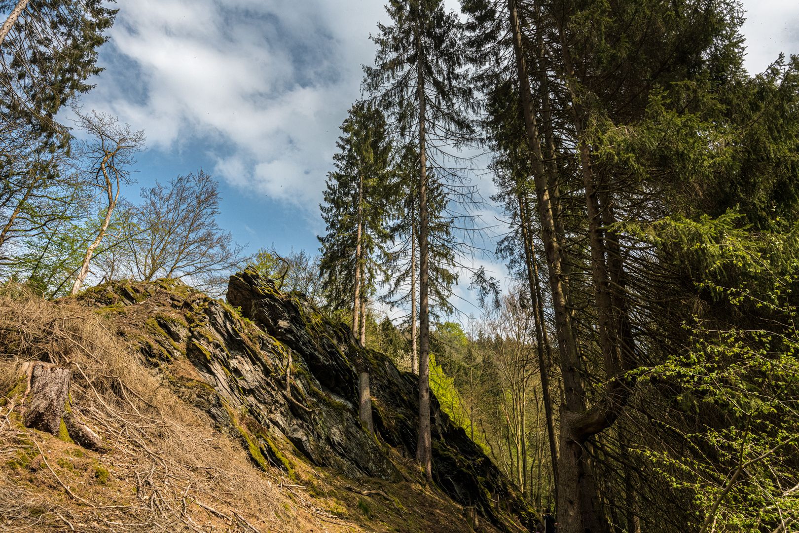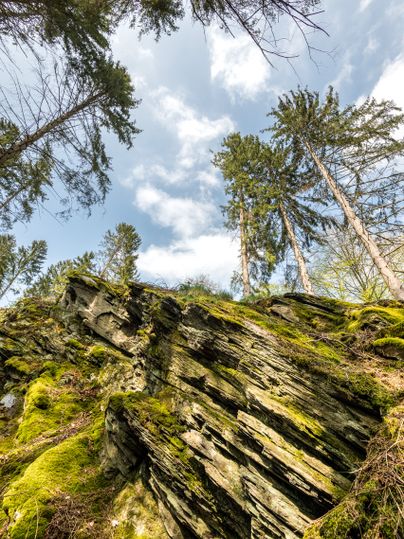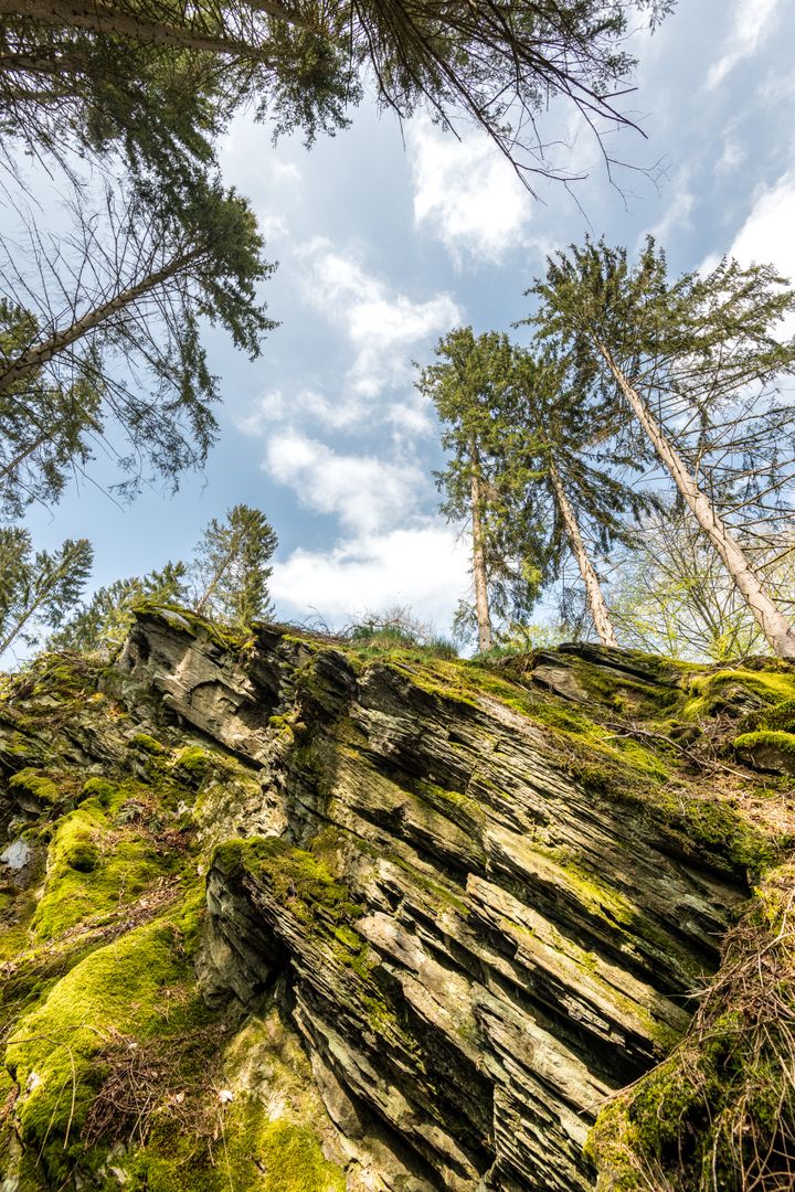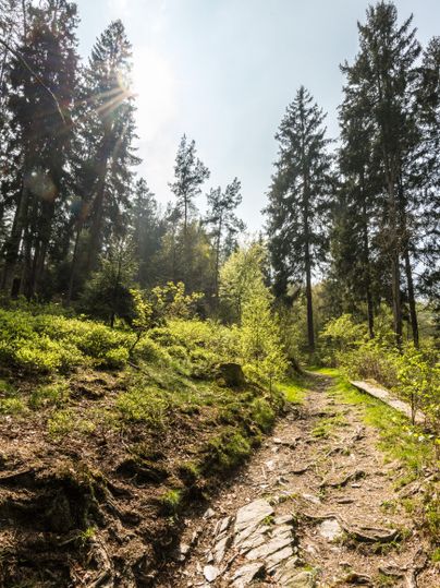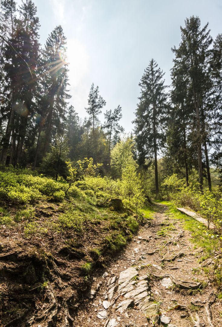 Wer verwunschene Pfade durch eine urwüchsige Natur, herrliche Fernsichten und zahlreiche Sehenswürdigkeiten aus fünf Jahrhunderten liebt, der kommt bei dieser Wanderung voll auf seine Kosten. Vom Wanderparkplatz aus führt der Weg zunächst nach Osten durch das Wohngebiet „Am Weiher“. An Spielplatz, Schule und Kindergarten vorbei gelangen Sie in das Imgenbroicher Heckenland mit seinen mächtigen Buchen. Vor dem Tränkhof führt nach rechts ein romantischer Pfad hinab ins Belgenbachtal. Wohltuende Stille umfängt dort den Wanderer. Der mit Birken und Erlen bestandene Talgrund mit dem munter dahinplätschernden Bach ist ein Paradies für zahlreiche Tier und Pflanzenarten und wie geschaffen für ein befreites Aufatmen. Gleich hinter dem ehemaligen Mühlenteich durchstößt ein uralter Weg den mächtigen Schieferfels. Zahllose Fuhrwerke mit eisenbeschlagenen Rädern haben seit dem Mittelalter einen der besterhaltenen historischen Wege des Monschauer Landes geschaffen. Ziel ihrer Fahrt war die Belgenbacher Mühle. Sie wurde zwischen 1550 und 1560 als „Bei-Mühle“ zur bereits 1306 erwähnten, weiter talaufwärts gelegenen ersten Mühle im Belgenbachtal errichtet, von der leider nichts mehr zu sehen ist. Das erste Stück des ansteigenden Weges beschert nochmals einige historische Karrenspuren. Über einen Waldweg, der sich am Hang entlang windet, erreichen Sie die nächste Attraktion: den „Eifel-Blick“ hoch über dem Tal der Rur. Er bietet eine großartige Aussicht auf Widdau zur linken und weiter über Rohren bis Höfen.