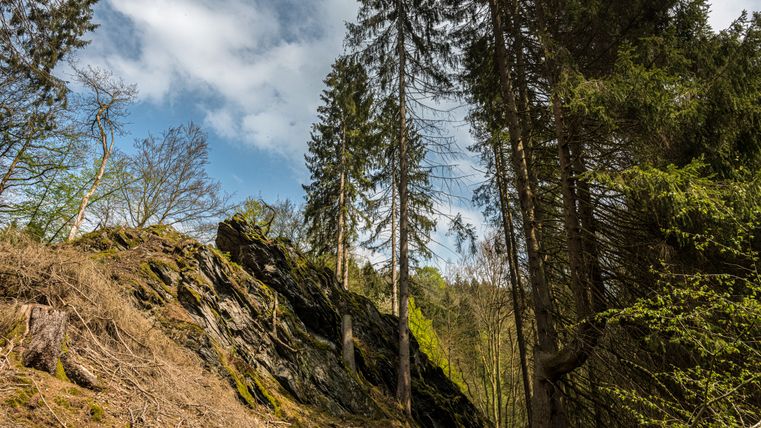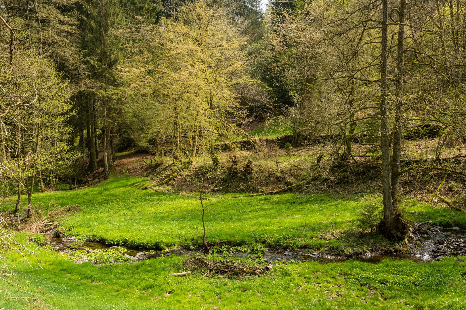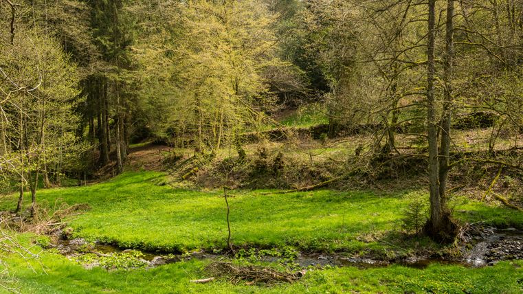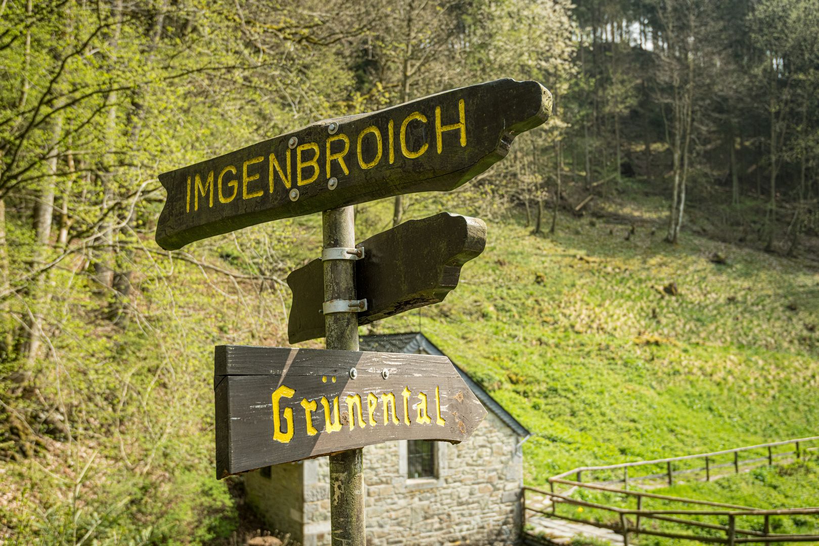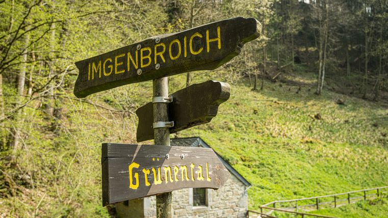Nach einem kurzen Anstieg führt der Weg zunächst am Waldrand vorbei. Südlich der K 21 lädt ein Kreuz zum Gedenken an vier Imgenbroicher Einwohner ein, die dort während der heftigen Kämpfe des 2. Weltkrieges getötet wurden.Weitere Relikte jener unseligen Zeit sind die Schützengräben, die Sie beim Aufstieg durch den Fichtenwald passieren. Durch das schmucke Wohngebiet „Belgenbacher Weg“ gelangen Sie nach der Überquerung der Grünentalstraße in die südliche Wiesenlandschaft Imgenbroichs. Der kleine Ort Menzerath überrascht mit einem weiteren kulturellen Highlight. Hinter einer hohen Bruchsteinmauer verbirgt sich ein alter Friedhof mit imposanten Grabsteinen. Neben Geistlichen der vangelischen Gemeinde fanden zahlreiche Angehörige der Imgenbroicher und Monschauer Tuchmacherfamilien hier zwischen 1678 und 1862 ihre letzte Ruhestätte. Nach der Überquerung des Eschbachs und vorbei an der Jugendherberge Hargard erreichen Sie jenseits der B 258 das für die Region typische Heckenland. Die 1,4 Kilometer kurze Schleife westlich des Ortes bietet zum Abschluss der Wanderung erneut einige Besonderheiten. Vor einer mit mächtigen Bäumen eingerahmten Parzelle erinnert ein Steinkreuz an den Friedhof Walchenau, zwischen 1600 und 1794 die erste Begräbnisstätte der Lutheraner und Reformierten im Monschauer Land. Am westlichsten Punkt der Route treffen Sie erneut auf ein Relikt des 2. Weltkrieges: die als Panzersperre errichtete „Höckerlinien“ des „Westwalls“. Doch die rund 500 Meter lange Strecke über den Rand des Fundaments bietet mehr als ein Überbleibsel aus jener unseligen Zeit. Wo ursprünglich das Verderben lauerte, sind inzwischen wertvolle Biotope entstanden.