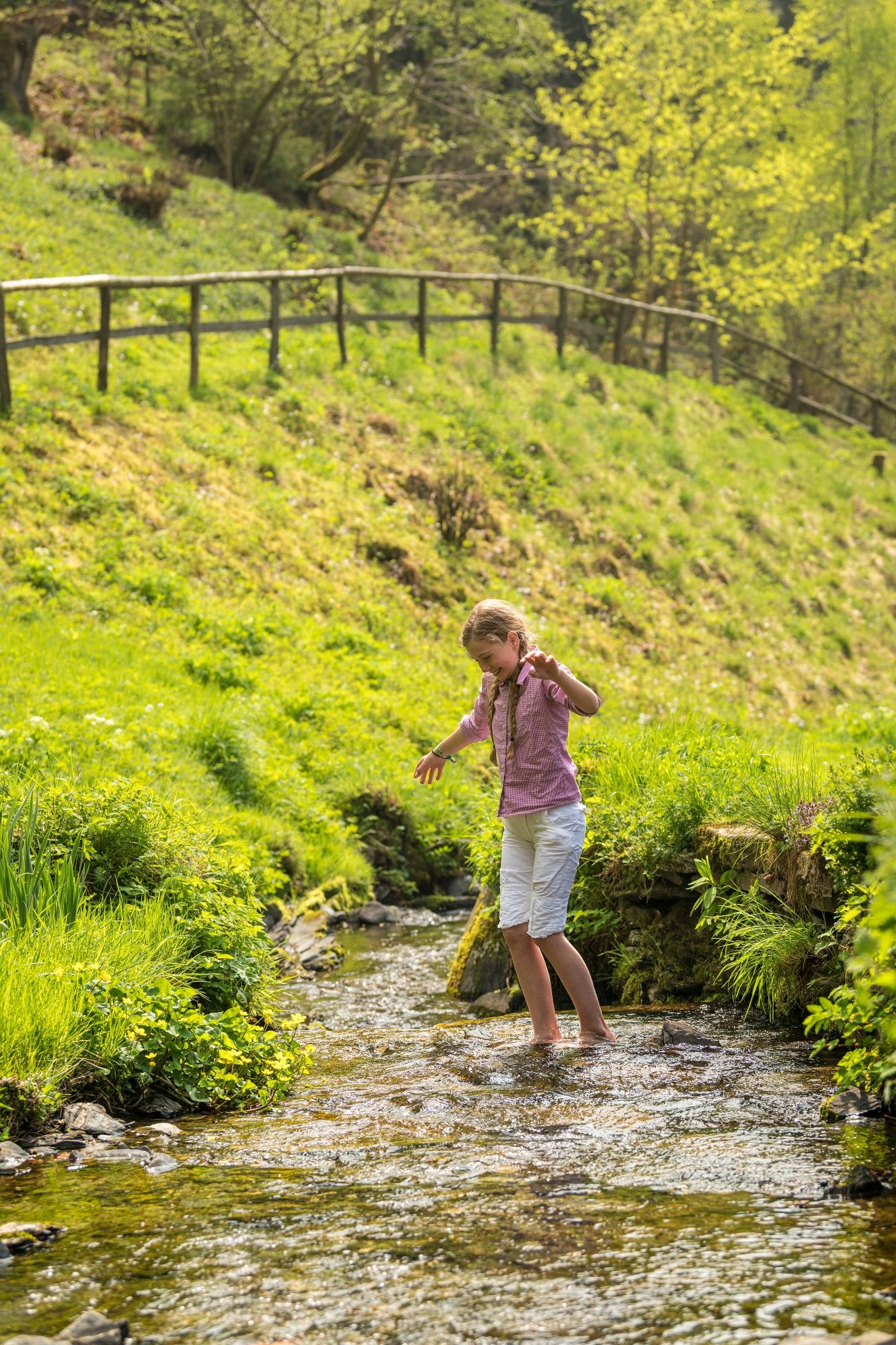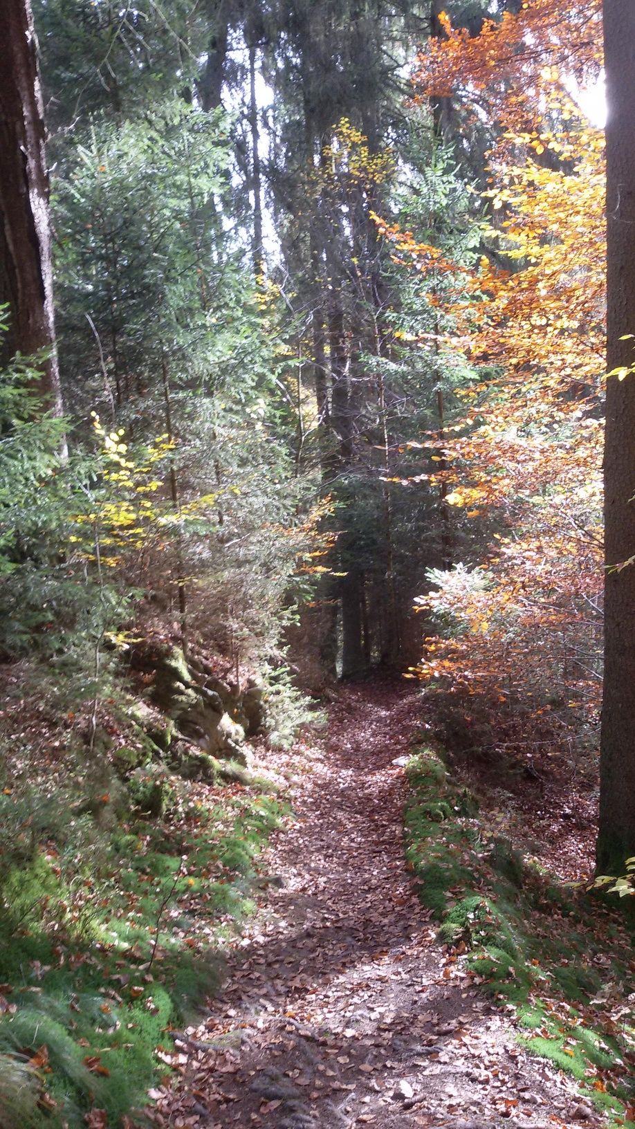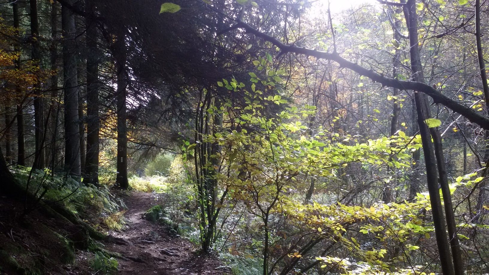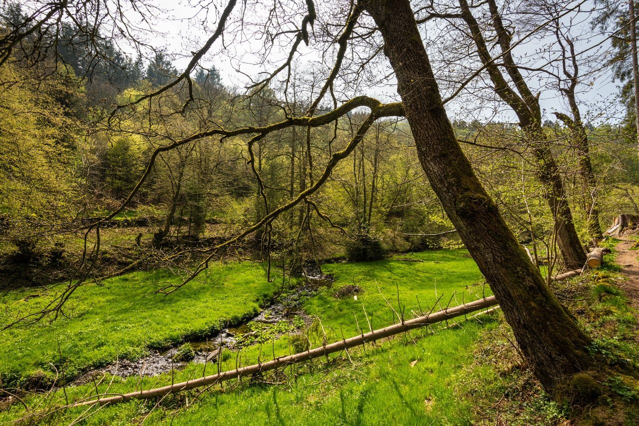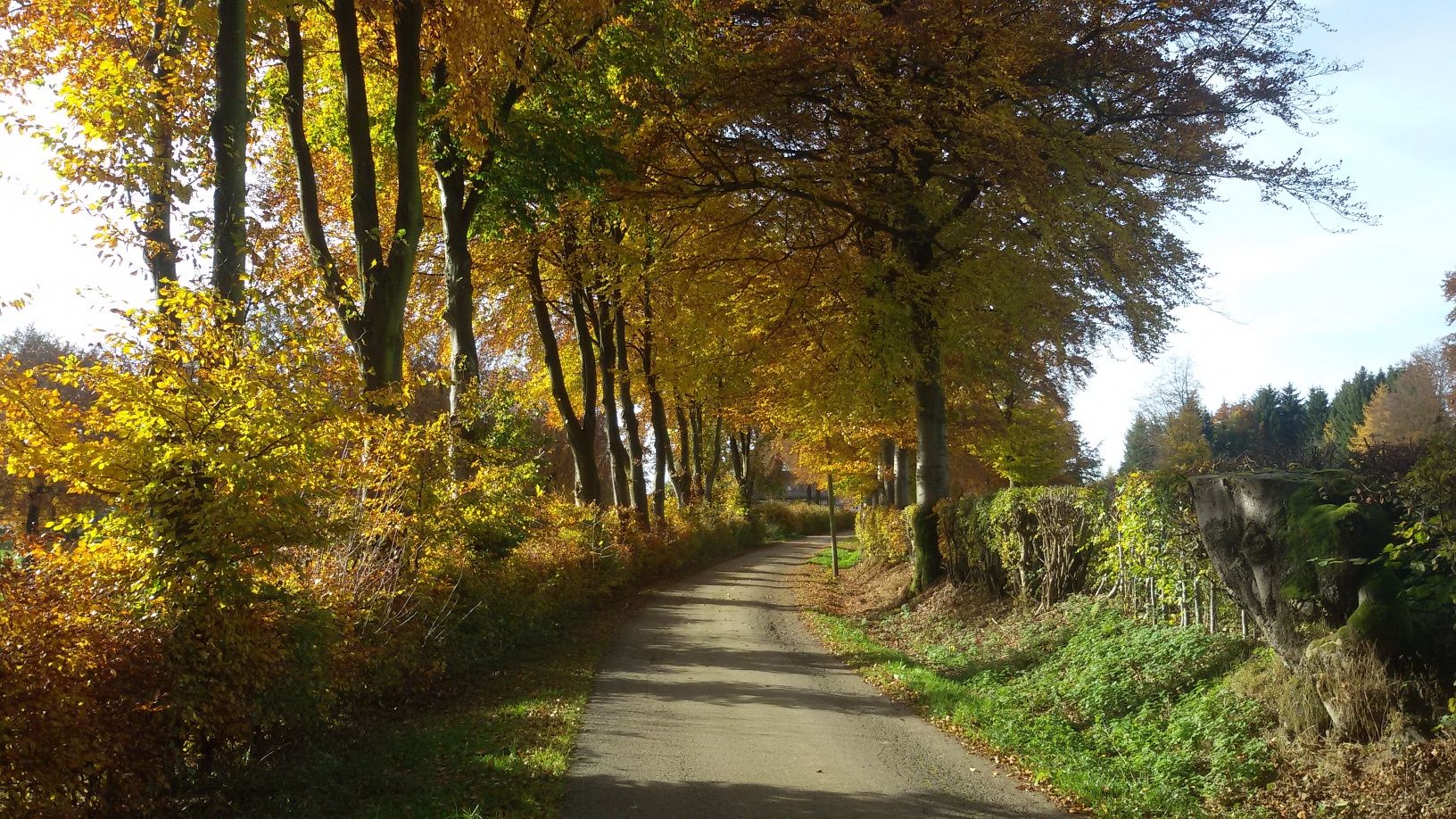 Wer verwunschene Pfade durch eine urwüchsige Natur, herrliche Fernsichten und zahlreiche Sehenswürdigkeiten aus fünf Jahrhunderten liebt, der kommt bei dieser Wanderung voll auf seine Kosten. Vom Wanderparkplatz aus führt der Weg zunächst nach Osten durch das Wohngebiet „Am Weiher“. An Spielplatz, Schule und Kindergarten vorbei gelangen Sie in das Imgenbroicher Heckenland mit seinen mächtigen Buchen. Vor dem Tränkhof führt nach rechts ein romantischer Pfad hinab ins Belgenbachtal. Wohltuende Stille umfängt dort den Wanderer. Der mit Birken und Erlen bestandene Talgrund mit dem munter dahinplätschernden Bach ist ein Paradies für zahlreiche Tier und Pflanzenarten und wie geschaffen für ein befreites Aufatmen. Gleich hinter dem ehemaligen Mühlenteich durchstößt ein uralter Weg den mächtigen Schieferfels. Zahllose Fuhrwerke mit eisenbeschlagenen Rädern haben seit dem Mittelalter einen der besterhaltenen historischen Wege des Monschauer Landes geschaffen. Ziel ihrer Fahrt war die Belgenbacher Mühle. Sie wurde zwischen 1550 und 1560 als „Bei-Mühle“ zur bereits 1306 erwähnten, weiter talaufwärts gelegenen ersten Mühle im Belgenbachtal errichtet, von der leider nichts mehr zu sehen ist. Das erste Stück des ansteigenden Weges beschert nochmals einige historische Karrenspuren. Über einen Waldweg, der sich am Hang entlang windet, erreichen Sie die nächste Attraktion: den „Eifel-Blick“ hoch über dem Tal der Rur. Er bietet eine großartige Aussicht auf Widdau zur linken und weiter über Rohren bis Höfen.