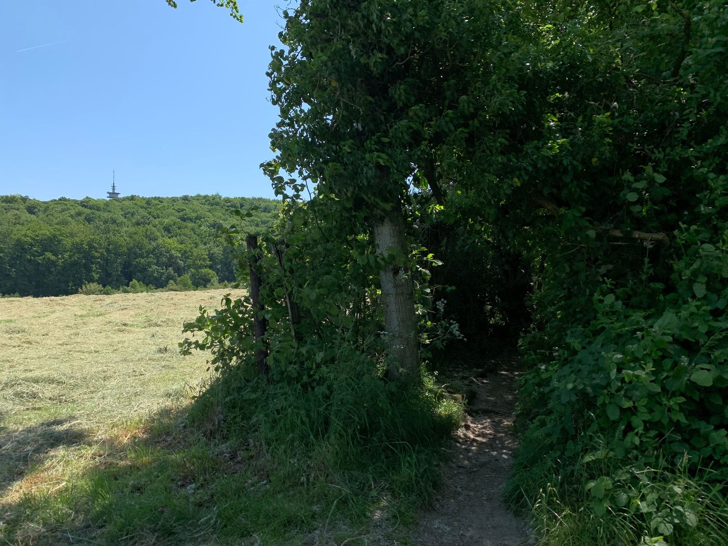 Doch kann man den Publikumsmagneten auch auf stillen Wegen durch die Grenzwälder erwandern. Von der Karlshöhe vorbei am Fernmeldeturm „Mulleklenkes“ (133m) folgen wir dem Verlauf des einstigen Landgrabens, einer mittelalterlichen Befestigung aus Erdwall, Graben und Buchenhecke. Über 70 Kilometer führte er rund um die ländlichen Gebiete des Aachener Reichs und sicherte die üppigen Wälder vor Holzräubern. 1611 signalisierten Grenzsteine mit eingemeißeltem städtischem Wahrzeichen, dem Adler, den rechtmäßigen Besitzer. Zwei Adlersteine begegnen uns auf der Tour: versteckt in Nähe der deutsch-belgischen Grenzschranke und später mitten auf dem Weg in Nähe des Wilhelminaturms. Unterwegs lassen sich entlang der aktuellen Grenzen immer wieder Reste des alten Walls und der Buchenhecke mit ihren alten, knorrig herausgewachsenen Baumreihen erahnen. Mit dem Türmchen Beeck stoßen wir auch auf einen der alten Wachtürme am Landgraben.