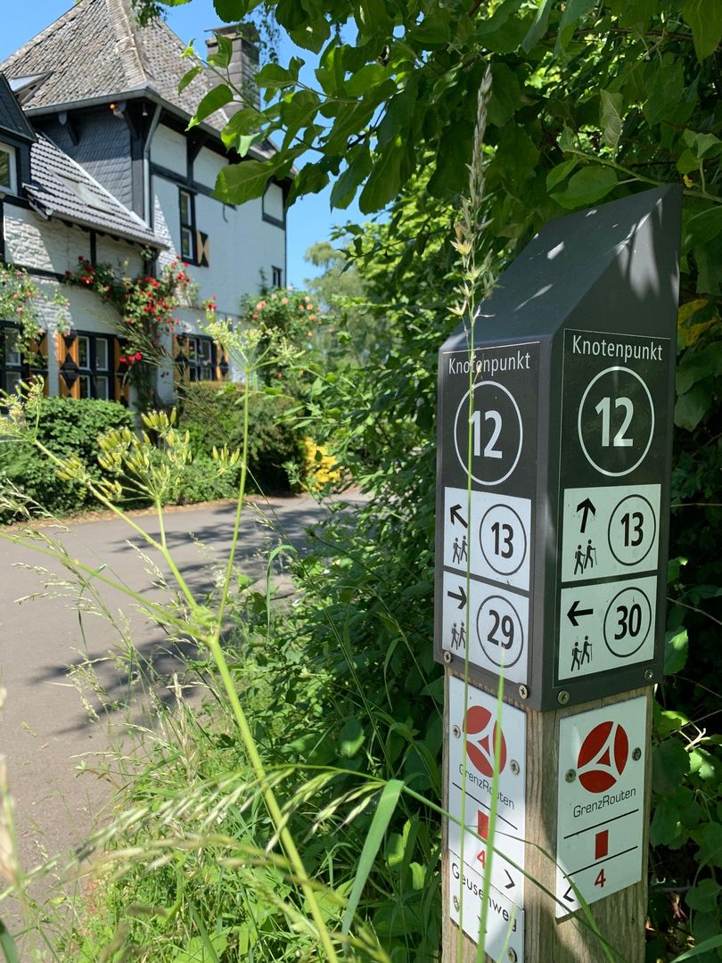 Dann öffnet sich vor uns ein weites Wiesengelände. Es liegt auf deutscher Seite und hat sich keck in mit einem schmalen Streifen in den belgischen Wald gefingert. Das kleine Drehkreuz „Rüttchen“ markiert den unscheinbaren Grenzübergang. Wie durch einen grünen Tunnel geht es nun auf den Geusenweg. Im 18. Jh. ermöglichte er einen versteckten Kirchweg zwischen Eupen und Vaals, wo Protestanten, die damals als „Geusen“ (Bettler) beschimpft und verfolgt wurden, eine tolerante Insel inmitten eines katholisch dominierten Umfeldes.