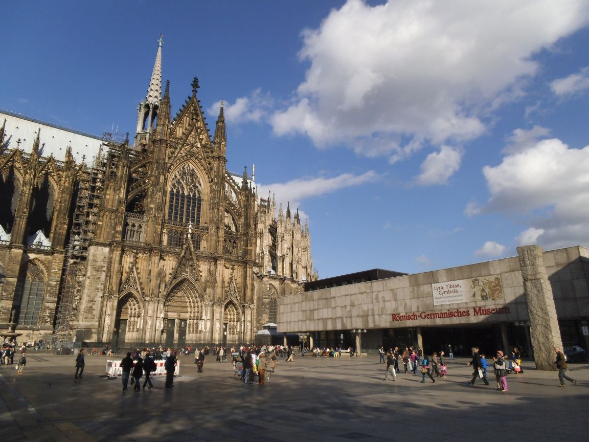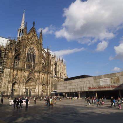 Mit dem Zug bis zum Kölner Hauptbahnhof. Von dort zu Fuß über die Domplatte zum Römisch-Germanischen Museeum.
