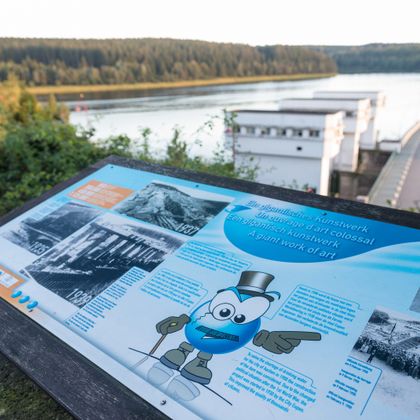 Nur wenige Kilometer vom Eupener Stadtzentrum enternt erhebt sich dieses beeindruckende Bauwerk am Zusammenfluss von Weser und Getzbach und versorgt mit seinem 16 Kilometer langen Stausee Eupen, das Herver Land sowie das Lütticher Umland mit Trinkwasser. Das an der Staumuaer gelegene Besucherzentrum gilt als idealer Ausflugsort für Familien mit Kindern aber auch für Abenteurer oder alle, die einfach entspannen möchten .Die Terrasse mit „Seeblick“ lädt zum Genießen der sonnigen Sommertage ein. Für die kleinen Besucher steht außerdem ein großangelegter Spielplatz zur Verfügung.