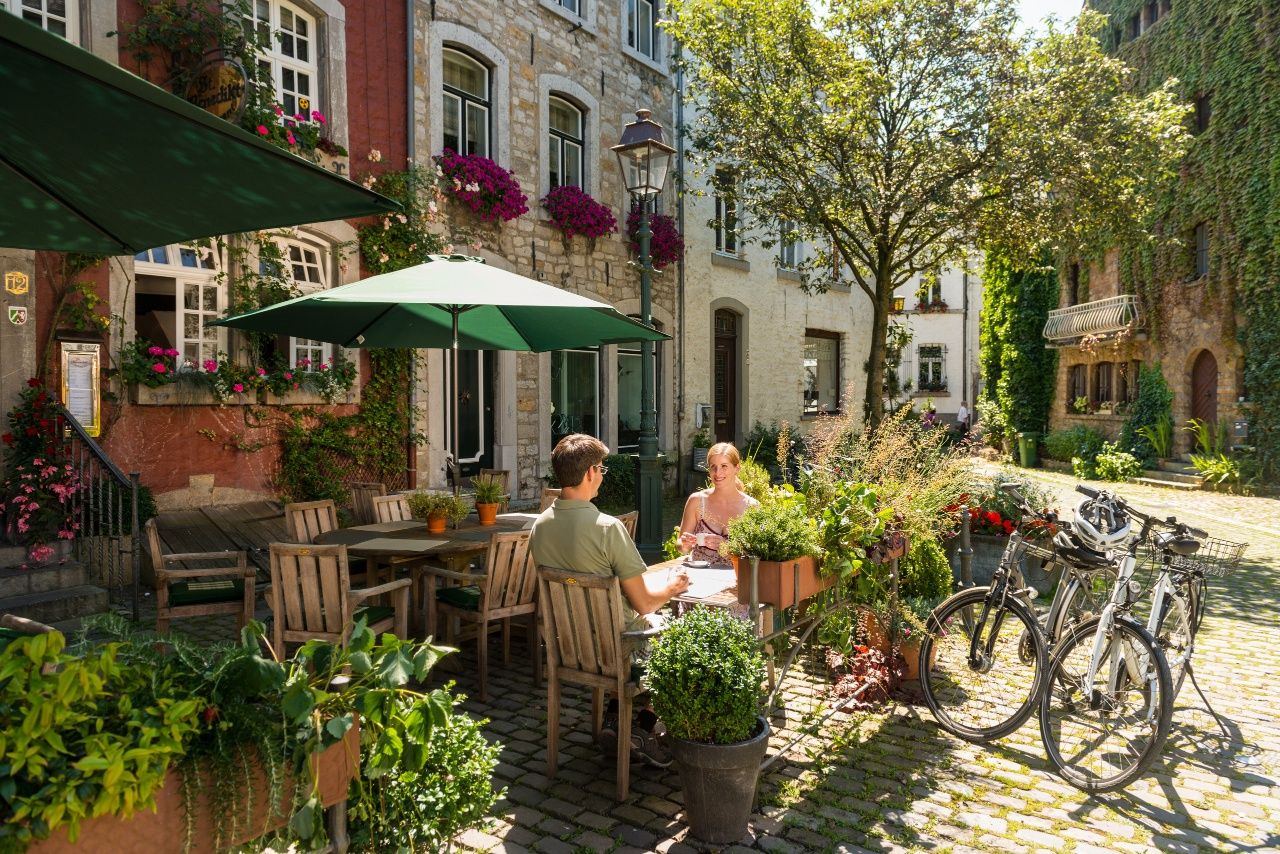 Die Tour beginnt in Roetgen, dem „Tor zur Eifel“. Hier lässt sich Freiheit gleich im doppelten Sinne erleben: Die zur Gemeinde gehörenden Ortschaften Roetgen, Rott und Mulartshütte sind ringsum von einem der größten zusammenhängenden Waldgebiete des Landes umgeben – Wander- und Radbegeisterte können hier frei die Schönheit der Natur erkunden. Auch aus historischer Sicht weht hier der Geist der Freiheit: Am 12. September 1944 marschierten amerikanische Soldaten vom belgischen Raeren-Petergensfeld kommend nach Roetgen ein, seitdem gilt Roetgen als erste befreite Gemeinde Deutschlands im Zweiten Weltkrieg. Eine Ausstellung an der Wanderstation erzählt eindrücklich von diesem historischen Moment. Nur wenige Kilometer weiter stößt du auf die Westwallbrücke am Grölisbach – ein Ort, an dem du mehr über das gewaltige Verteidigungssystem erfährst, das einst die Landschaft prägte. Ebenfalls erleben kannst du hier, wie sich die Natur den Westwall zurückerobert hat und heute sogar Lebensraum für seltene Tier und Pflanzenarten bildet. Die Route führt dich weiter durch ausgedehnte Wälder bis ins idyllische Kornelimünster. Auf dem Rückweg begegnet dir bei Schmithof erneut der Westwall, bevor du – teils über belgisches Gebiet – zurück nach Roetgen gelangst.