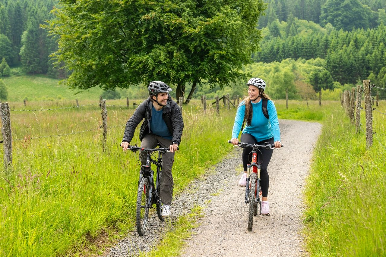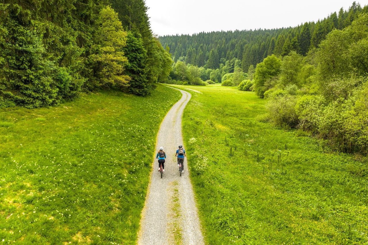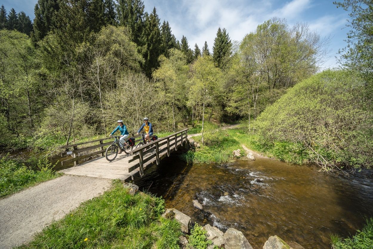 Weiter folgen wir dem Verlauf der Rur bis nach Einruhr und durch den Nationalpark Eifel, wo von Buchen geprägte Wälder den Weg säumen. Landschaftstypisch sind auch die zahlreichen imponierenden meterhohen Haushecken innerhalb der Siedlungen, die als Windschutz für die einzelnen Höfe angelegt wurden sowie ein ausgeprägtes Flurheckensystem, das Felder und Wiesen durchzieht. Der Eifeldom verkündet das nahende Ende der Tour.