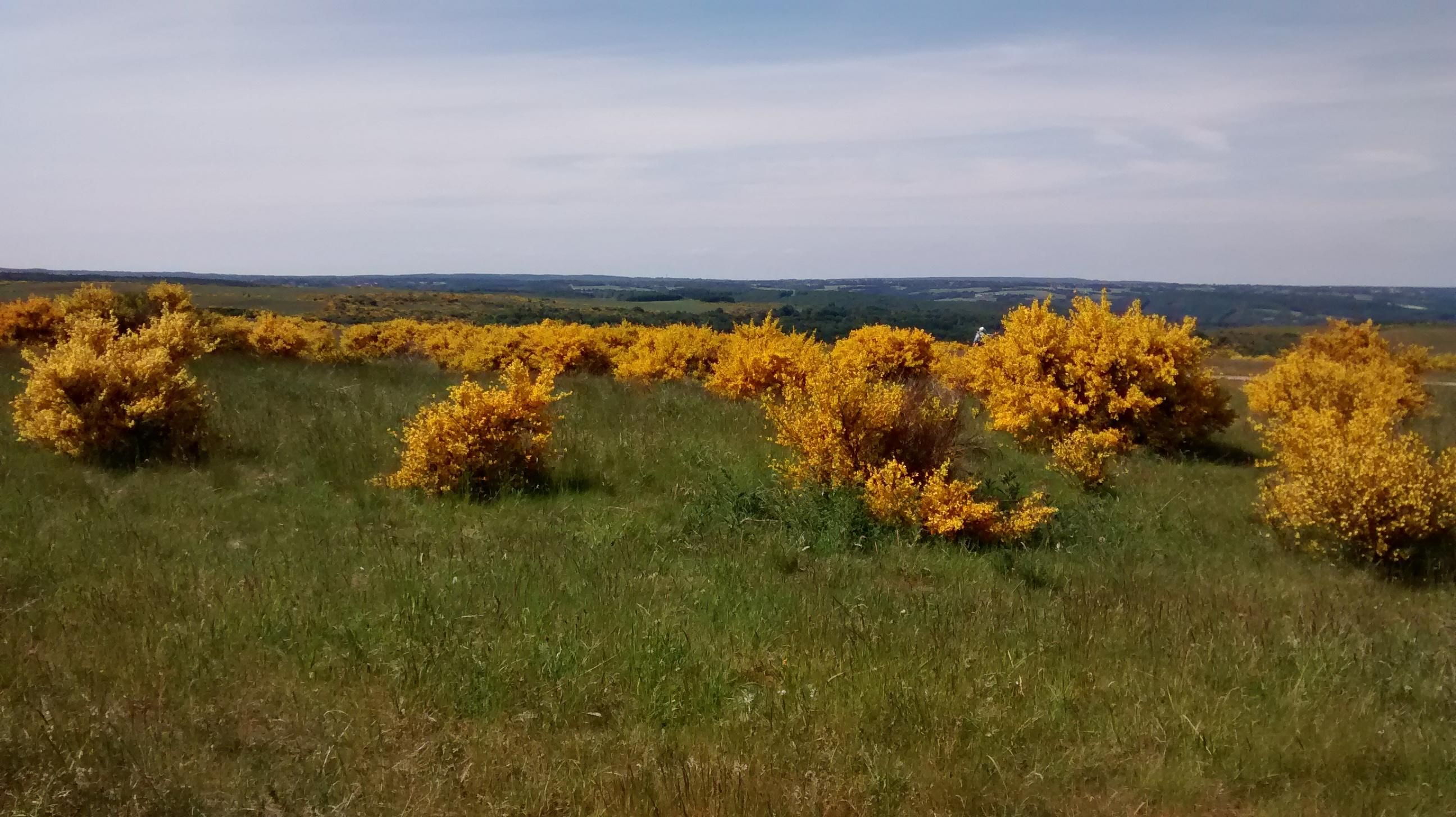 • Eine blühende Landschaft mit gelben Sträuchern und grünem Gras. Der Himmel ist blau mit wenigen Wolken.
