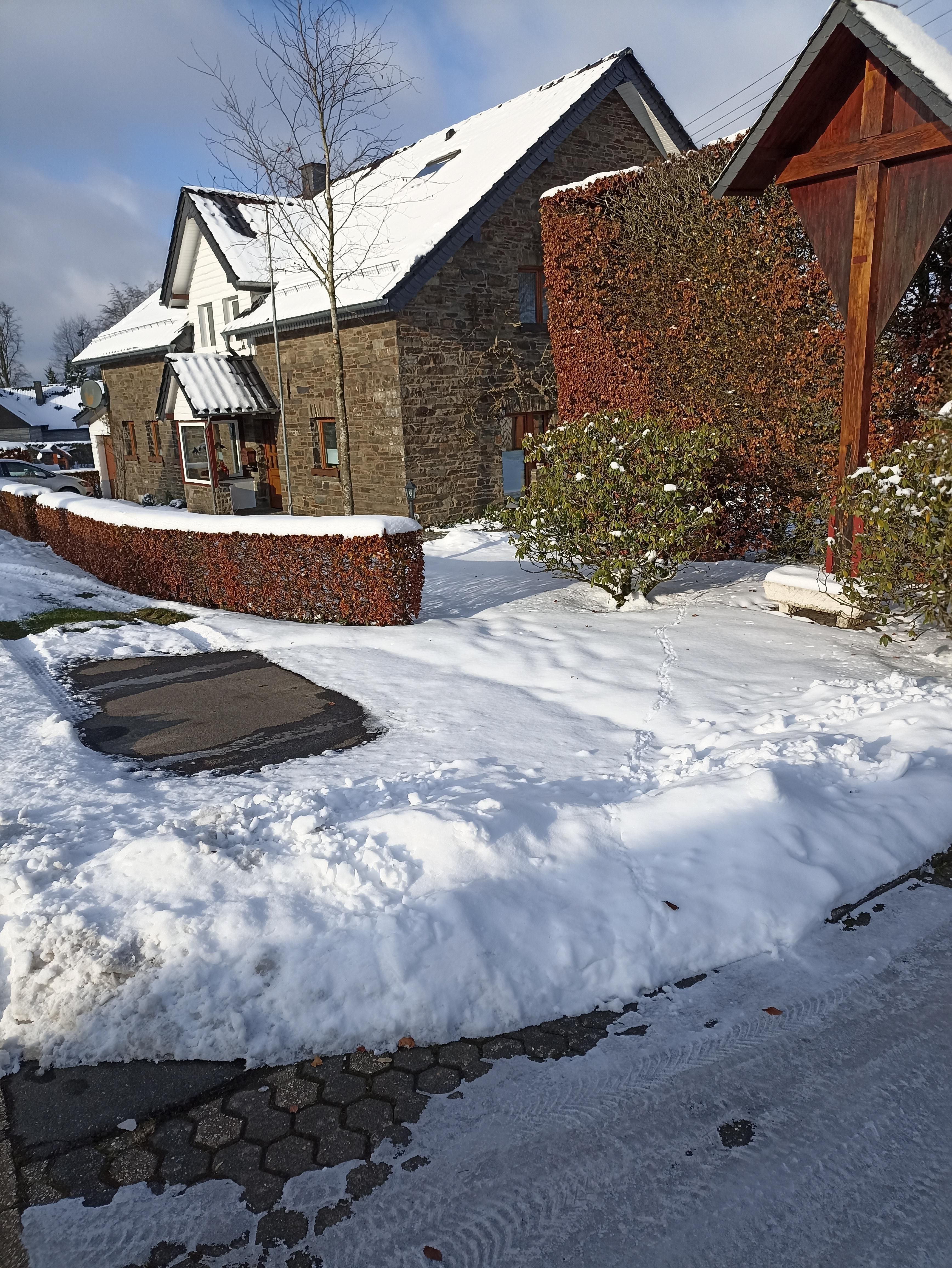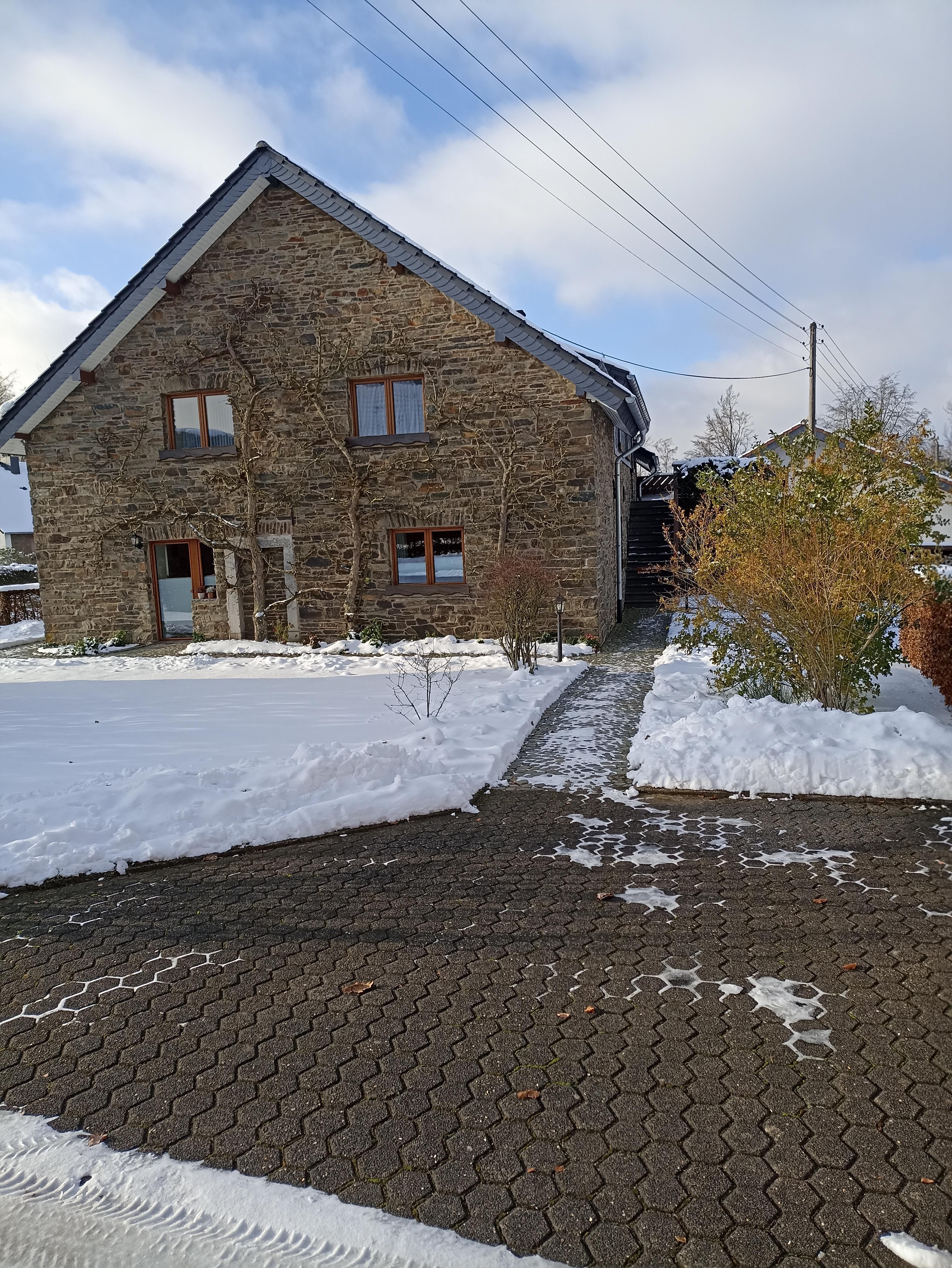 • Ein charmantes Steinhaus umgeben von Schnee. Der Weg ist mit Pflastersteinen versehen und die Bäume sind winterlich karg.