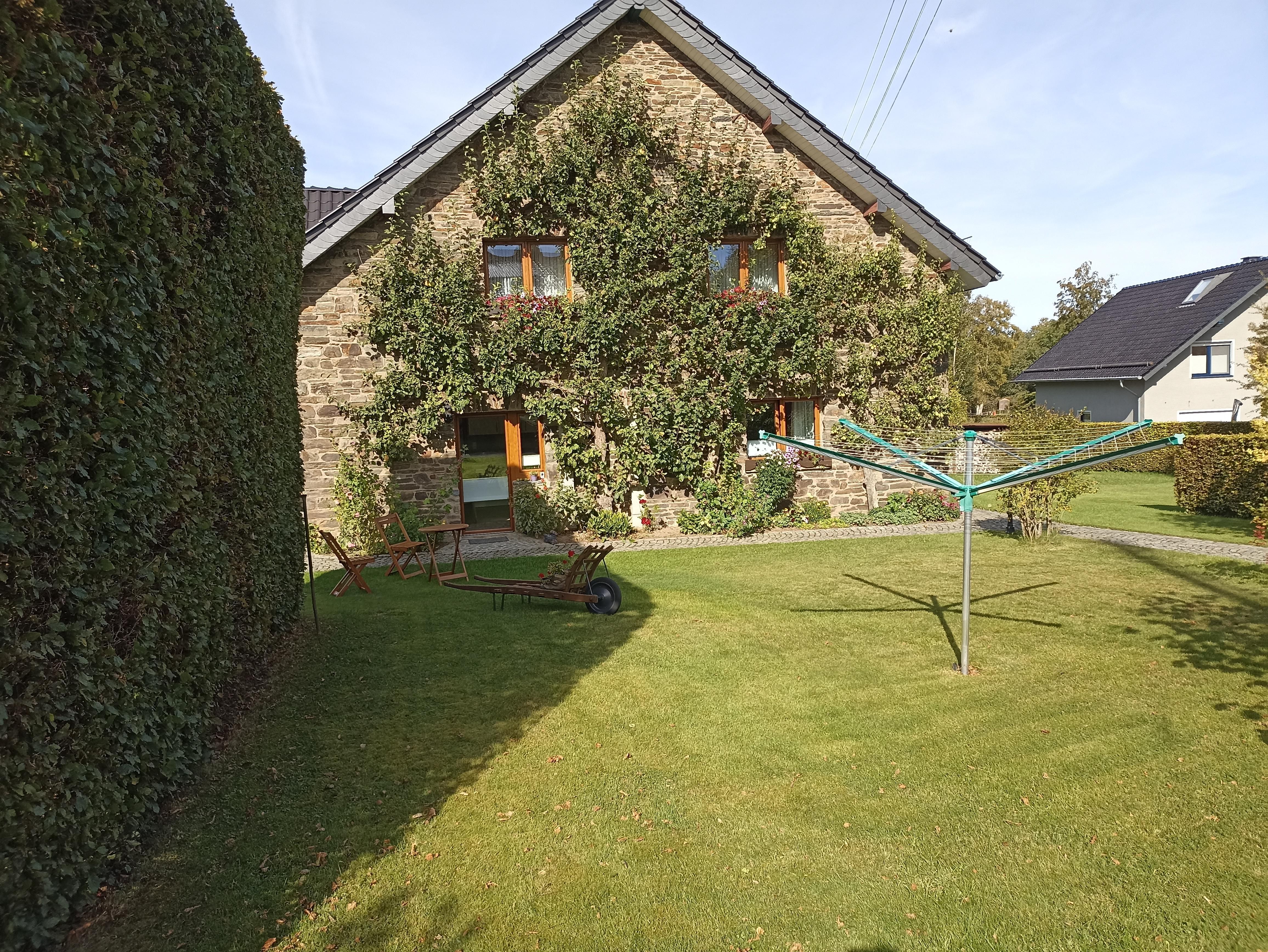 • Ein gemütliches Haus mit einer begrünten Fassade und großen Fenstern. Im Garten steht eine Wäschespinne und der Rasen ist gepflegt.