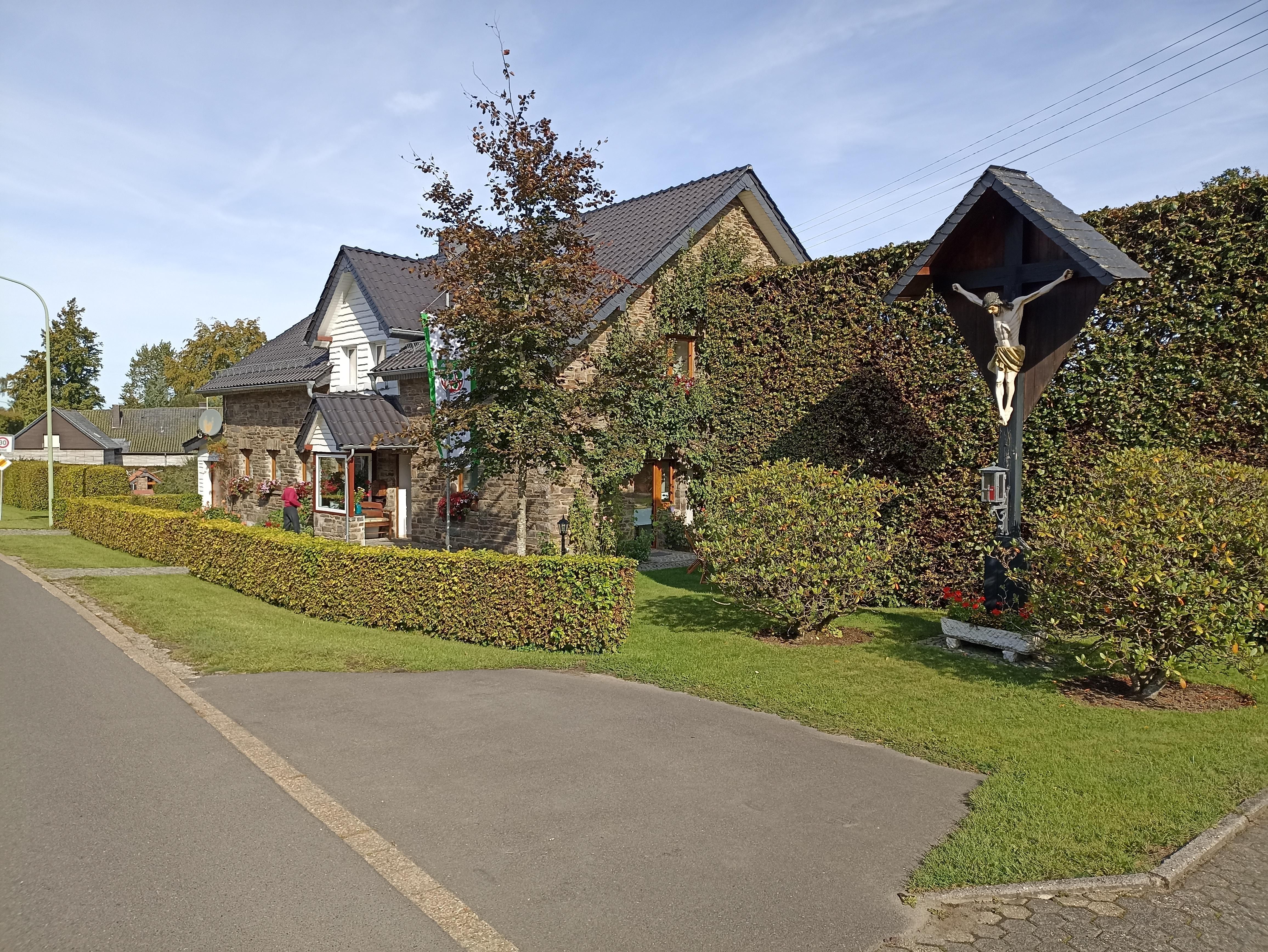 • Ein gemütliches Haus mit begrünten Büschen und einem Garten. Im Vordergrund steht ein Kreuz neben dem Gehweg.