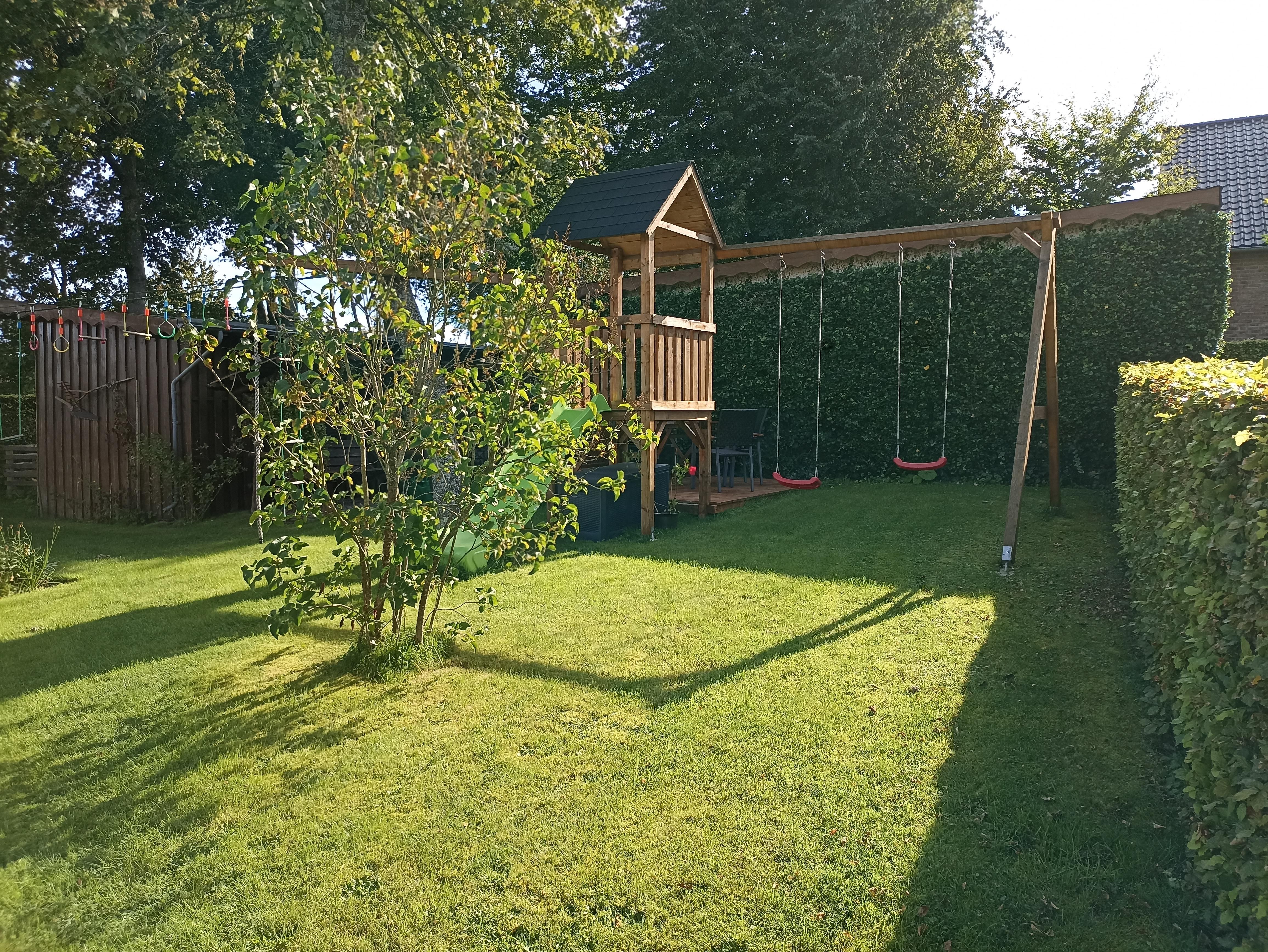• Ein schöner Garten mit einer Spielturmanlage und einer Schaukel. Die grüne Wiese ist von Hecken umgeben und es scheint sonnig zu sein.