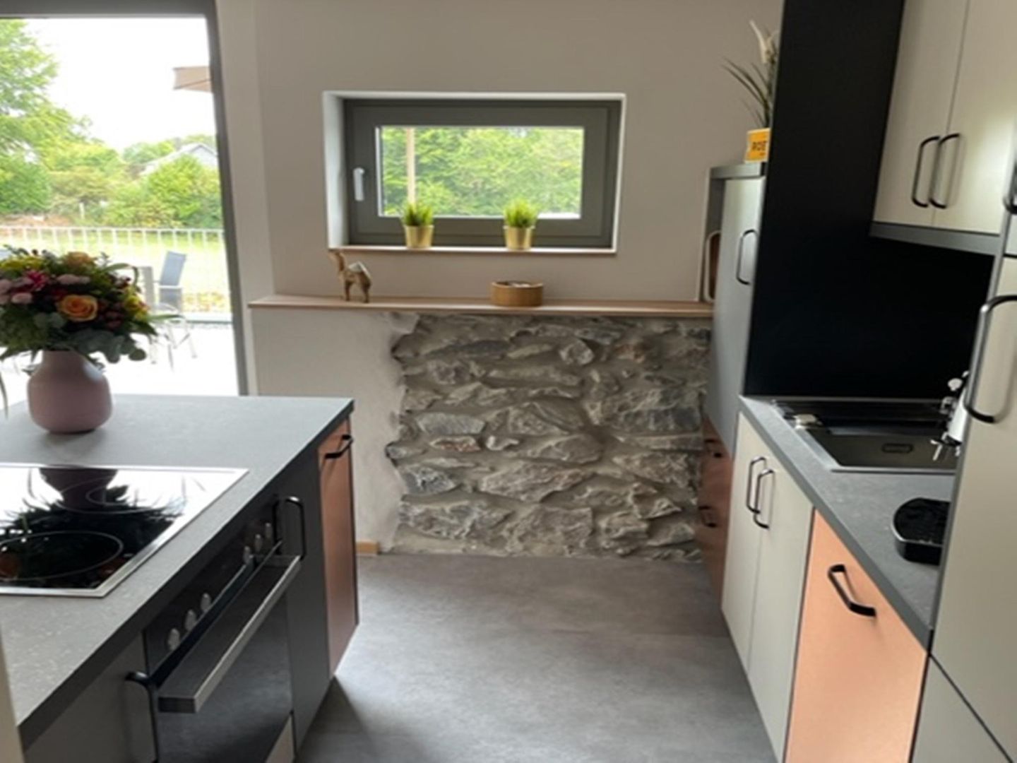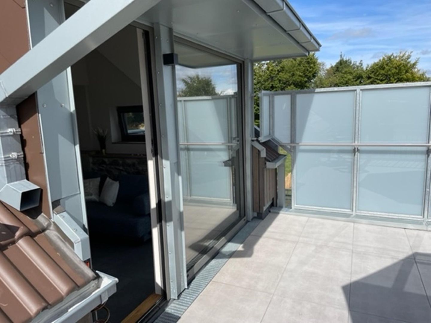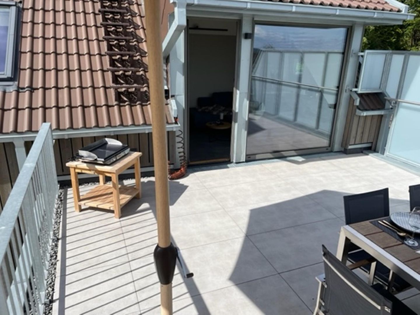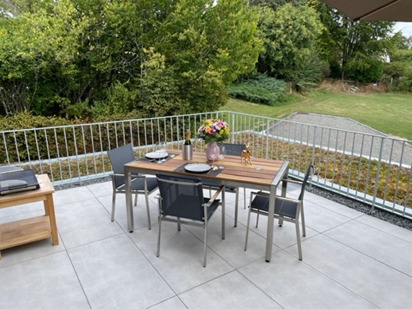 Von der großzügigen Terrasse genießen Sie einen schönen Ausblick auf die Wiesen und den Ort.