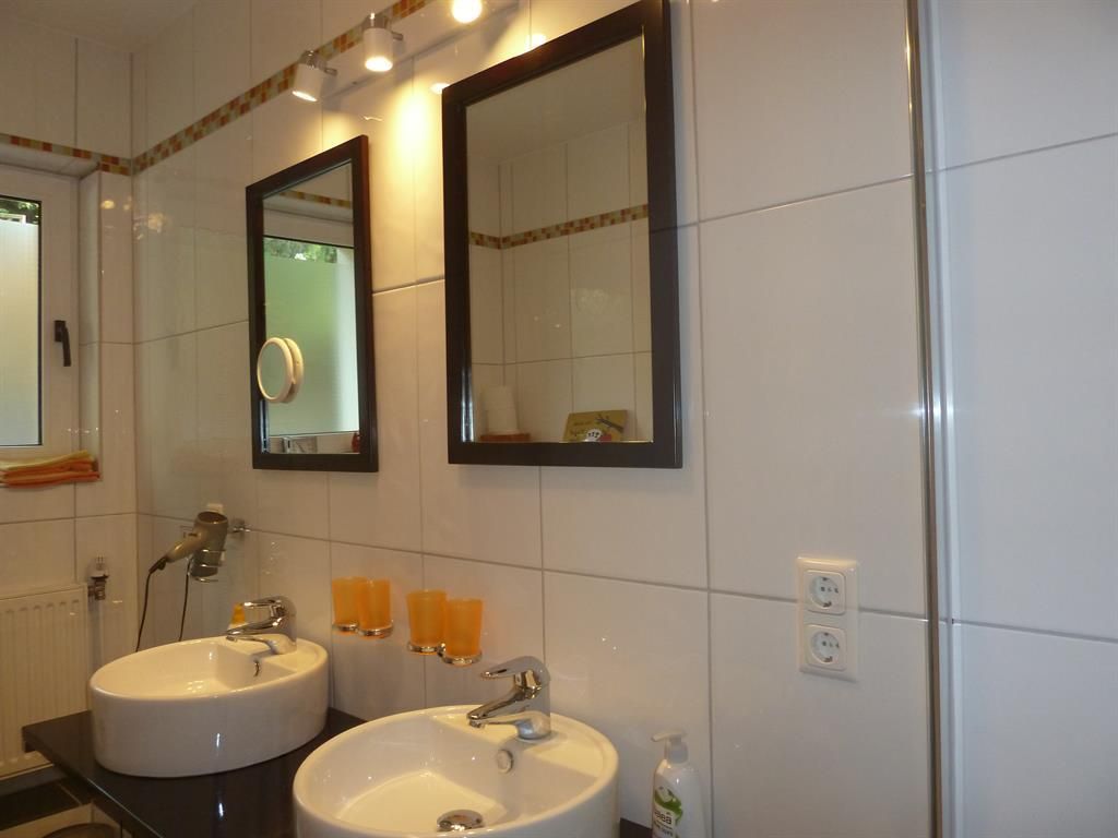 Das ganze Haus ist hell und freundlich eingerichtet. 6 Doppelzimmer, 3 Duschbäder mit WC+ 1 sep. WC. Ein Wohnzimmer mit 3 Ledersofas und Kamin. Eine große, helle Küche mit allem was man braucht, wie z.B. XXL Kühlschrank, sep. Kühl-Gefrierkombination, Spülmaschine und ein sehr großer Esstisch. Außerdem haben wir im Winter 2018 zu dem vorhandenen 4 Platten Cerankochfeld eine zusätzliche Induktionsplatte eingekauft. Natürlich mit passenden, neuen Kesseln und Pfannen, damit unsere Gäste die gerne kochen, dies noch besser ausleben können.