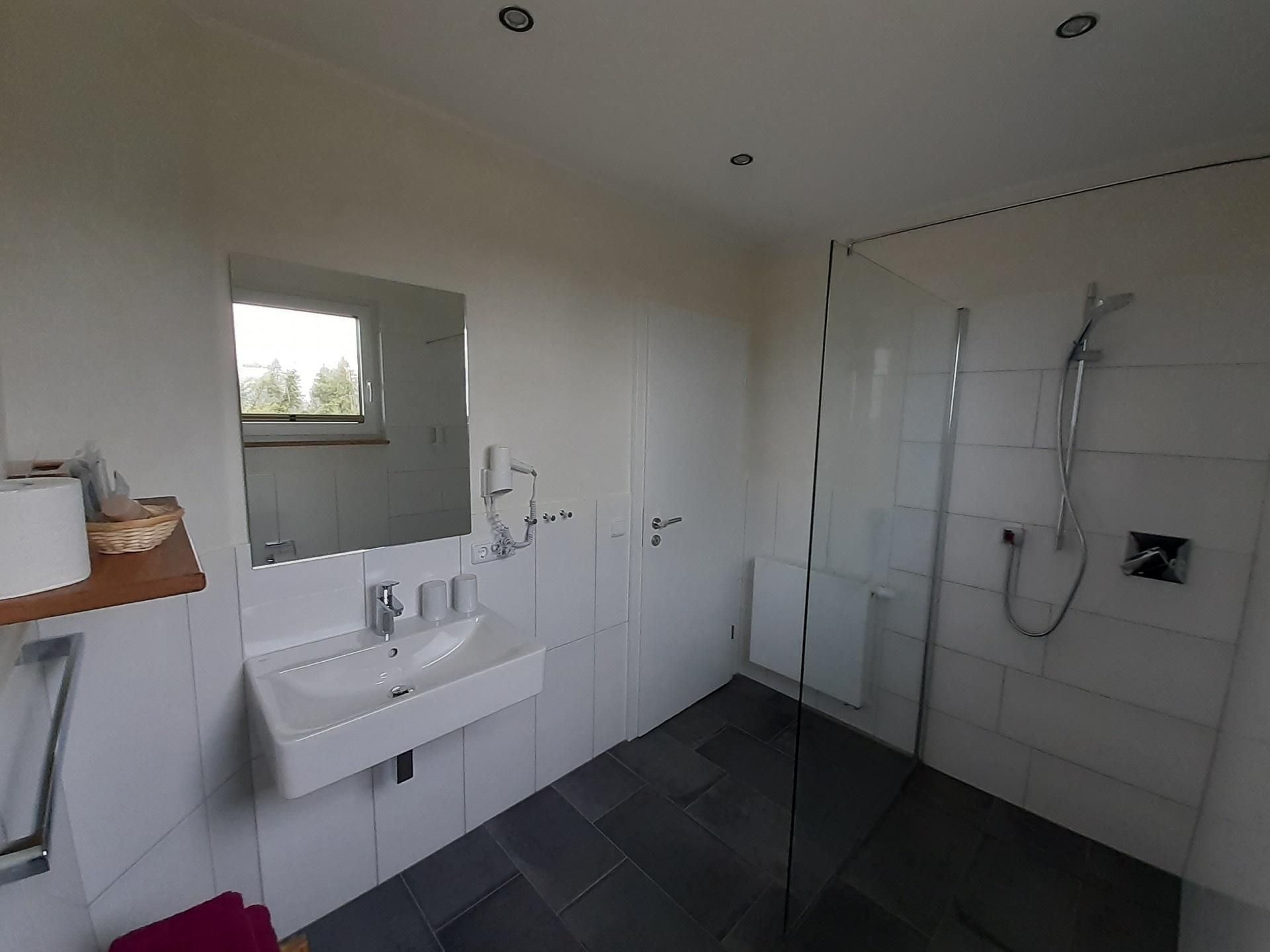 • Ein modernes Badezimmer mit Dusche und Waschbecken. Das Dachfenster sorgt für viel Tageslicht.