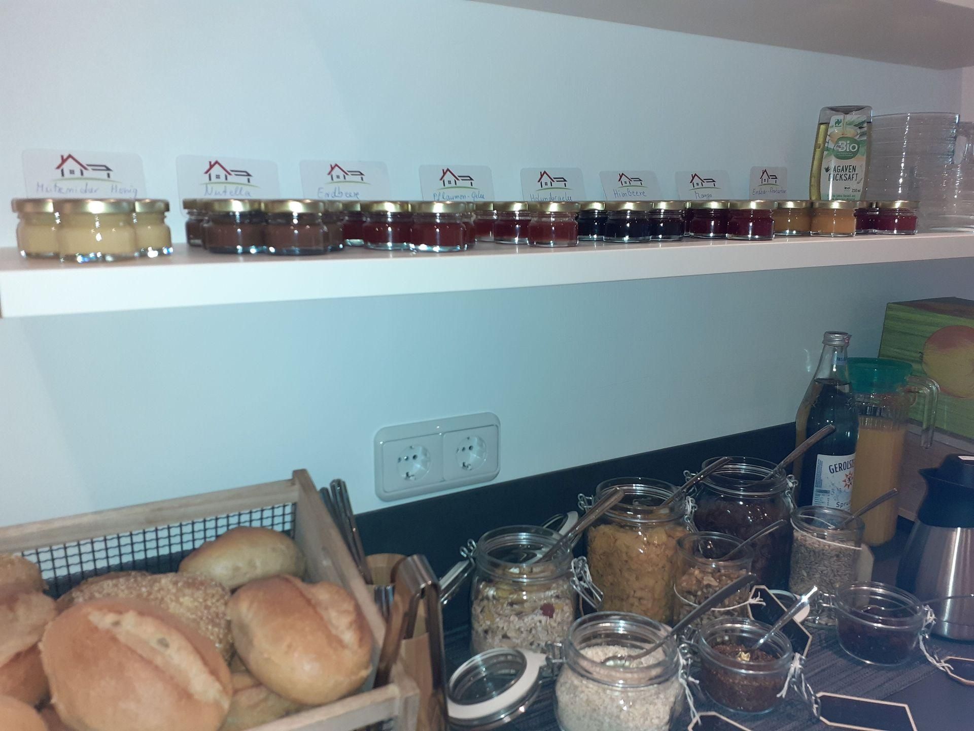 • Eine Auswahl an Marmeladen und Honiggläsern steht auf einem Regal. Darunter sind frische Brötchen und verschiedene Vorratsbehälter.