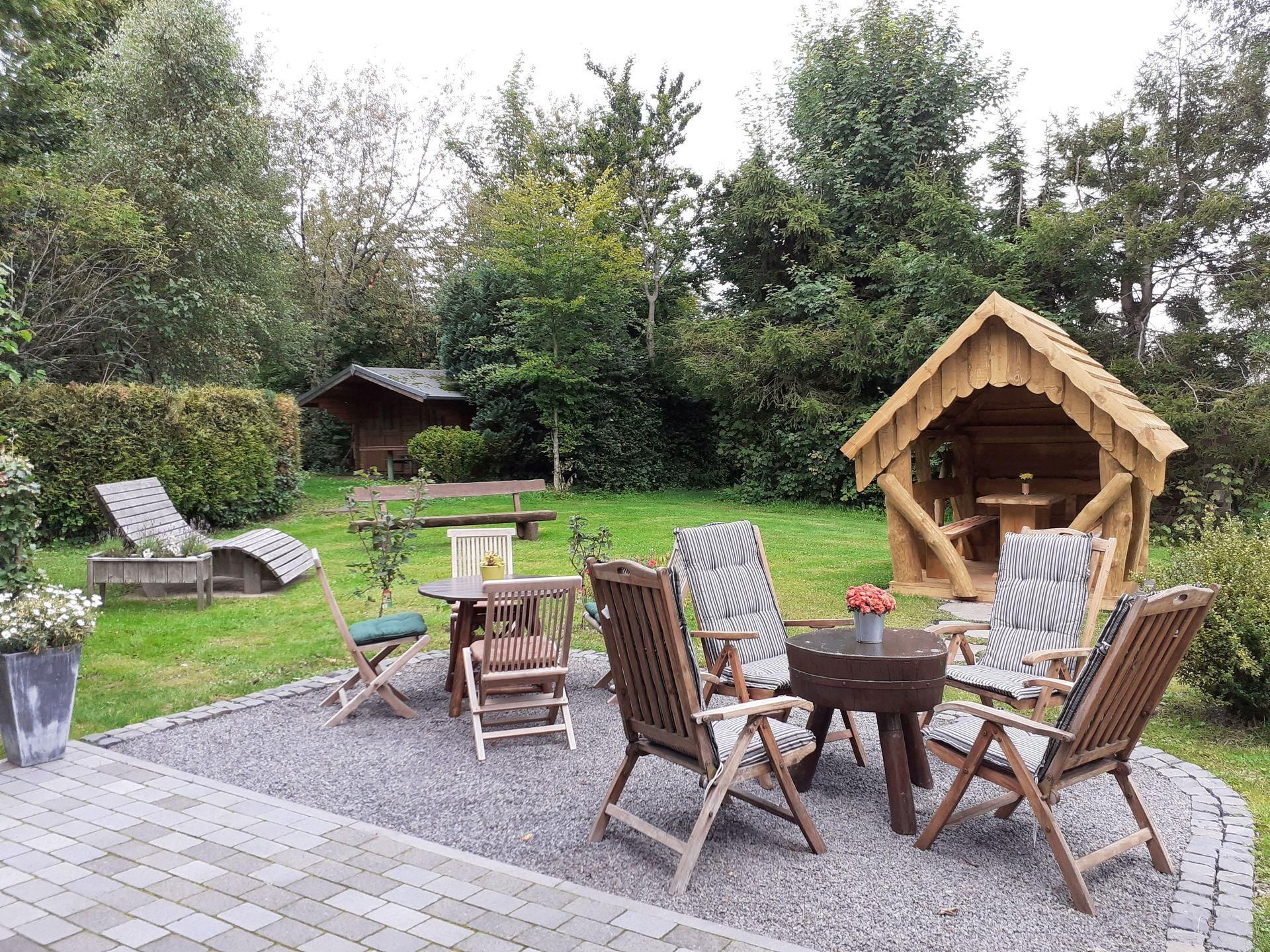 • Ein gemütlicher Garten mit Sitzgelegenheiten und einer kleinen Holzlaube. Im Hintergrund sind Bäume und ein weiterer Holzschuppen zu sehen.