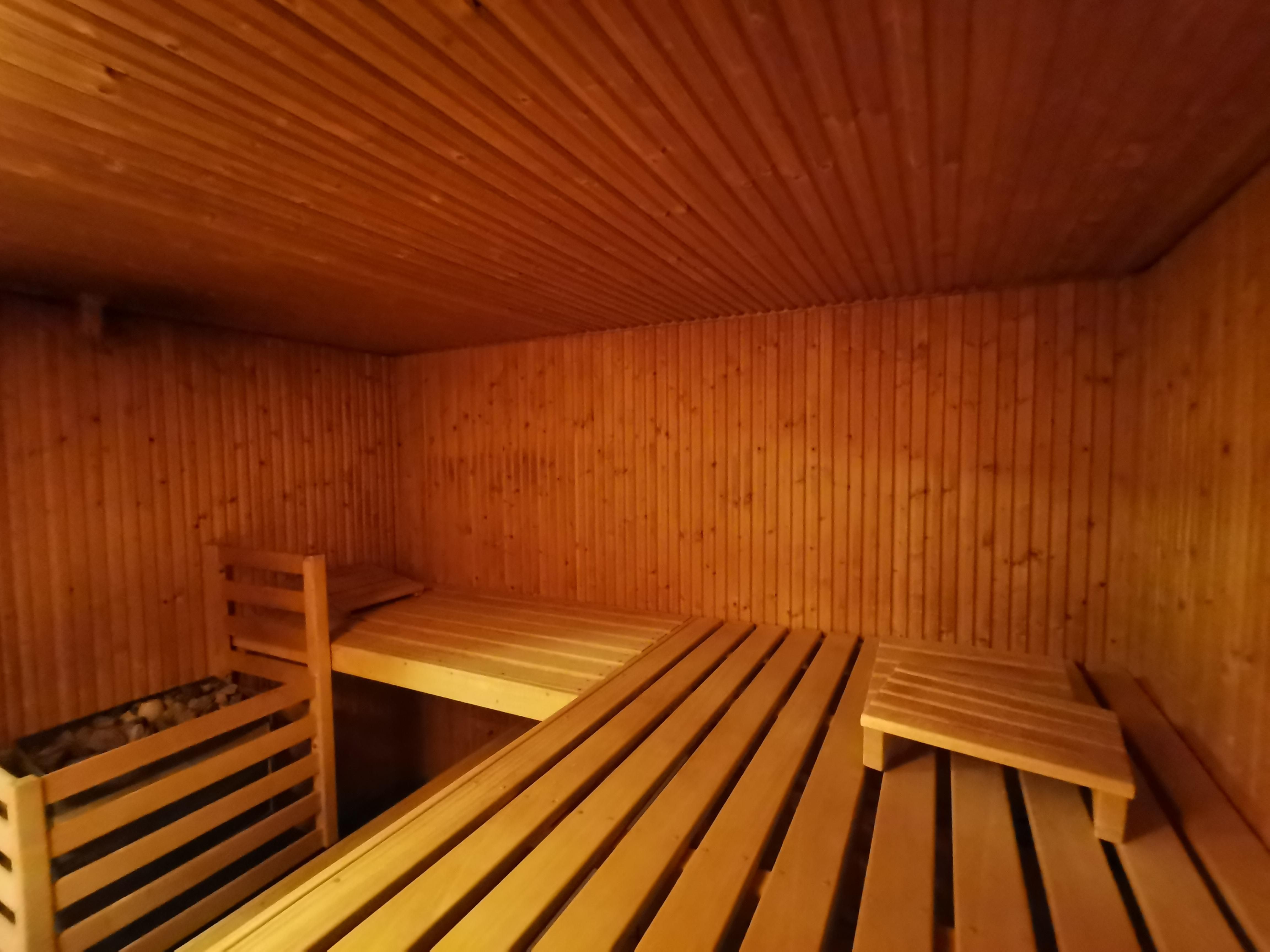 • Eine gemütliche Sauna mit Holzverkleidung und Sitzbänken. Der Raum strahlt Wärme und Entspannung aus.