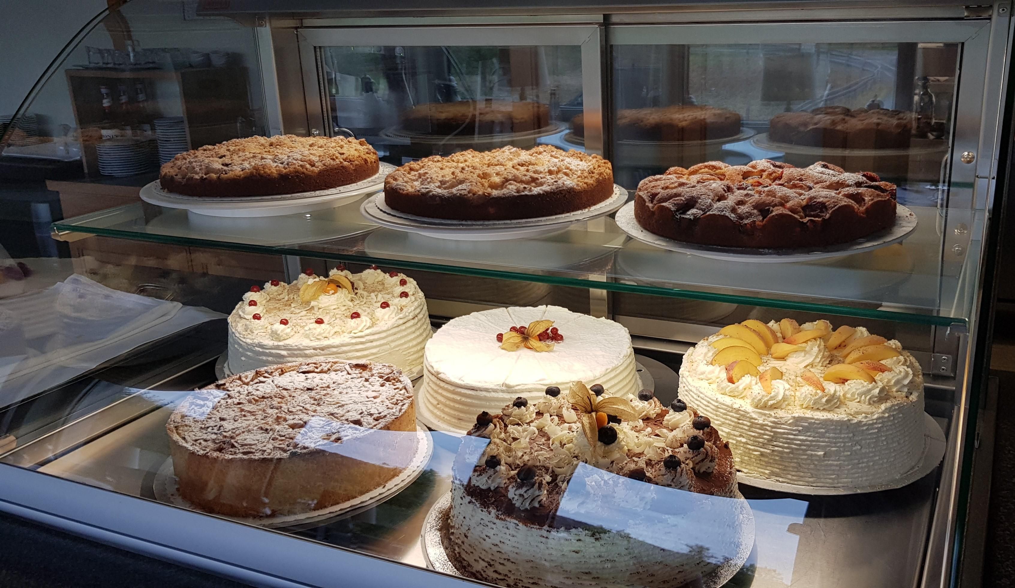 • Eine Auswahl an köstlichen Kuchen in einer Vitrine. Die Torten sind mit verschiedenen Früchten und Dekorationen verziert.