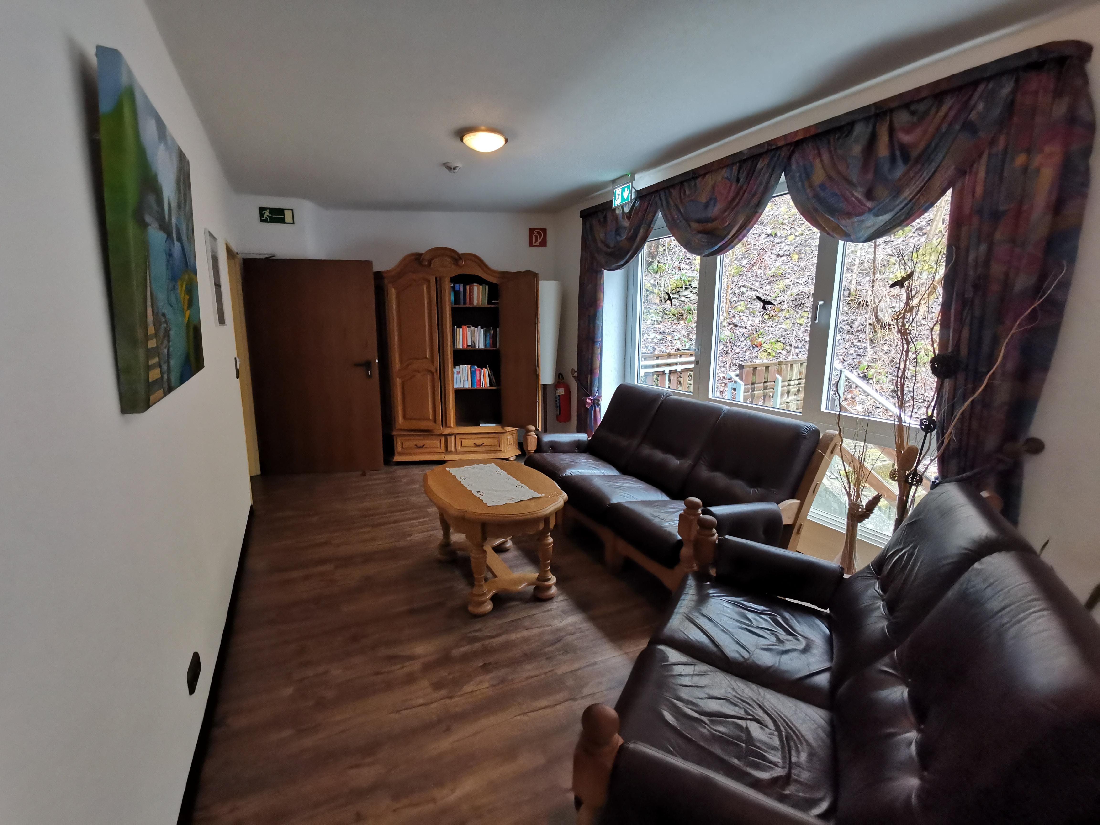 • Ein einladendes Wohnzimmer mit einem großen Fenster, das viel Tageslicht hereinlässt. Es gibt eine moderne Couch, einen Tisch und einen Bücherregal, alles in gemütlichem Ambiente.
