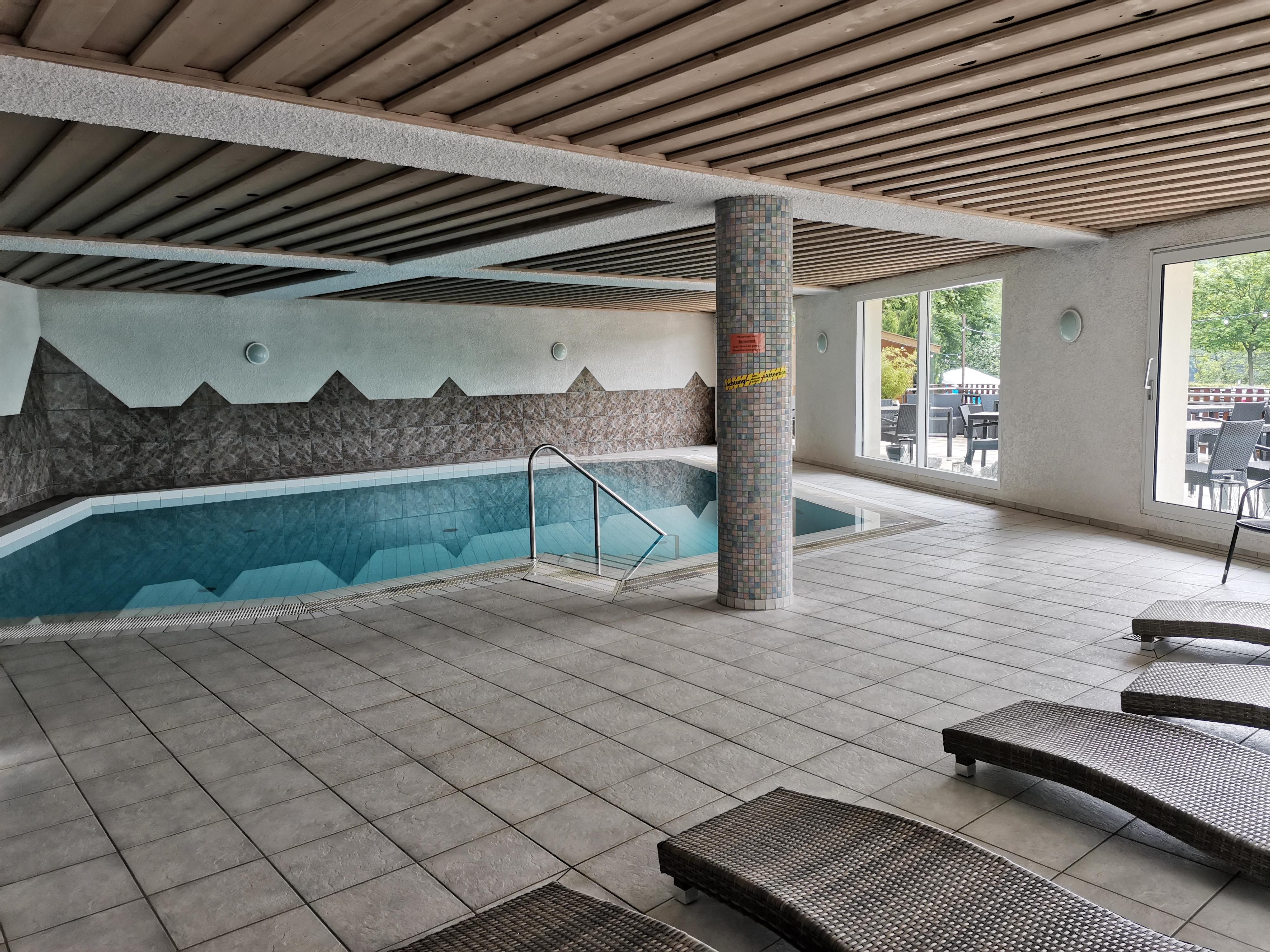 • Ein Innenpoolbereich mit einem klaren, blauen Wasser und modernem Design. Sonnenliegen stehen bereit, um sich zu entspannen.