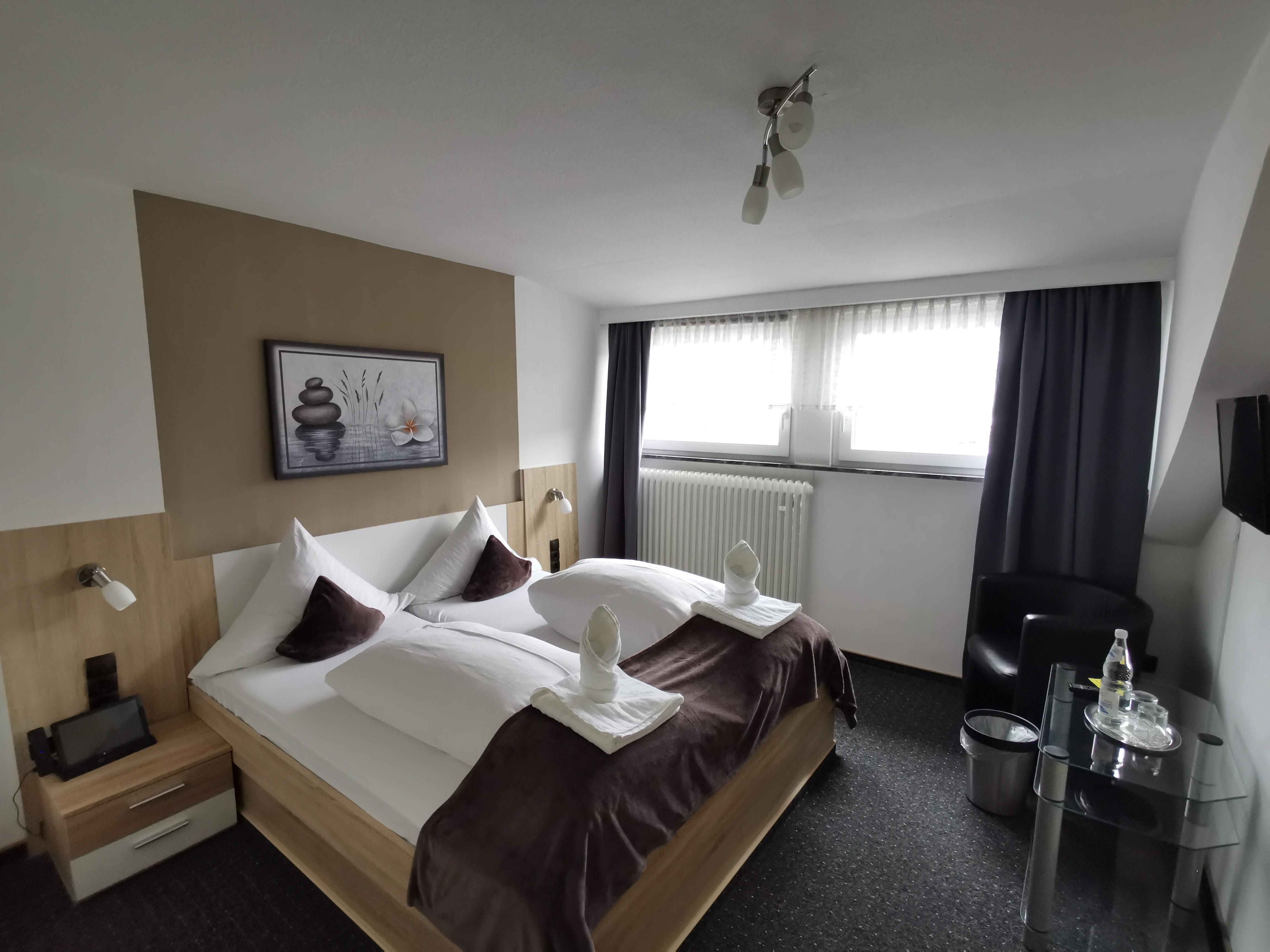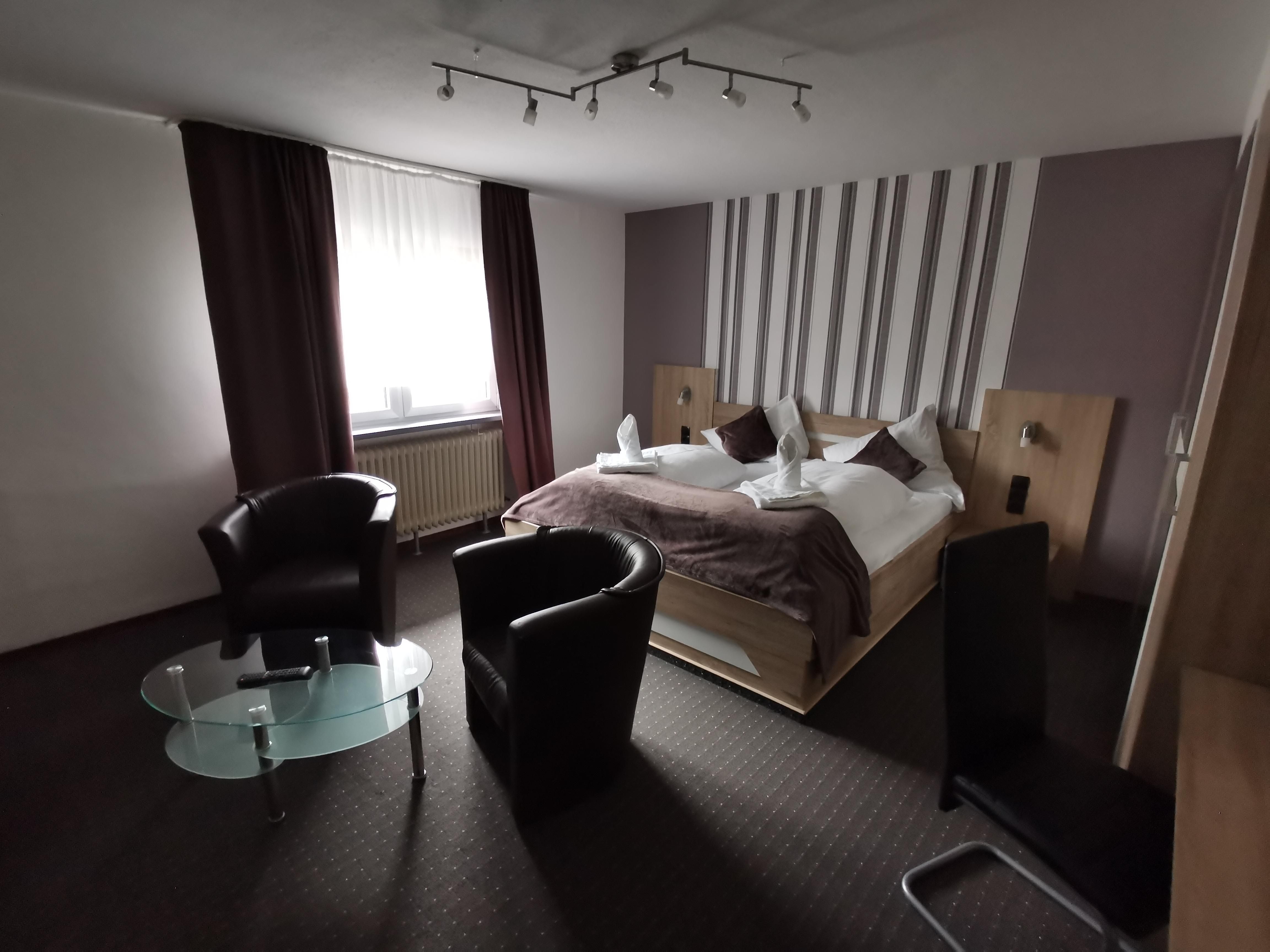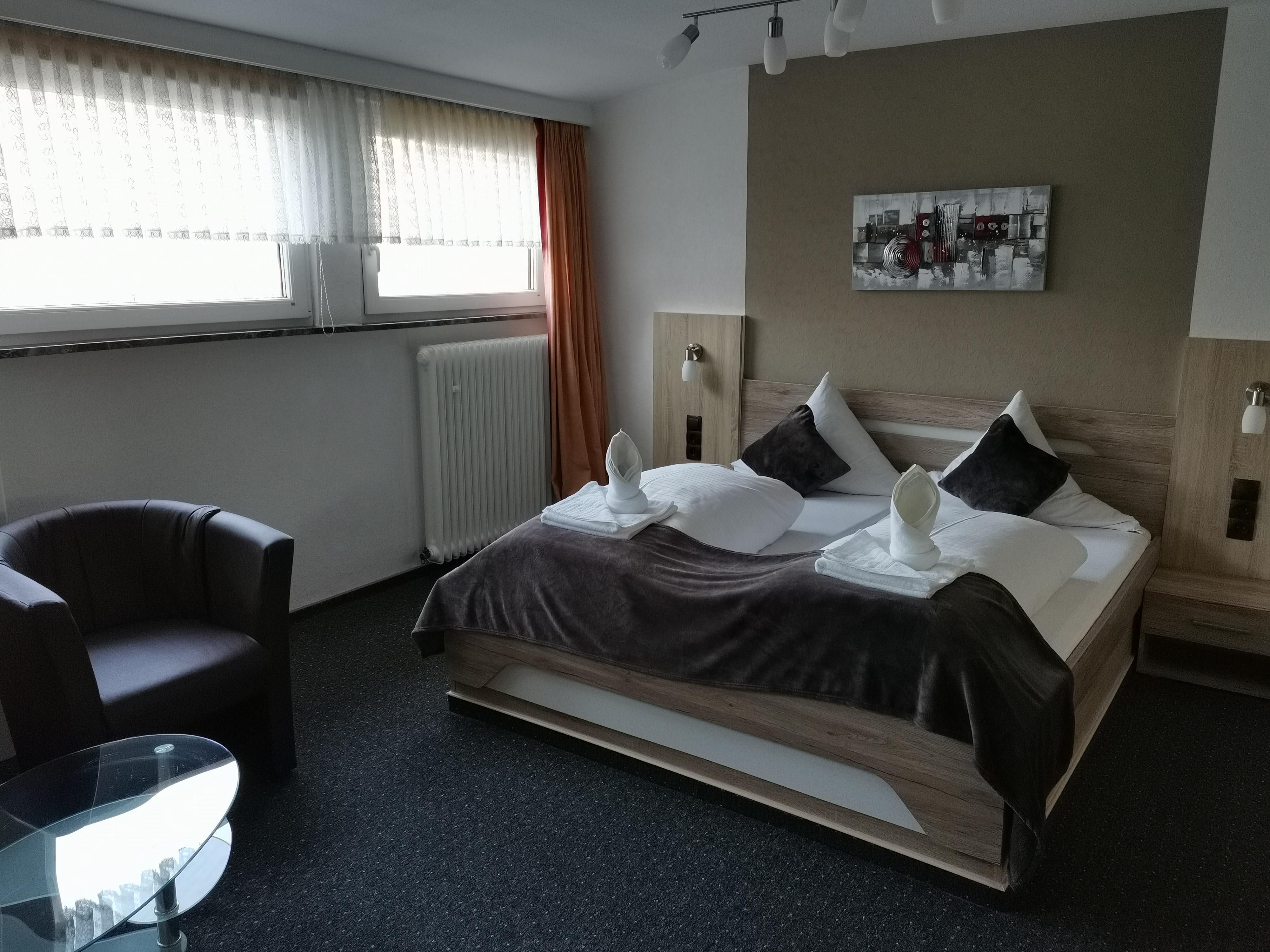 • Ein modernes Hotelzimmer mit einem Doppelbett und einem gemütlichen Sessel. Die Atmosphäre ist einladend und gut beleuchtet.