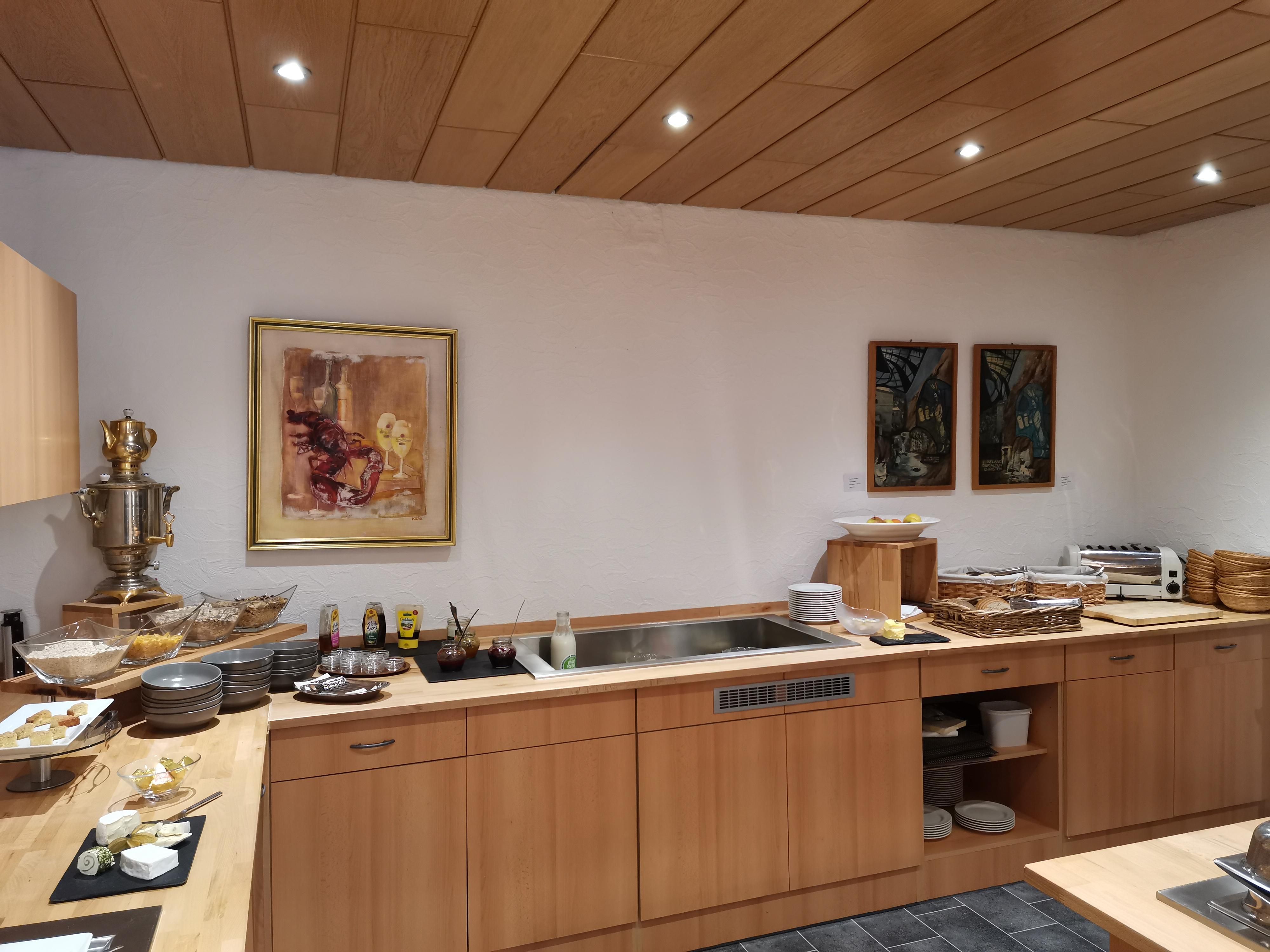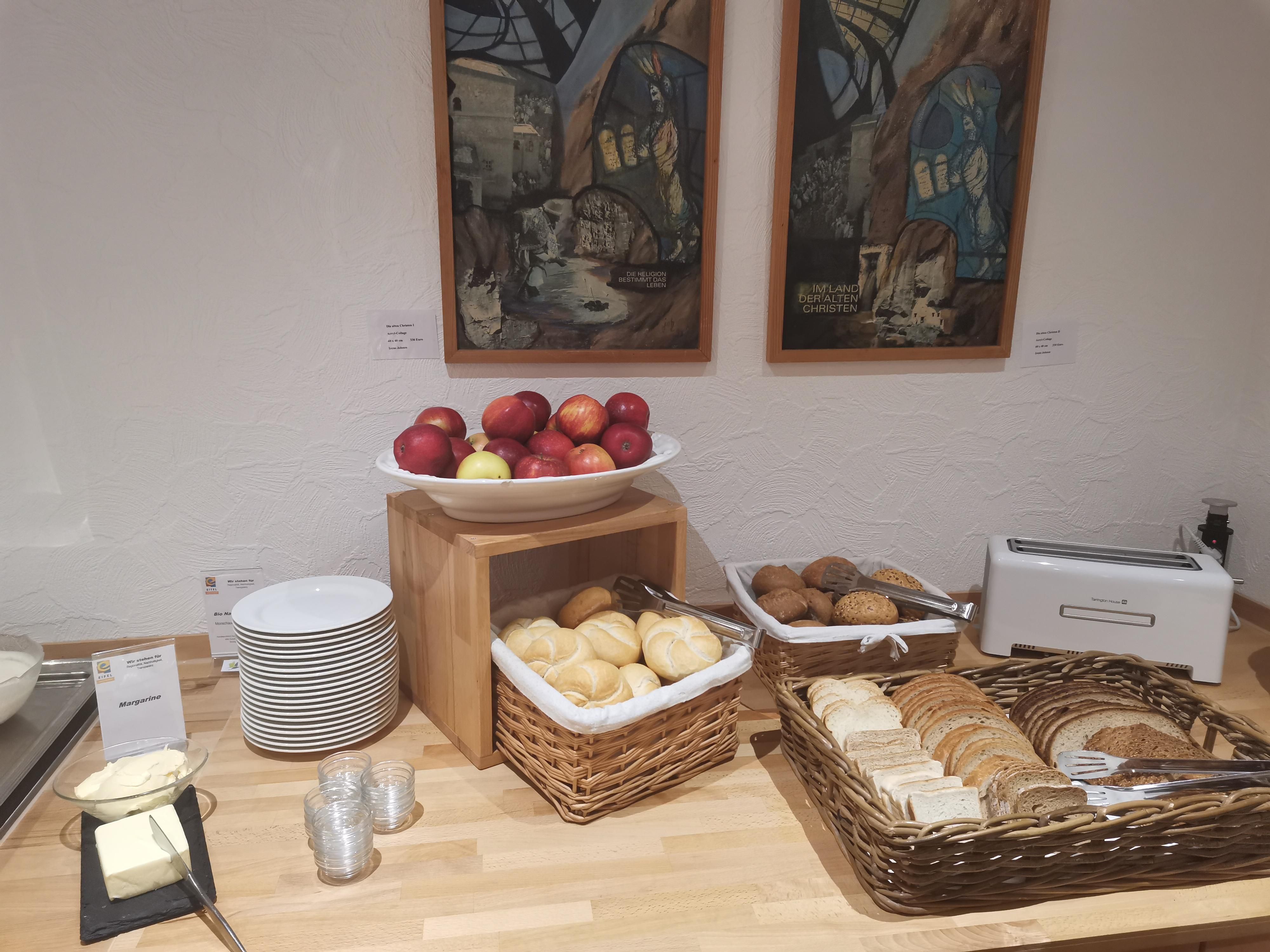 • Ein Frühstücksbuffet mit frischen Äpfeln, Brötchen und einer Auswahl an Keksen. Mehrere Teller und ein Toaster sind ebenfalls vorhanden.