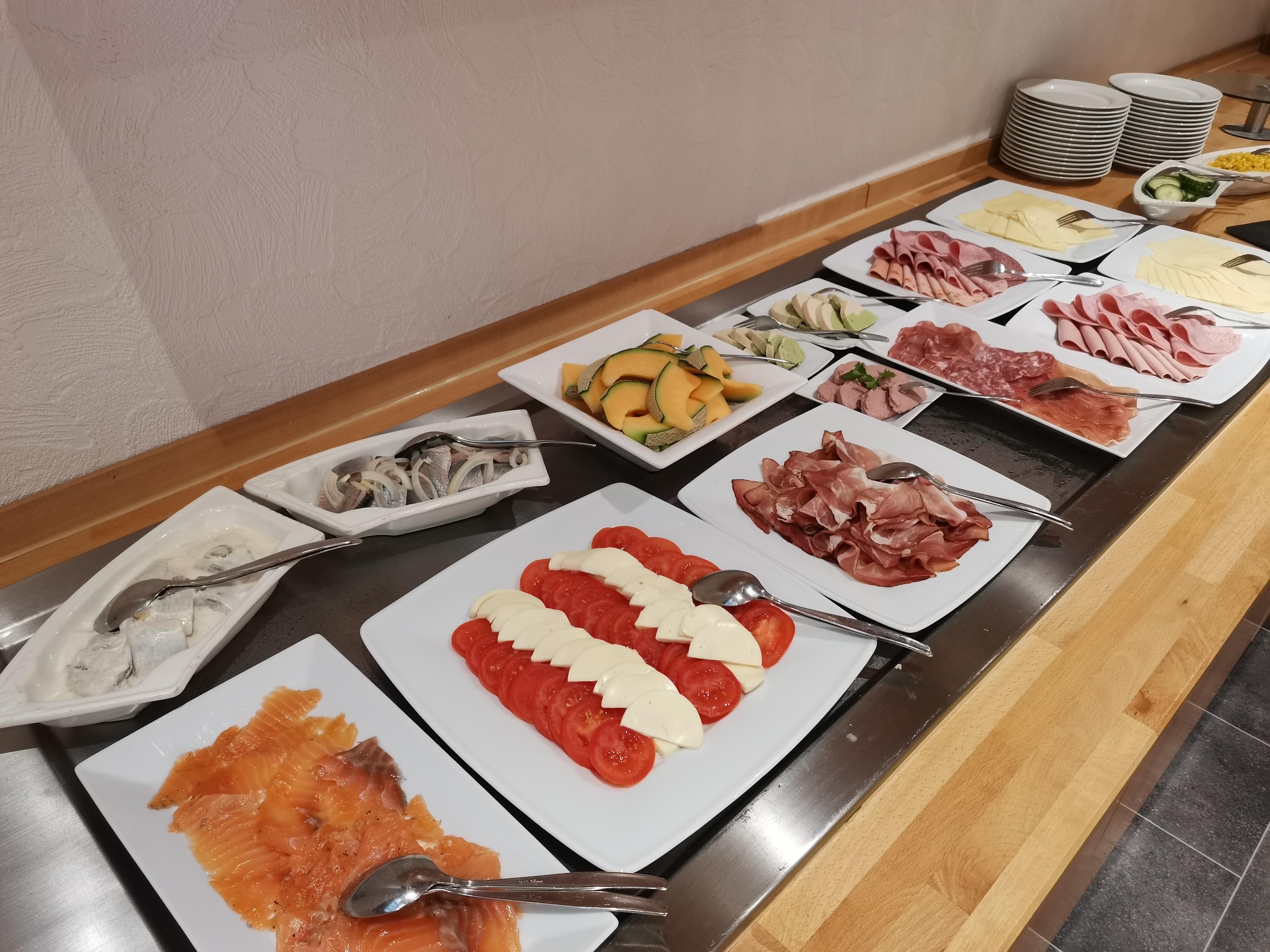 • Ein Buffet mit verschiedenen Häppchen wie Fisch, Aufschnitt und Gemüse. Die Speisen sind auf weißen Platten schön angerichtet.