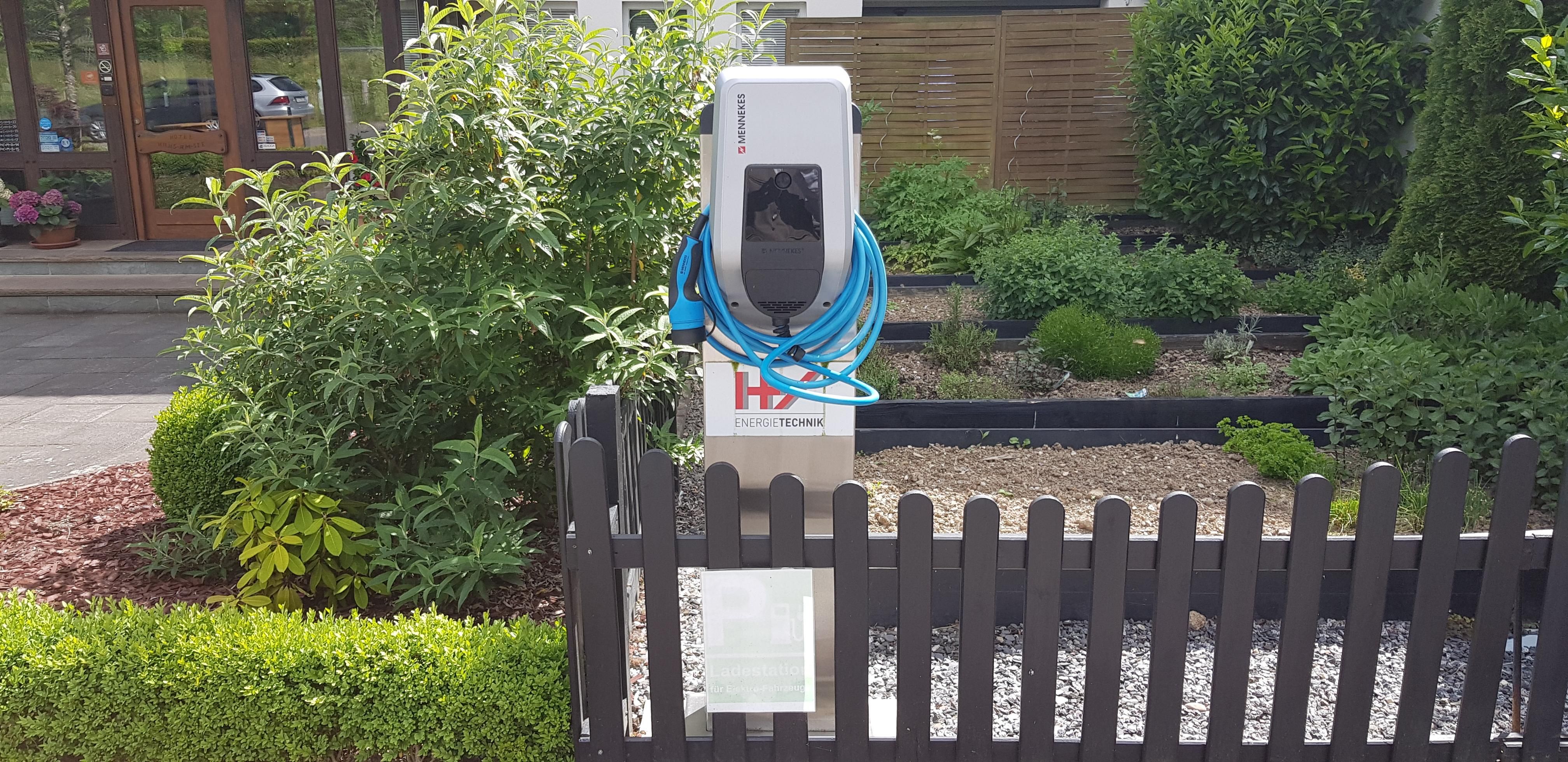 • Eine Ladestation für Elektroautos steht in einem gepflegten Garten. Umgeben von Pflanzen und einem kleinen Zaun bietet sie eine moderne Lösung für nachhaltige Mobilität.