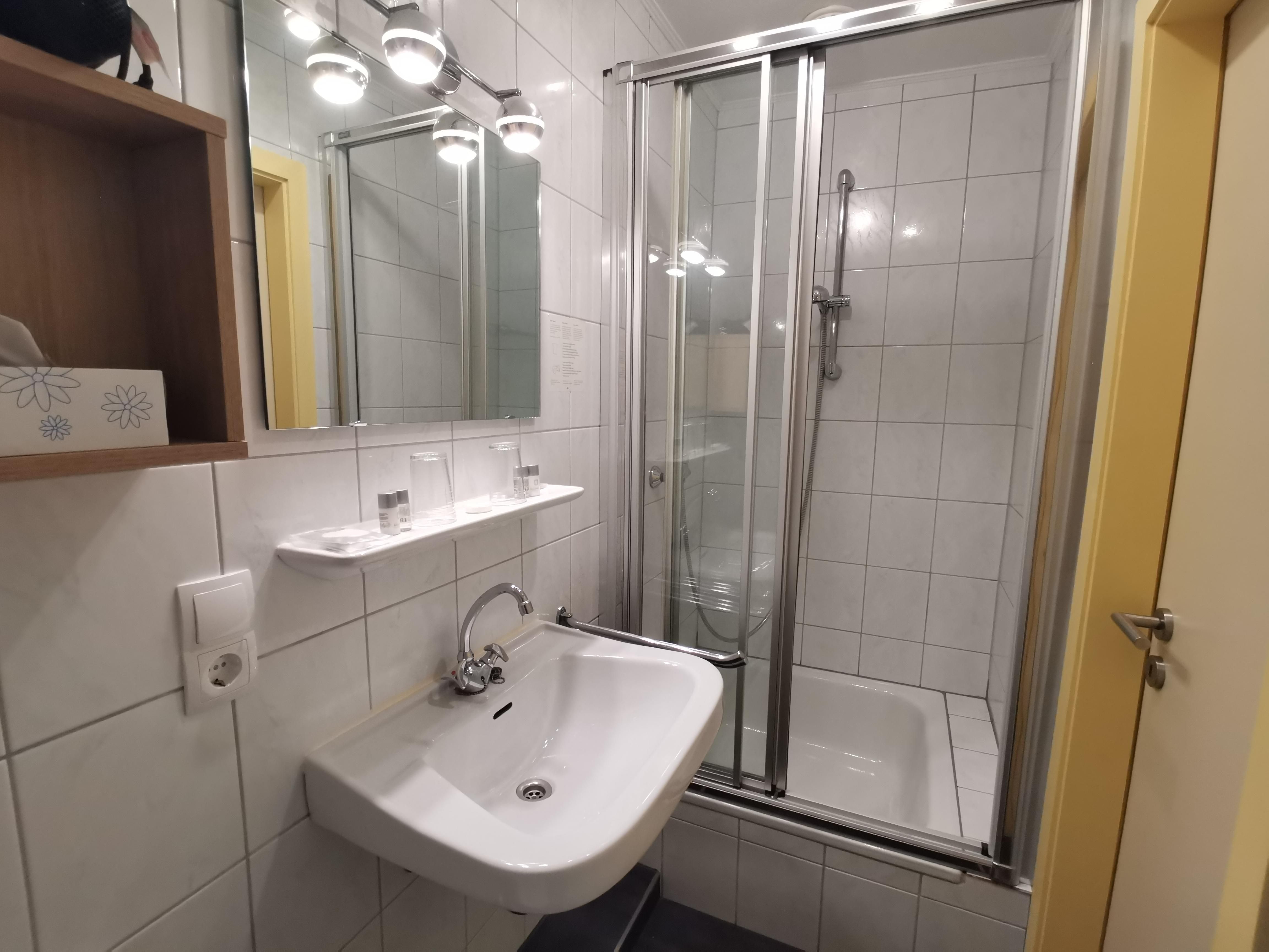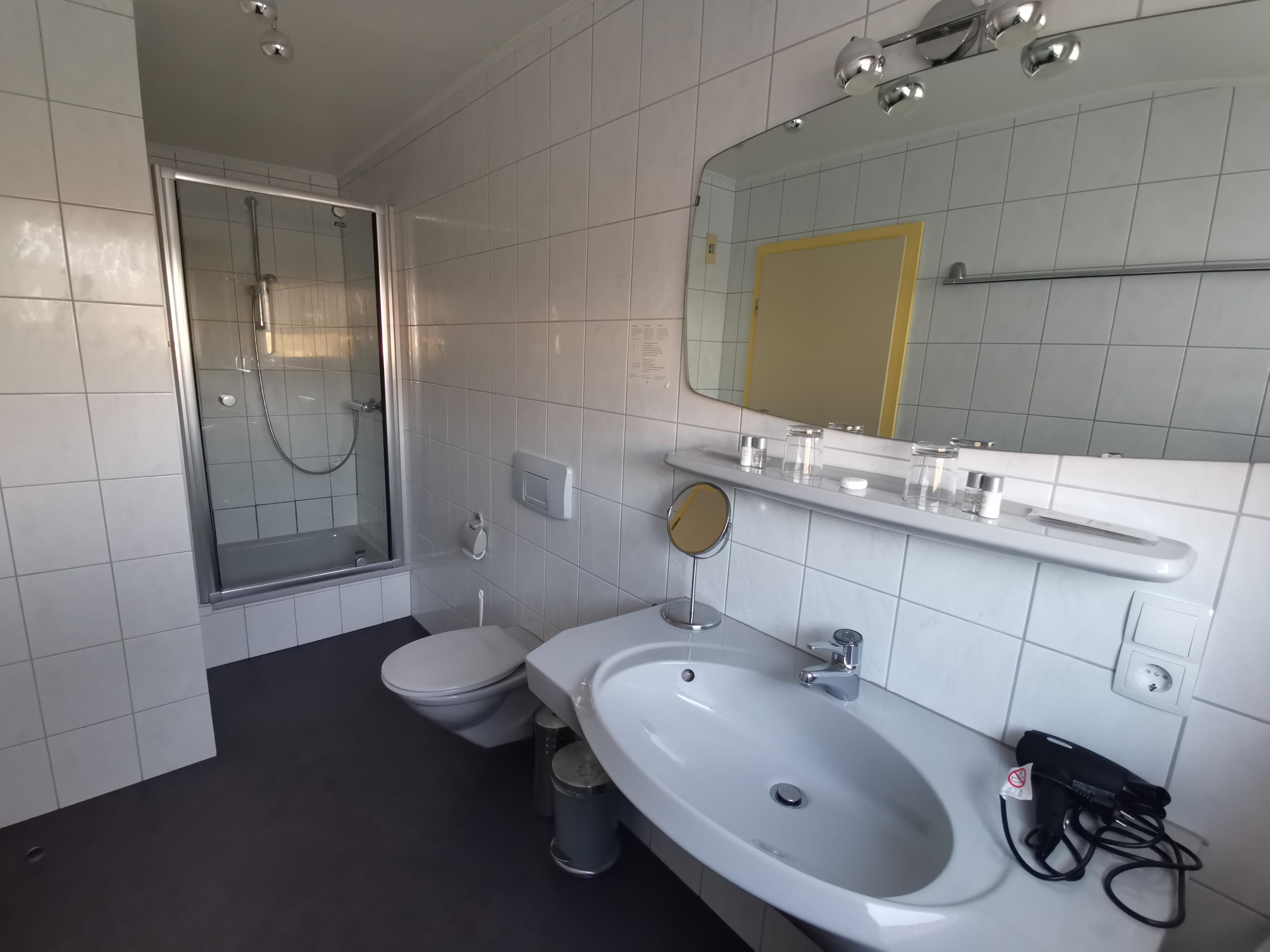 • Ein modernes Badezimmer mit weißen Fliesen. Es gibt eine Dusche, ein Waschbecken und einen großen Spiegel.