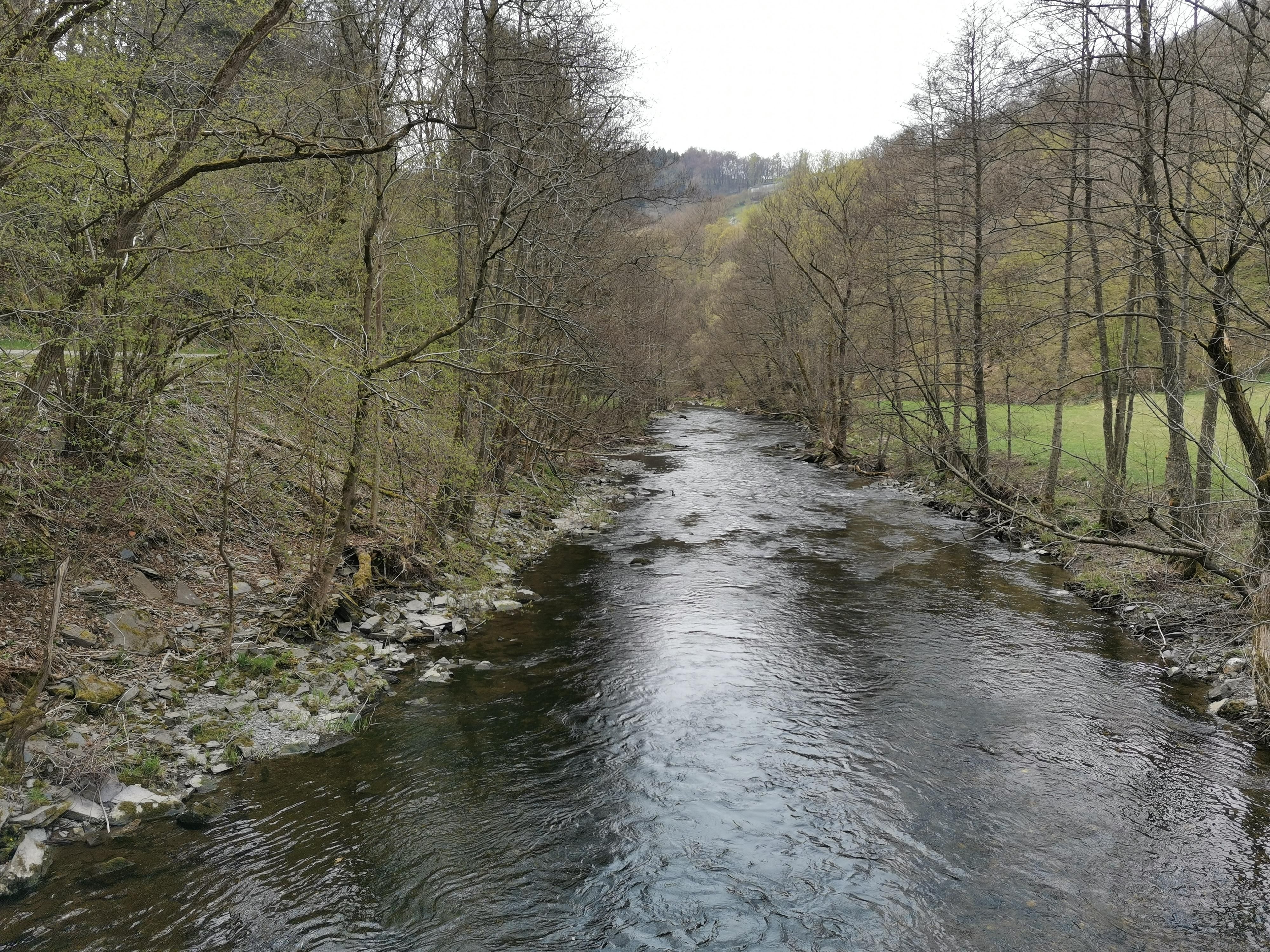 • Ein ruhiger Fluss mit klarem Wasser fließt zwischen Bäumen. Die Umgebung ist grün und natürlich.