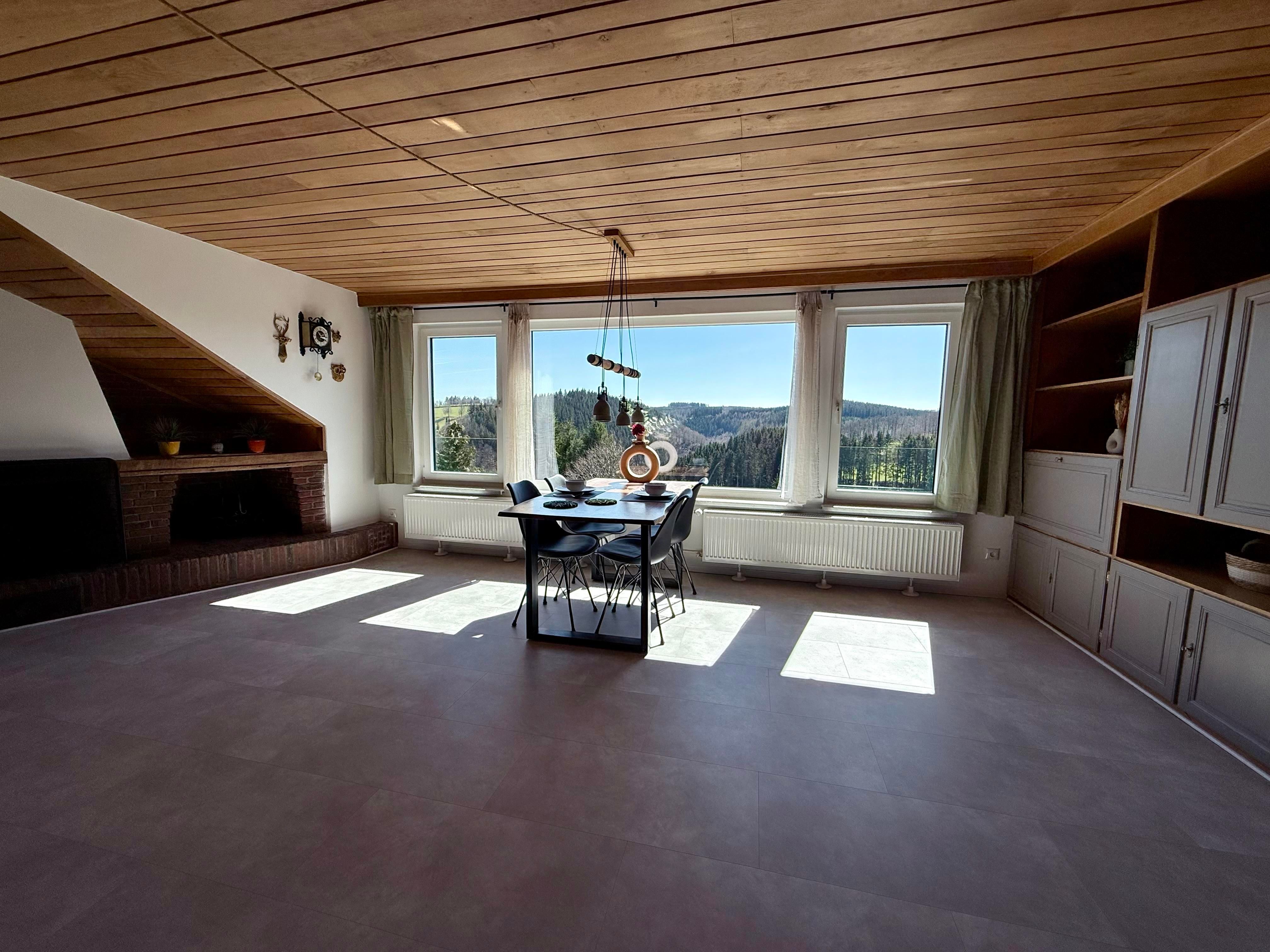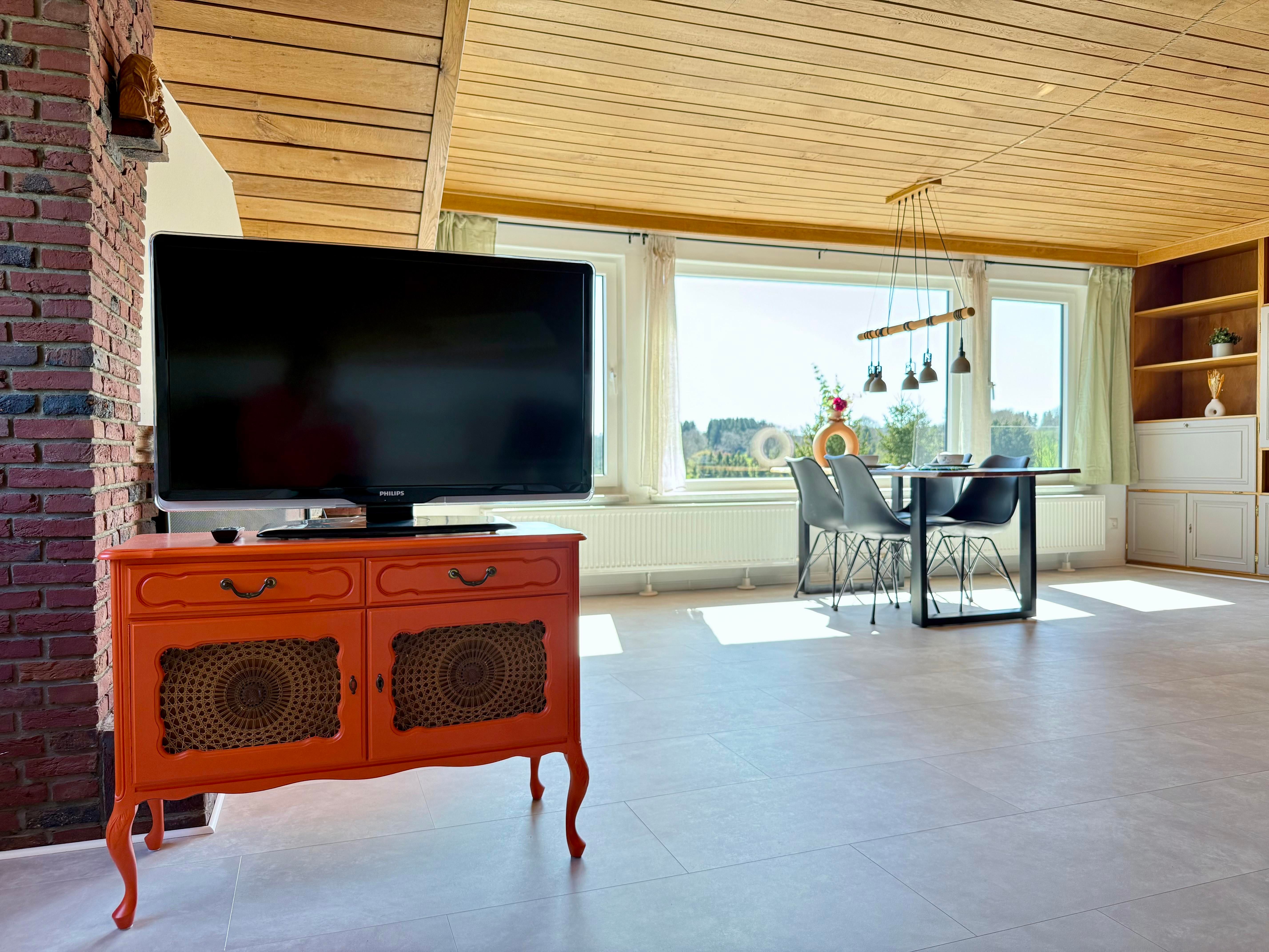 Das geräumige Wohn-/Esszimmer ist mit einem Flachbild-TV ausgestattet und der Deko-Kaminofen im Wohnzimmerbereich sorgt für eine gemütliche Atmosphäre. Vom Essbereich aus genießen Sie einen herrlichen Blick über das Tal von Monschau.