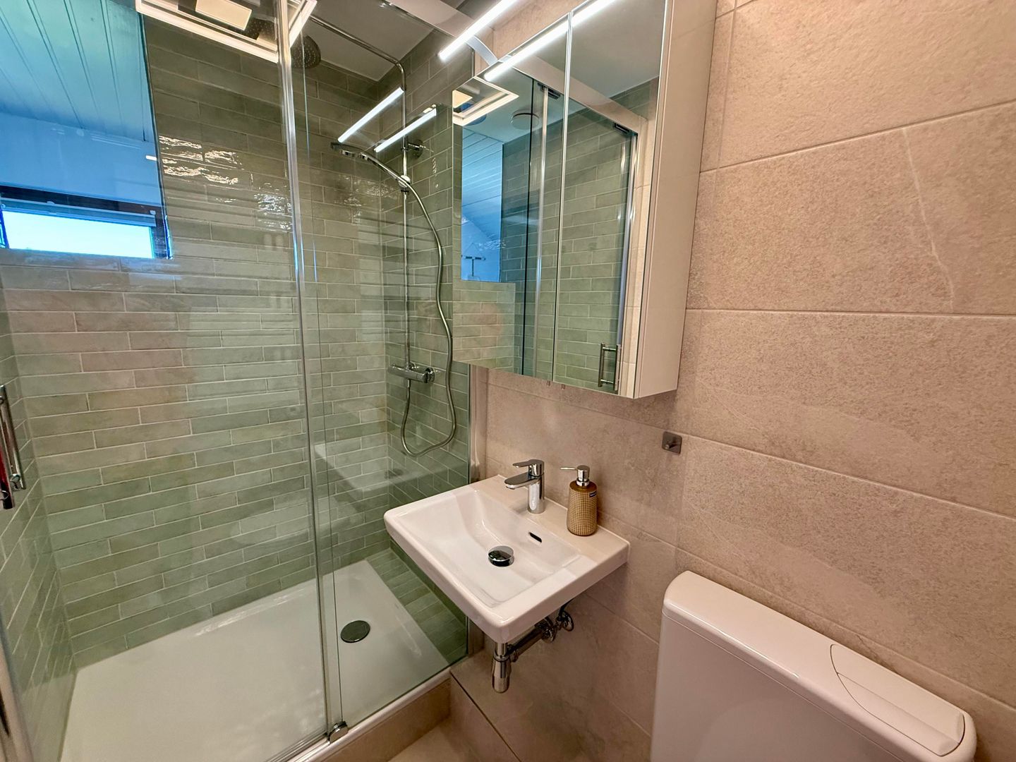 Das moderne Badezimmer verfügt über eine Dusche, ein WC und ein Waschbecken.