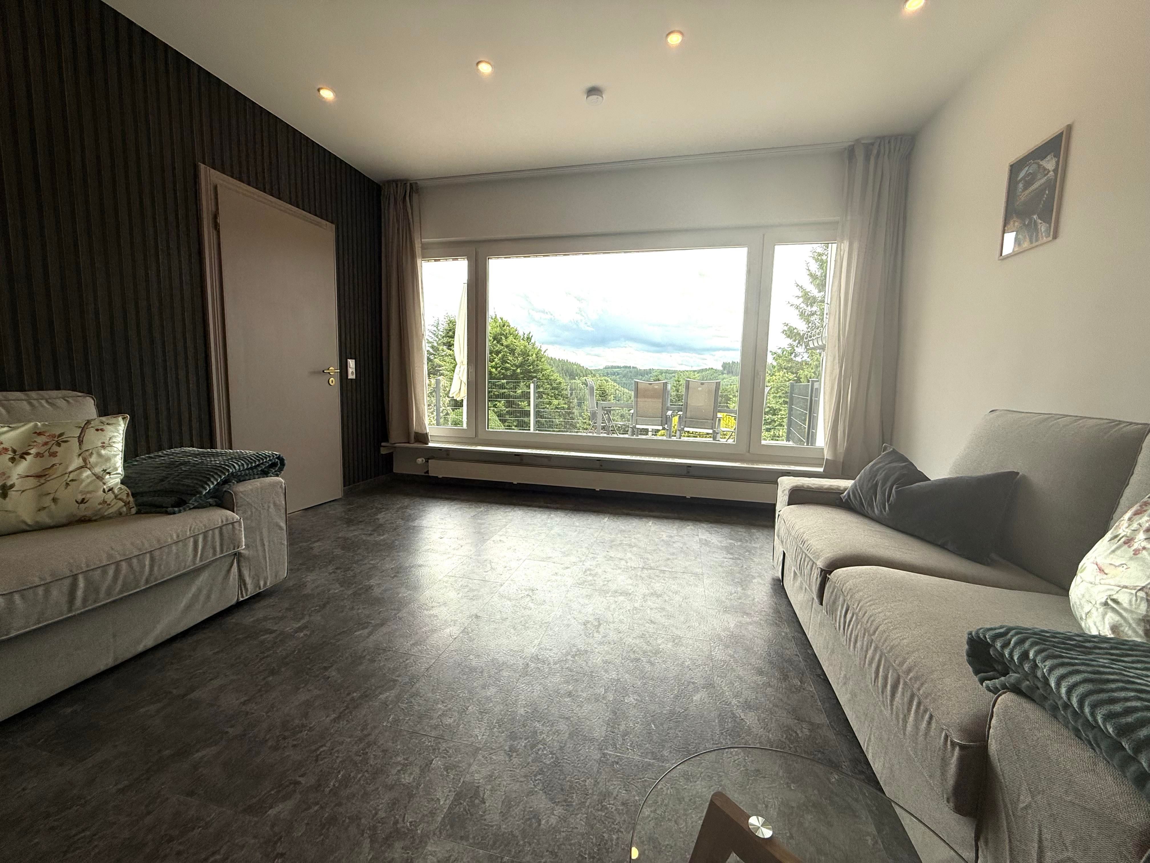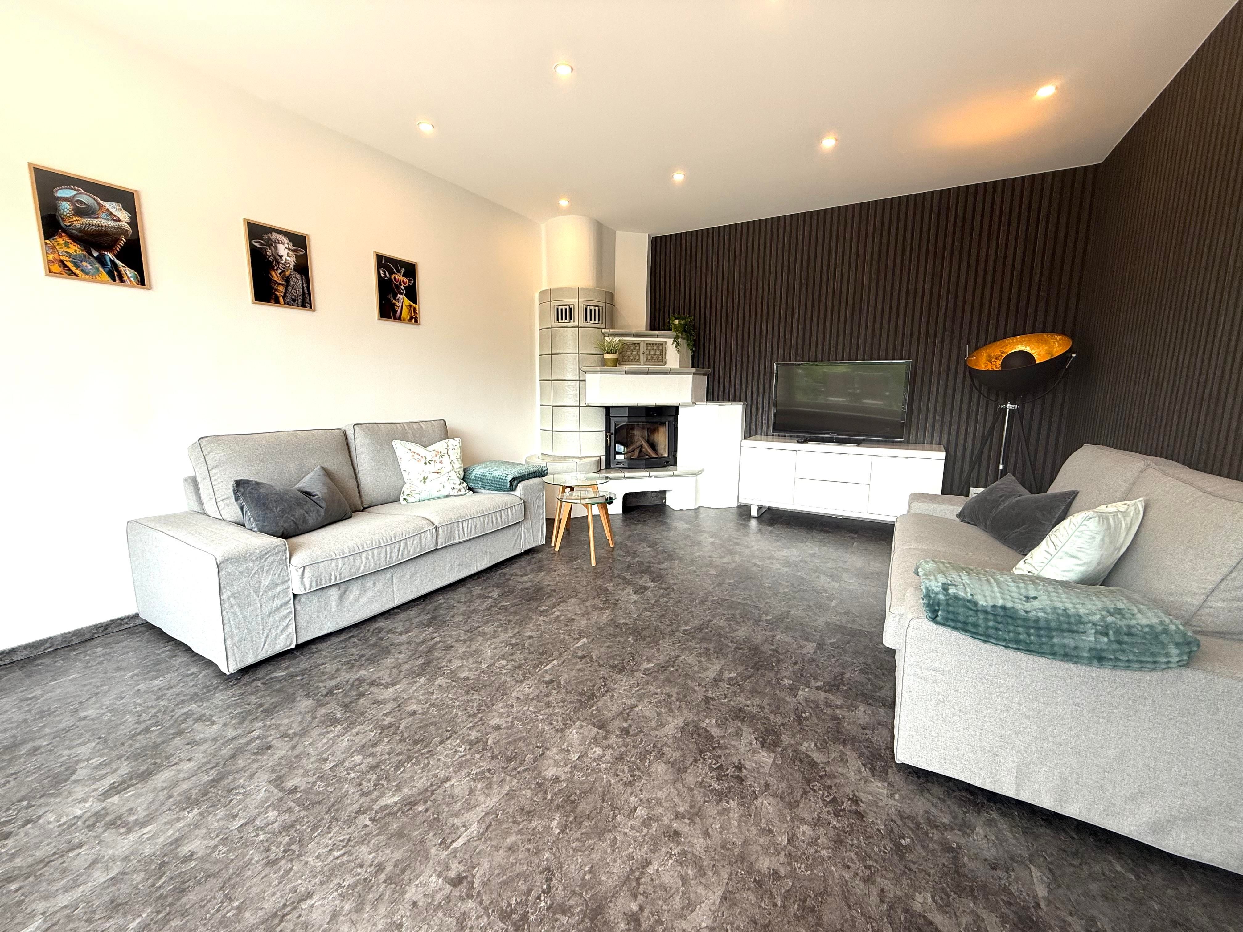 Das gemütliche Wohnzimmer ist mit zwei Sofas, einem Flachbildfernseher und einem Deko-Kachelofen ausgestattet. Hier können Sie entspannte Abende verbringen und den Blick ins Grüne genießen.